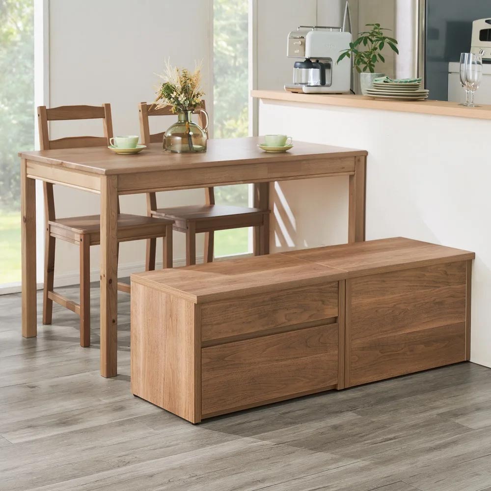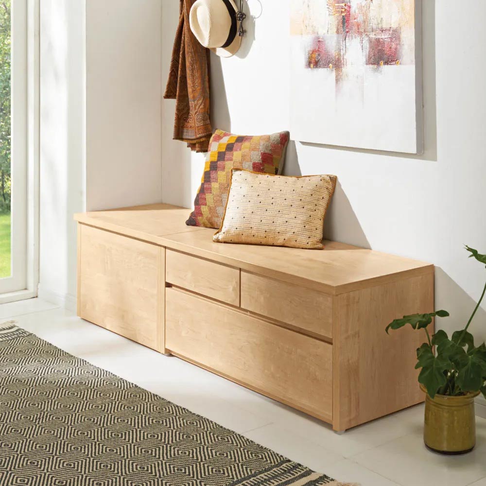 耐荷重100kg!置くだけで、収納と座るスペースが生まれる、便利な収納スツール。収納もたっぷりなので空間にゆとりが生まれます。まるでリフォームしたかのような快適な憩いのスペースをお手軽に手に入れられます。防災グッズ収納としてもオススメです。狭い玄関スペースでも置けちゃう!置くだけで空間にゆとりが生まれます。スペースが狭く限られる玄関まわり。下駄箱に入らない様々なものが玄関周りのごちゃつきを生む悩みの種。一度、玄関収納を見直してみませんか?収納と座るスペースを兼ねられる「収納庫付ベンチ」なら、見た目はすっきり、収納はたっぷり!玄関周りのごちゃつきがすっきり片付きます。本体奥行は41cm。奥行41cmは、狭い玄関にもすっきり設置、たっぷり収納できます。幅は60cmです。玄関の広さに合わせてぴったりサイズをお選びいただけます。「座れる」スペースがあるとこんなにも嬉しい!玄関や部屋の一角に置くだけで、手軽に簡単に憩いのスペースが生まれます。(例1)玄関に置いて、靴を履く玄関ベンチとして。来客時にも重宝します。(例2)リビングの窓辺に置いて、読書する窓辺のくつろぎスペースとして。(例3)部屋のコーナーにL字に設置して、収納&くつろぎスペースとして。(例4)リビングのソファのオットマン代わりとして。(例5)来客時のお客様用のサブチェアや小さなお子さまのデスク代わりにも活躍。「座れる」だけじゃない、収納力もばっちり◎ボックスタイプは、座面のフタを開けると中は大容量の収納スペース。ブランケットやヨガマットなどの長物も収納可能です。引き出しタイプは、よく使う物を入れるのに便利。マスクやシューズケア用品なども、すぐにさっと取り出せます。奥行サイズを合わせれば、ボックスタイプと引き出しタイプの合わせ使いもおすすめです。「おしゃれに収納、防災対策もバッチリ」この収納ベンチなら、デザイン性を損なわずに防災グッズを整頓。余裕を持って懐中電灯、水のペットボトル、非常持ち出し袋も収められます。防災グッズの収納場所は緊急時にすぐ取り出せる収納庫付きベンチがおすすめ。毎日使うものだから、嬉しい機能満載!ベンチの角は丸みがあり、足あたりもやさしく安心です。収納庫、引き出しの内部はすべて内部化粧シート貼りを施しており、収納物にやさしいつくりで、庫内を清潔に保てます。引き出しタイプは全段スライドレール付き。最大まで引出しても引き出しが抜け落ちず安心です。選べるカラーア:天然木調の素材感が美しく、玄関を明るく演出する「ナチュラル」イ:シックな色合いと木目に上質感漂う「ダークブラウン」ウ:無塗装のウォルナットのグレイッシュな風合いを忠実に再現、どんなインテリアにも合わせやすい「ウォルナット」微粒子を練り込んだビーズコート仕上げで、摩擦にも強く、傷も目立ちにくく、より本物に近い手触りや木肌のマットな質感まで丁寧に再現しました。エ:玄関が明るく見えて、壁際に置いてもすっきり馴染む「ホワイト」。フラットな見た目でどんなインテリアにも馴染みます。※(ア)ナチュラル(イ)ダークブラウン(エ)ホワイトは、すり傷や汚れに強いクリーンイーゴス(R)を採用。職人技が光る、安心の日本製熟練の家具職人が、一点一点心をこめて丁寧に仕上げております。長く使うものだから、造りのしっかりした収納家具をお求めください。完成品でお届けするので、届いたらすぐにご使用いただけるのが嬉しいポイントです。(水平調整アジャスターのみ、お客様にてお取り付けをお願いいたします)お引越しや模様替えのタイミングでスペースを便利に有効活用してみませんか?高価な備え付け家具やリフォームよりも、お手頃な価格で新生活を始められます。スキマを利用して効率の良い収納術を実践してください。