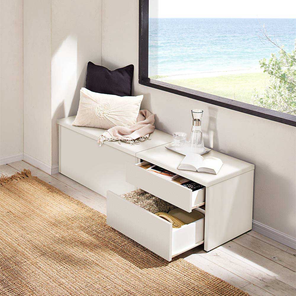 窓辺に置いて、読書する窓辺のくつろぎスペースとして。 ※写真左から別売りの「ボックスタイプ・幅90cm奥行41cm」「引き出しタイプ・幅60cm奥行41cm」です。