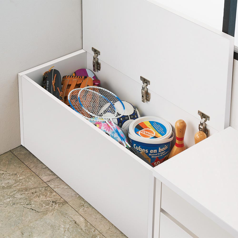 耐荷重100kg!置くだけで、収納と座るスペースが生まれる、便利な収納スツール。収納もたっぷりなので空間にゆとりが生まれます。まるでリフォームしたかのような快適な憩いのスペースをお手軽に手に入れられます。狭い玄関スペースでも置けちゃう!置くだけで空間にゆとりが生まれます。スペースが狭く限られる玄関まわり。下駄箱に入らない様々なものが玄関周りのごちゃつきを生む悩みの種。一度、玄関収納を見直してみませんか?収納と座るスペースを兼ねられる「収納庫付ベンチ」なら、見た目はすっきり、収納はたっぷり!玄関周りのごちゃつきがすっきり片付きます。本体奥行は31cm。奥行31cmは、狭い玄関にも圧迫感なくすっきり設置できます。幅は90cmです。玄関の広さに合わせてぴったりサイズをお選びいただけます。「座れる」スペースがあるとこんなにも嬉しい!玄関や部屋の一角に置くだけで、手軽に簡単に憩いのスペースが生まれます。(例1)玄関に置いて、靴を履く玄関ベンチとして。来客時にも重宝します。(例2)リビングの窓辺に置いて、読書する窓辺のくつろぎスペースとして。(例3)部屋のコーナーにL字に設置して、収納&くつろぎスペースとして。(例4)リビングのソファのオットマン代わりとして。(例5)来客時のお客様用のサブチェアや小さなお子さまのデスク代わりにも活躍。「座れる」だけじゃない、収納力もばっちり◎ボックスタイプは、座面のフタを開けると中は大容量の収納スペース。ブランケットやヨガマットなどの長物も収納可能です。奥行サイズを合わせれば、ボックスタイプと別売りの引出タイプの合わせ使いもおすすめです。毎日使うものだから、嬉しい機能満載!ベンチの角は丸みがあり、足あたりもやさしく安心です。収納庫、引出の内部はすべて内部化粧シート貼りを施しており、収納物にやさしいつくりで、庫内を清潔に保てます。引出タイプは全段スライドレール引出。最大まで引出しても引出しが抜け落ちず安心です。ボックス収納タイプは、ダンパーを使用しているので、扉ゆっくりと閉まる安心仕様です。職人技が光る、安心の日本製熟練の家具職人が、一点一点心をこめて丁寧に仕上げております。長く使うものだから、造りのしっかりした収納家具をお求めください。完成品でお届けするので、届いたらすぐにご使用いただけるのが嬉しいポイントです。(水平調整アジャスターのみ、お客様にてお取り付けをお願いいたします)お引越しや模様替えのタイミングでスペースを便利に有効活用してみませんか?高価な備え付け家具やリフォームよりも、お手頃な価格で新生活を始められます。スキマを利用して効率の良い収納術を実践してください。