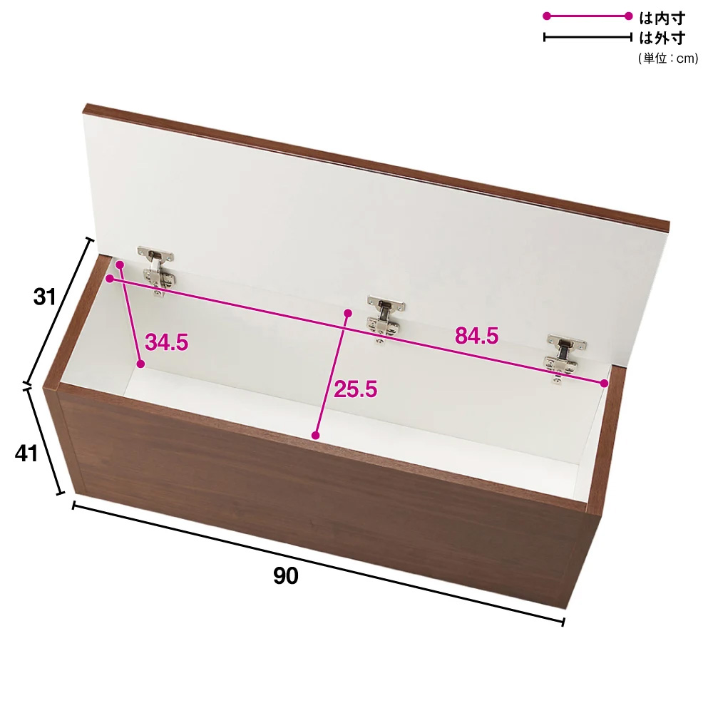 耐荷重100kg!置くだけで、収納と座るスペースが生まれる、便利な収納スツール。収納もたっぷりなので空間にゆとりが生まれます。まるでリフォームしたかのような快適な憩いのスペースをお手軽に手に入れられます。防災グッズ収納としてもオススメです。狭い玄関スペースでも置けちゃう!置くだけで空間にゆとりが生まれます。スペースが狭く限られる玄関まわり。下駄箱に入らない様々なものが玄関周りのごちゃつきを生む悩みの種。一度、玄関収納を見直してみませんか?収納と座るスペースを兼ねられる「収納庫付ベンチ」なら、見た目はすっきり、収納はたっぷり!玄関周りのごちゃつきがすっきり片付きます。本体奥行は31cm。奥行31cmは、狭い玄関にも圧迫感なくすっきり設置できます。幅は90cmです。玄関の広さに合わせてぴったりサイズをお選びいただけます。「座れる」スペースがあるとこんなにも嬉しい!玄関や部屋の一角に置くだけで、手軽に簡単に憩いのスペースが生まれます。(例1)玄関に置いて、靴を履く玄関ベンチとして。来客時にも重宝します。(例2)リビングの窓辺に置いて、読書する窓辺のくつろぎスペースとして。(例3)部屋のコーナーにL字に設置して、収納&くつろぎスペースとして。(例4)リビングのソファのオットマン代わりとして。(例5)来客時のお客様用のサブチェアや小さなお子さまのデスク代わりにも活躍。「座れる」だけじゃない、収納力もばっちり◎ボックスタイプは、座面のフタを開けると中は大容量の収納スペース。ブランケットやヨガマットなどの長物も収納可能です。引き出しタイプは、よく使う物を入れるのに便利。マスクやシューズケア用品なども、すぐにさっと取り出せます。奥行サイズを合わせれば、ボックスタイプと引き出しタイプの合わせ使いもおすすめです。「おしゃれに収納、防災対策もバッチリ」この収納ベンチなら、デザイン性を損なわずに防災グッズを整頓。余裕を持って懐中電灯、水のペットボトル、非常持ち出し袋も収められます。防災グッズの収納場所は緊急時にすぐ取り出せる収納庫付きベンチがおすすめ。毎日使うものだから、嬉しい機能満載!ベンチの角は丸みがあり、足あたりもやさしく安心です。収納庫、引き出しの内部はすべて内部化粧シート貼りを施しており、収納物にやさしいつくりで、庫内を清潔に保てます。引き出しタイプは全段スライドレール付き。最大まで引出しても引き出しが抜け落ちず安心です。選べるカラーア:天然木調の素材感が美しく、玄関を明るく演出する「ナチュラル」イ:シックな色合いと木目に上質感漂う「ダークブラウン」ウ:無塗装のウォルナットのグレイッシュな風合いを忠実に再現、どんなインテリアにも合わせやすい「ウォルナット」微粒子を練り込んだビーズコート仕上げで、摩擦にも強く、傷も目立ちにくく、より本物に近い手触りや木肌のマットな質感まで丁寧に再現しました。エ:玄関が明るく見えて、壁際に置いてもすっきり馴染む「ホワイト」。フラットな見た目でどんなインテリアにも馴染みます。※(ア)ナチュラル(イ)ダークブラウン(エ)ホワイトは、すり傷や汚れに強いクリーンイーゴス(R)を採用。職人技が光る、安心の日本製熟練の家具職人が、一点一点心をこめて丁寧に仕上げております。長く使うものだから、造りのしっかりした収納家具をお求めください。完成品でお届けするので、届いたらすぐにご使用いただけるのが嬉しいポイントです。(水平調整アジャスターのみ、お客様にてお取り付けをお願いいたします)お引越しや模様替えのタイミングでスペースを便利に有効活用してみませんか?高価な備え付け家具やリフォームよりも、お手頃な価格で新生活を始められます。スキマを利用して効率の良い収納術を実践してください。