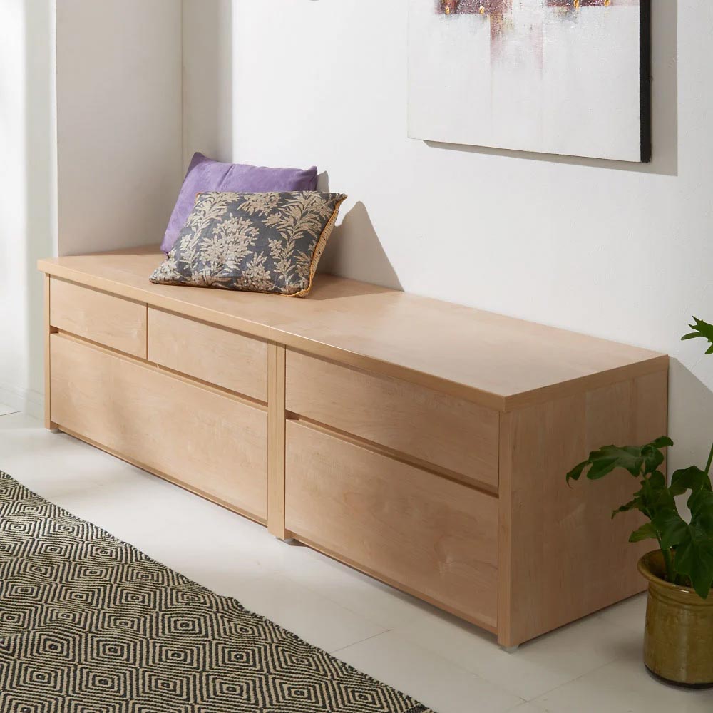 耐荷重100kg!置くだけで、収納と座るスペースが生まれる、便利な収納スツール。収納もたっぷりなので空間にゆとりが生まれます。まるでリフォームしたかのような快適な憩いのスペースをお手軽に手に入れられます。防災グッズ収納としてもオススメです。狭い玄関スペースでも置けちゃう!置くだけで空間にゆとりが生まれます。スペースが狭く限られる玄関まわり。下駄箱に入らない様々なものが玄関周りのごちゃつきを生む悩みの種。一度、玄関収納を見直してみませんか?収納と座るスペースを兼ねられる「収納庫付ベンチ」なら、見た目はすっきり、収納はたっぷり!玄関周りのごちゃつきがすっきり片付きます。本体奥行は41cm。奥行41cmは、狭い玄関にもすっきり設置、たっぷり収納できます。幅は60cmです。玄関の広さに合わせてぴったりサイズをお選びいただけます。「座れる」スペースがあるとこんなにも嬉しい!玄関や部屋の一角に置くだけで、手軽に簡単に憩いのスペースが生まれます。(例1)玄関に置いて、靴を履く玄関ベンチとして。来客時にも重宝します。(例2)リビングの窓辺に置いて、読書する窓辺のくつろぎスペースとして。(例3)部屋のコーナーにL字に設置して、収納&くつろぎスペースとして。(例4)リビングのソファのオットマン代わりとして。(例5)来客時のお客様用のサブチェアや小さなお子さまのデスク代わりにも活躍。「座れる」だけじゃない、収納力もばっちり◎ボックスタイプは、座面のフタを開けると中は大容量の収納スペース。ブランケットやヨガマットなどの長物も収納可能です。引き出しタイプは、よく使う物を入れるのに便利。マスクやシューズケア用品なども、すぐにさっと取り出せます。奥行サイズを合わせれば、ボックスタイプと引き出しタイプの合わせ使いもおすすめです。「おしゃれに収納、防災対策もバッチリ」この収納ベンチなら、デザイン性を損なわずに防災グッズを整頓。余裕を持って懐中電灯、水のペットボトル、非常持ち出し袋も収められます。防災グッズの収納場所は緊急時にすぐ取り出せる収納庫付きベンチがおすすめ。毎日使うものだから、嬉しい機能満載!ベンチの角は丸みがあり、足あたりもやさしく安心です。収納庫、引き出しの内部はすべて内部化粧シート貼りを施しており、収納物にやさしいつくりで、庫内を清潔に保てます。引き出しタイプは全段スライドレール付き。最大まで引出しても引き出しが抜け落ちず安心です。選べるカラーア:天然木調の素材感が美しく、玄関を明るく演出する「ナチュラル」イ:シックな色合いと木目に上質感漂う「ダークブラウン」ウ:無塗装のウォルナットのグレイッシュな風合いを忠実に再現、どんなインテリアにも合わせやすい「ウォルナット」微粒子を練り込んだビーズコート仕上げで、摩擦にも強く、傷も目立ちにくく、より本物に近い手触りや木肌のマットな質感まで丁寧に再現しました。エ:玄関が明るく見えて、壁際に置いてもすっきり馴染む「ホワイト」。フラットな見た目でどんなインテリアにも馴染みます。※(ア)ナチュラル(イ)ダークブラウン(エ)ホワイトは、すり傷や汚れに強いクリーンイーゴス(R)を採用。職人技が光る、安心の日本製熟練の家具職人が、一点一点心をこめて丁寧に仕上げております。長く使うものだから、造りのしっかりした収納家具をお求めください。完成品でお届けするので、届いたらすぐにご使用いただけるのが嬉しいポイントです。(水平調整アジャスターのみ、お客様にてお取り付けをお願いいたします)お引越しや模様替えのタイミングでスペースを便利に有効活用してみませんか?高価な備え付け家具やリフォームよりも、お手頃な価格で新生活を始められます。スキマを利用して効率の良い収納術を実践してください。
