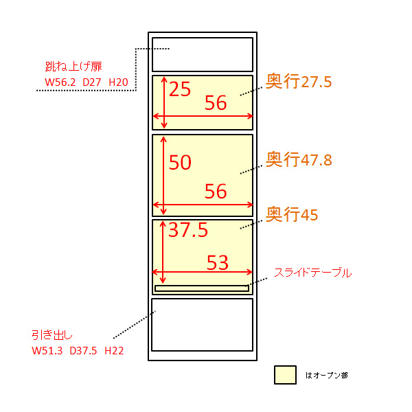 扉は上に持ち上げて開くタイプ。大きく開いて物の出し入れもしやすく楽々。