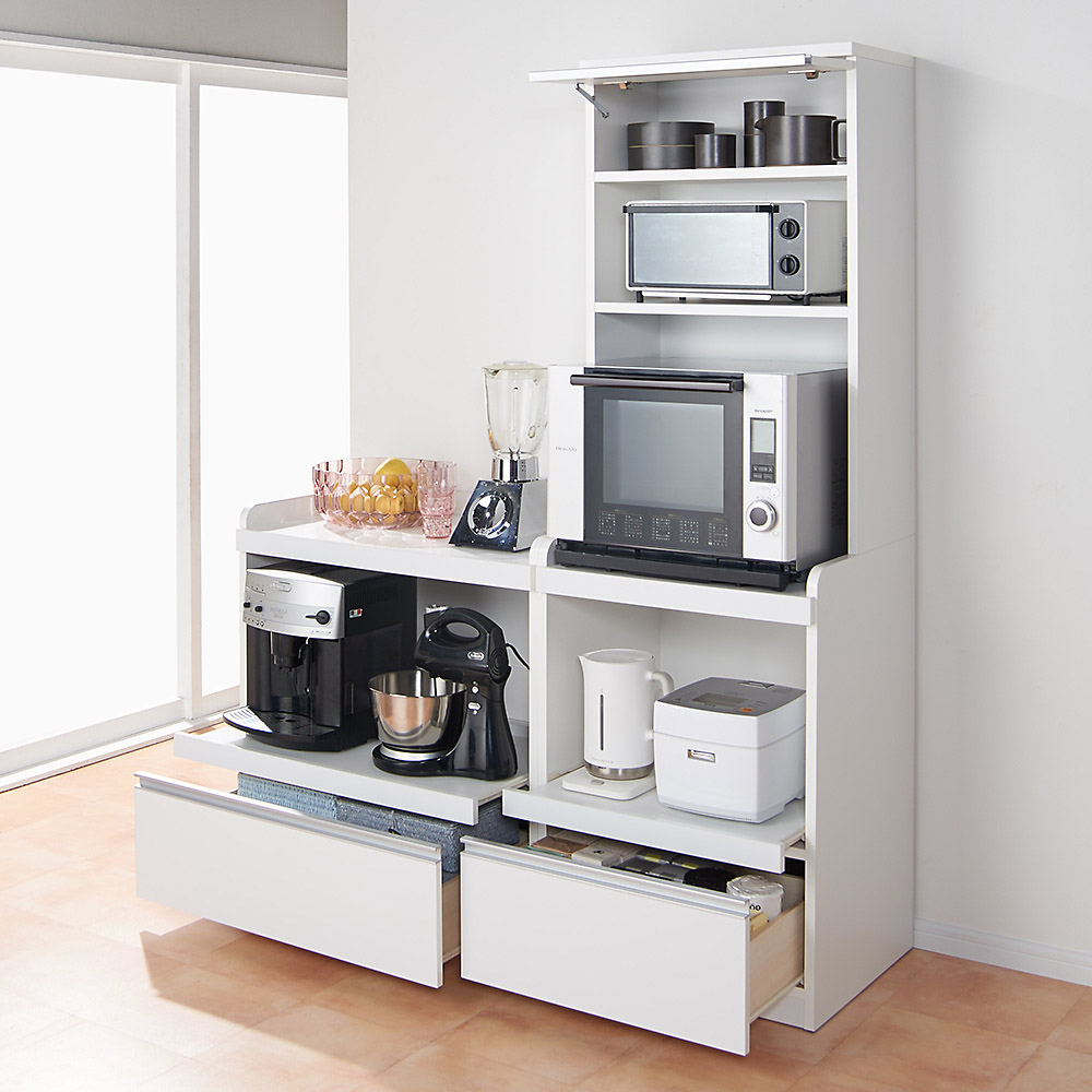 大型レンジがラクラク収納可能な奥行50cmのゆとりサイズのレンジボード。家電収納として余裕のあるスペースで使いやすく並べられます。合計4つのコンセントやスライドテーブルなど、調理家電の収納と使いやすさに配慮しました。奥行50cmのゆとりサイズで、大型レンジが主役のキッチンに。◆本体奥行き50cmなので大型レンジをラクラク収納可能な食器棚です。◆余裕のあるスペースで必要な家電を使いやすく並べられるカップボードです。◆狭いキッチンでもキッチン家電、キッチン用品をまとめてコンパクトに収納が可能です。家電が使いやすいこだわり設計のレンジ台◆定位置が必要なキッチン家電収納のために、コンセントつきのオープン家電台を装備。◆レンジ、トースター、炊飯器、ホットプレートなどキッチン家電は全てこれ1台にまとめて収納できます。たっぷりな収納力で、家事をサポートするアイデア収納◆引き出しは滑らかに開閉するスライドレールつき。◆買い置きを保管するキッチンストッカー・食品ストッカーの代わりにも。◆収納力を重視し、キッチンラック・キッチン収納庫を置けないご家庭でも使いやすく設計。水に強い素材選びで、おしゃれでストレスフリーなキッチンに。◆キッチンボードの前面は美しさと機能性を兼ね備えたポリエステル化粧合板。◆清潔感のある美しい見た目はもちろん、汚してもふき取り掃除の簡単な魅力的な素材です安心と信頼の国内生産品のキッチンカウンター◆熟練の家具職人がひとつずつ丁寧に仕上げたワンランク上の家電ラック・レンジラックです。◆細部の丁寧な仕上がりなど、国産品ならではの高品質なキッチン収納棚・ダイニングボードを台所に置いてお楽しみください。