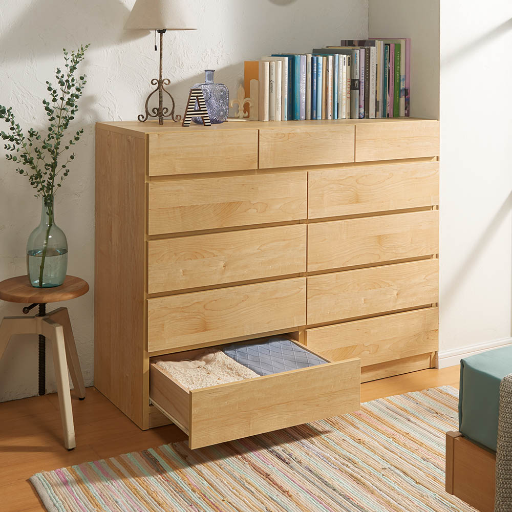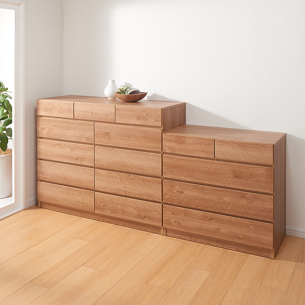 天板耐荷重50kgを実現!テレビも置ける、頑丈ワイドなパワフル収納。これ一台で、衣類から家電まで一か所にまとまる万能な収納力を誇ります。日本製ならではの丁寧な仕上げが光る収納家具を、お手頃価格で実現しました。重いものを載せてもOK!耐荷重50kgと頼れる強度!天板内部を強度がアップするハニカム(ハチの巣状の補強)構造にする事で、耐荷重約50kgが実現しました。テレビ等の家電類や、重たい荷物を載せても安心の頑丈さ。リビング収納、寝室、ダイニング、クローゼット収納と、置き場所を選ばずマルチに使えるチェストです。部屋や収納量に応じて選べる豊富なシリーズ展開幅は80cm、120cm、ワイドな140cmの3タイプ。高さは4段(高さ75.5cm)、5段(93.5cm)の2タイプからお選びいただけます。(詳しくは、下のシリーズ商品一覧をご確認ください)小引き出しには、下着類や雑貨類などこまごましたものの収納に最適。大引き出しには、たたみものの衣類もたっぷり収納できて便利。出し入れスムーズで使いやすい引き出し仕様引き出しはストッパー付きスライドレール仕様(小引出は除く)。たくさん衣類を収納しても引き出し開閉がスムーズにできます。ラフな素材感が心地よい北欧デザイン表面材には、まるでカフェのような素材感が美しいオーク調の木目シートを採用。落ちつきと味わい深さのある(ア)ブラウンと明るく開放感のある空間を演出する(イ)ナチュラルからお選びいただけます。丁寧な仕上げが光る、安心の国産家具日本の熟練の家具職人が、一点一点丁寧に仕上げております。長く使うものだから、細やかな製品精度にこだわってください。完成品でお届けするので、組み立て不要。届いたらすぐに使えるのが嬉しいポイントです。
