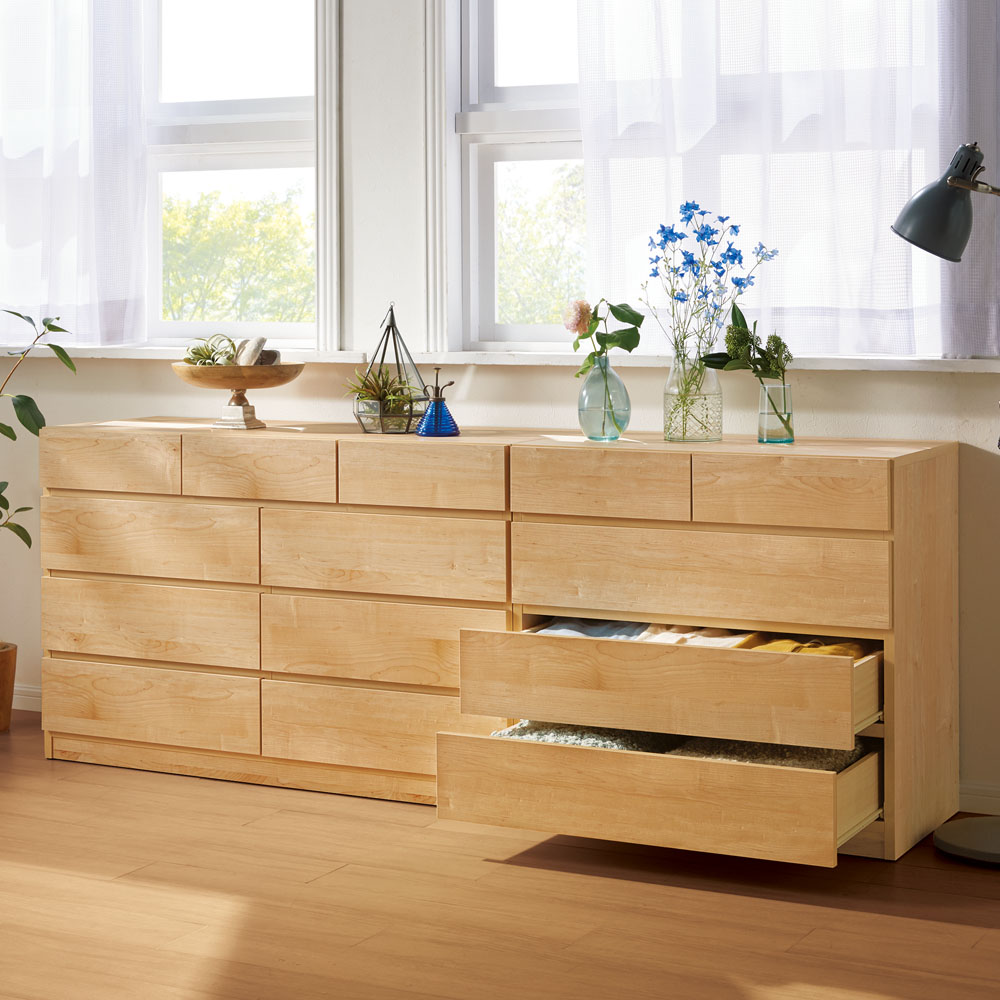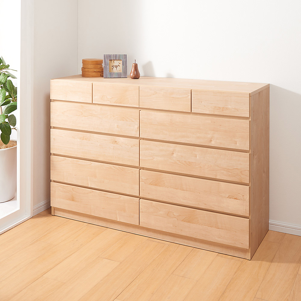 天板耐荷重50kgを実現!テレビも置ける、頑丈ワイドなパワフル収納。これ一台で、衣類から家電まで一か所にまとまる万能な収納力を誇ります。日本製ならではの丁寧な仕上げが光る収納家具を、お手頃価格で実現しました。重いものを載せてもOK!耐荷重50kgと頼れる強度!天板内部を強度がアップするハニカム(ハチの巣状の補強)構造にする事で、耐荷重約50kgが実現しました。テレビ等の家電類や、重たい荷物を載せても安心の頑丈さ。リビング収納、寝室、ダイニング、クローゼット収納と、置き場所を選ばずマルチに使えるチェストです。部屋や収納量に応じて選べる豊富なシリーズ展開幅は80cm、120cm、ワイドな140cmの3タイプ。高さは4段(高さ75.5cm)、5段(93.5cm)の2タイプからお選びいただけます。(詳しくは、下のシリーズ商品一覧をご確認ください)小引き出しには、下着類や雑貨類などこまごましたものの収納に最適。大引き出しには、たたみものの衣類もたっぷり収納できて便利。出し入れスムーズで使いやすい引き出し仕様引き出しはストッパー付きスライドレール仕様(小引出は除く)。たくさん衣類を収納しても引き出し開閉がスムーズにできます。ラフな素材感が心地よい北欧デザイン表面材には、まるでカフェのような素材感が美しいオーク調の木目シートを採用。落ちつきと味わい深さのある(ア)ブラウンと明るく開放感のある空間を演出する(イ)ナチュラルからお選びいただけます。丁寧な仕上げが光る、安心の国産家具日本の熟練の家具職人が、一点一点丁寧に仕上げております。長く使うものだから、細やかな製品精度にこだわってください。完成品でお届けするので、組み立て不要。届いたらすぐに使えるのが嬉しいポイントです。