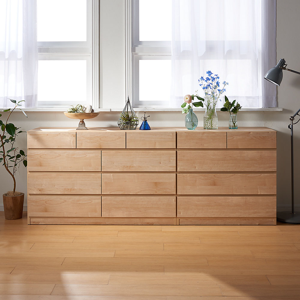 天板耐荷重50kgを実現!テレビも置ける、頑丈ワイドなパワフル収納。これ一台で、衣類から家電まで一か所にまとまる万能な収納力を誇ります。日本製ならではの丁寧な仕上げが光る収納家具を、お手頃価格で実現しました。重いものを載せてもOK!耐荷重50kgと頼れる強度!天板内部を強度がアップするハニカム(ハチの巣状の補強)構造にする事で、耐荷重約50kgが実現しました。テレビ等の家電類や、重たい荷物を載せても安心の頑丈さ。リビング収納、寝室、ダイニング、クローゼット収納と、置き場所を選ばずマルチに使えるチェストです。部屋や収納量に応じて選べる豊富なシリーズ展開幅は80cm、120cm、ワイドな140cmの3タイプ。高さは4段(高さ75.5cm)、5段(93.5cm)の2タイプからお選びいただけます。(詳しくは、下のシリーズ商品一覧をご確認ください)小引き出しには、下着類や雑貨類などこまごましたものの収納に最適。大引き出しには、たたみものの衣類もたっぷり収納できて便利。出し入れスムーズで使いやすい引き出し仕様引き出しはストッパー付きスライドレール仕様(小引出は除く)。たくさん衣類を収納しても引き出し開閉がスムーズにできます。ラフな素材感が心地よい北欧デザイン表面材には、まるでカフェのような素材感が美しいオーク調の木目シートを採用。落ちつきと味わい深さのある(ア)ブラウンと明るく開放感のある空間を演出する(イ)ナチュラルからお選びいただけます。丁寧な仕上げが光る、安心の国産家具日本の熟練の家具職人が、一点一点丁寧に仕上げております。長く使うものだから、細やかな製品精度にこだわってください。完成品でお届けするので、組み立て不要。届いたらすぐに使えるのが嬉しいポイントです。