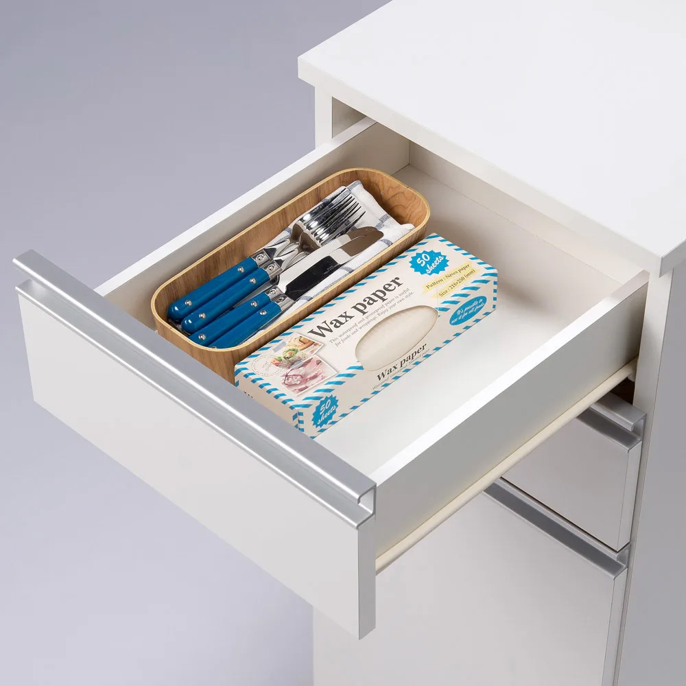 中段のレール付き引き出しは、食材ストックや調理小物の収納など多彩に使えます。