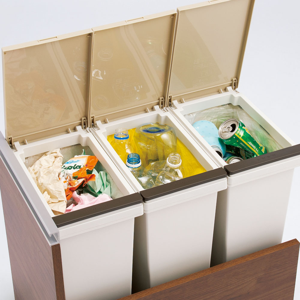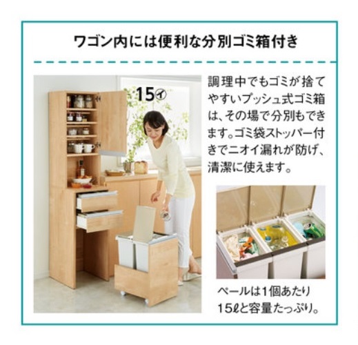 シンクやカウンター横のスペースをフル活用!ワゴンタイプで移動カンタン&隠せる大容量ゴミ箱付きのキッチン収納庫です。引き出し、作業台、ダストボックス、欲しい機能を1台にまとめました。使用例:ダークブラウン 2分別ロータイプ(お届け商品は「3分別ロータイプ」)収納・作業台・ゴミ箱がコレひとつにキッチンで必要な3つの機能をこの一台にまとめました。収納便利な引き出し、料理の盛り付け、一時置き場としても大活躍の作業台、さらに大容量のゴミ箱付き。シンクとカウンターの間や、冷蔵庫の隣のスペースなどの隙間に置いて、キッチンでの作業をスムーズに。左:ダークブラウン2分別ロータイプ、右:ナチュラル3分別ハイタイプ高さは2タイプ作業台としても使いやすい「ロータイプ(高さ85cm)」、収納棚付きの「ハイタイプ(高さ170cm)」の2サイズをご用意。※お届けは「3分別ロータイプ」です。左:2分別タイプ、右:3分別タイプワゴンの中には分別ゴミ箱付き下部のワゴン内部には、その場で分別できるゴミ箱付き。調理中でもゴミが捨てやすいプッシュ式です。ゴミ袋ストッパー付きでニオイ漏れが防げます。さらに、ワゴンから取り外して洗うこともできるので清潔に使えます。「2分別タイプ(奥行45cm)」「3分別タイプ(奥行61cm)」からお選びください。使用例:ナチュラル 2分別ハイタイプキッチンでの作業がスムーズに引き出しから取り出し作業して、不要なものはゴミ箱へ。キッチンまわりでの作業が一か所で完結します。生活動線の妨げを少なくするために考えられた、使い勝手の良い収納庫です。小物収納に便利な引き出し食材ストックや、調理小物の収納などに便利な引き出し付き。引き出しはスライドレール式急な落下を防いでくれるので、安心してお使いいただけます。移動ラクラク!キャスター付きワゴン簡単に移動できるから、使い場所に合わせて便利な位置で使えます。調理中に近くまでワゴンを移動させて、出たゴミをそのまま分別することも。15Lの大容量ゴミ箱ペール容量は1個あたり15Lの大容量。ペールは取り外して洗えます。左から:ホワイト 3分別ハイタイプ、ナチュラル 2分別ハイタイプ、ダークブラウン 2分別ロータイプキッチンに調和する3つのカラー清潔感を感じさせるホワイト、自然な素材感が美しいナチュラル、モダンなデザインのダークブラウンからお選びください。汚れやすり傷による劣化・変色に強いハードコート紙を使用しています。国産ならではの品質です。