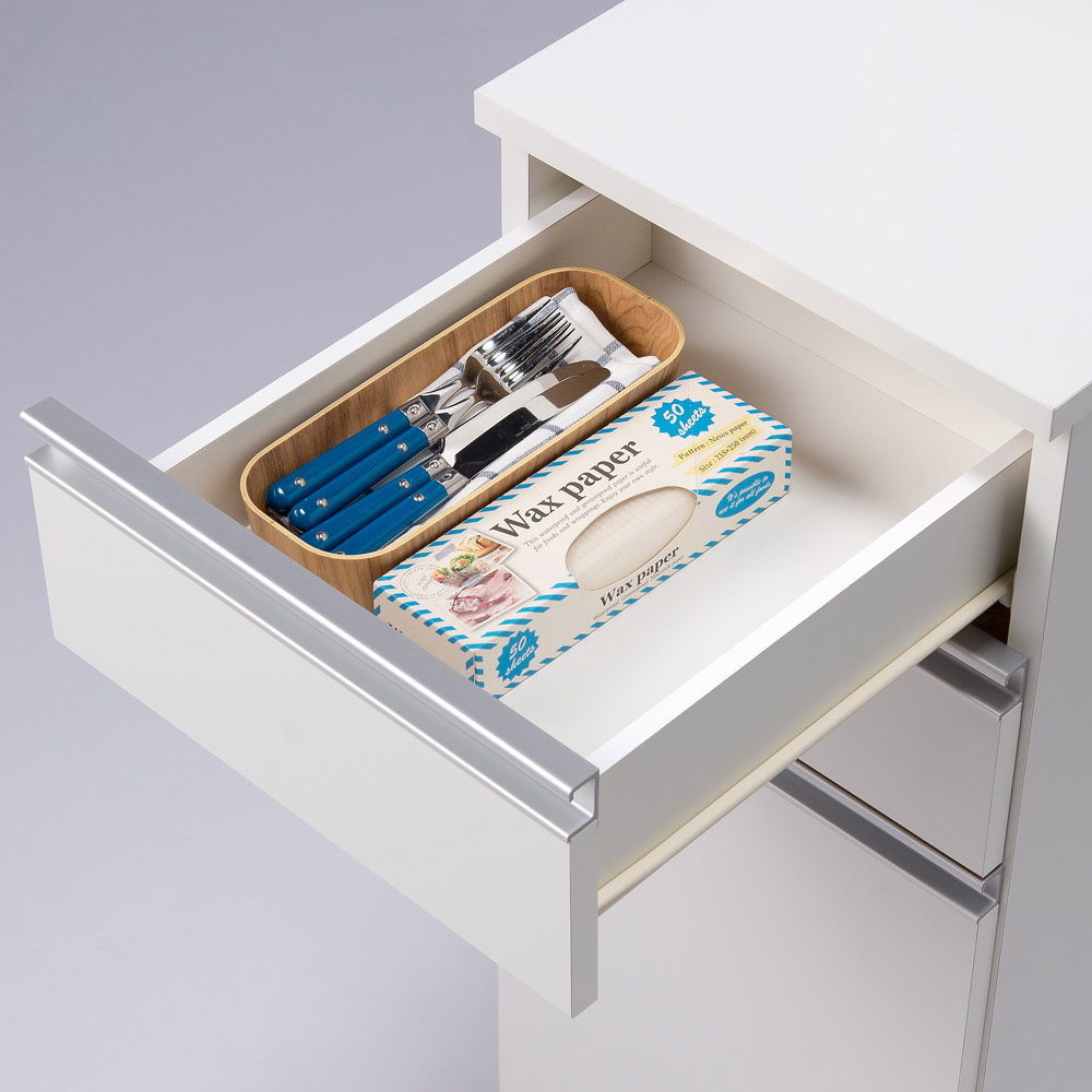 中段のレール付き引き出しは、食材ストックや調理小物の収納など多彩に使えます。