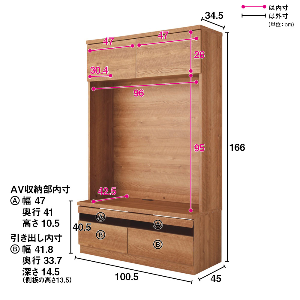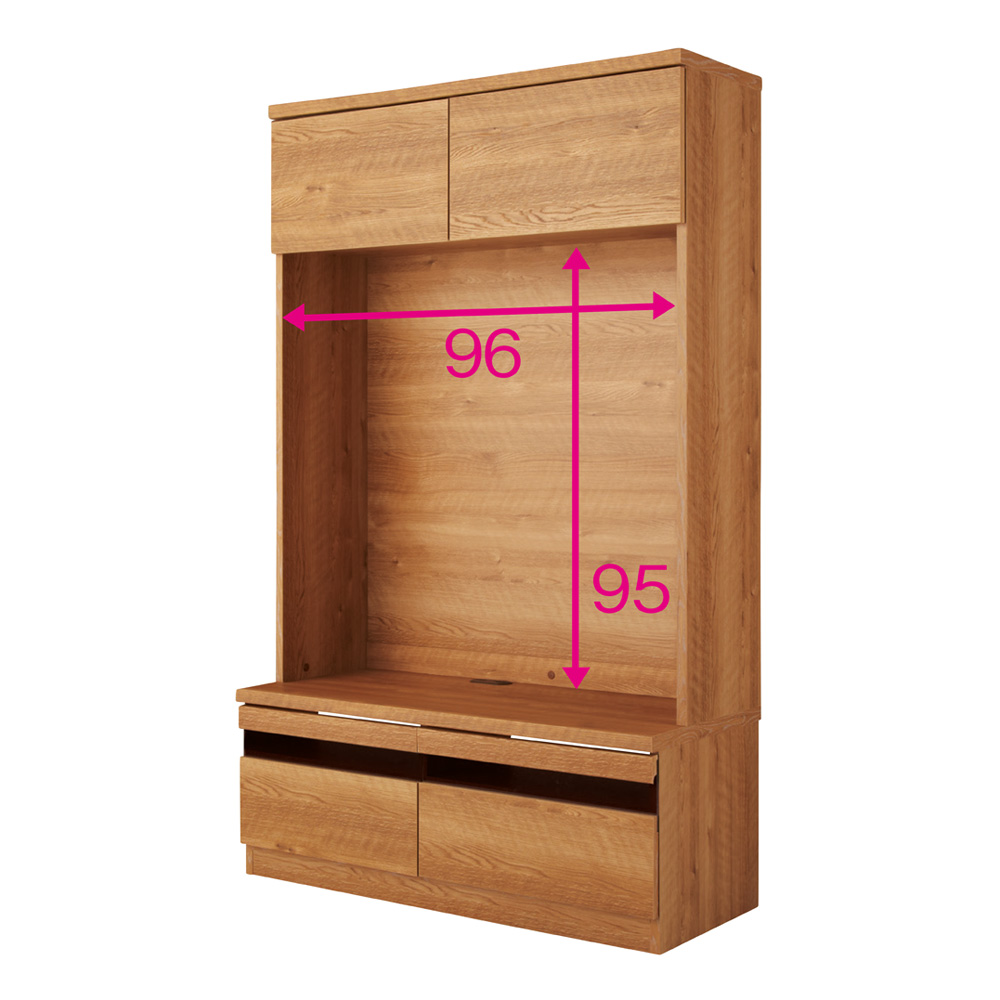 ※本商品は「テレビ台・幅100.5奥行45cm」単品です。恐れ入りますが、画像説明もあわせてご確認くださいませ。「天然木調テレビ台ハイバックシリーズ」は下記商品名をコピーし検索をお願い申し上げます。天然木調テレビ台ハイバックシリーズ テレビ台・幅100.5奥行45cm天然木調テレビ台ハイバックシリーズ テレビ台・幅120.5奥行45cm天然木調テレビ台ハイバックシリーズ テレビ台・幅159.5奥行45cm天然木調テレビ台ハイバックシリーズ 扉キャビネット・幅45.5奥行34.5cm天然木調テレビ台ハイバックシリーズ 扉キャビネット・幅60.5奥行34.5cm天然木調テレビ台ハイバックシリーズ オープンキャビネット・幅45.5奥行34.5cm天然木調テレビ台ハイバックシリーズ オープンキャビネット・幅60.5奥行34.5cm温かみのある天然木調の木目が特徴のテレビ台ハイバックシリーズ。収納量高めでも女性でも使いやすい高さ166cm。お部屋を北欧のテイストに包み込みます。幅100.5cmタイプ(お届け商品)収納機能が充実した、ハイバックシリーズのテレビ台テレビ台のサイズバリエーションは幅100.5cm、120.5cm、159.5cmの3サイズから選べます。(奥行は45cm)圧迫感を感じさせない女性でも使いやすい高さ166cm。対応テレビサイズ(目安):幅100.5cm=〜37V、120.5cm=〜48V、159.5cm=〜65Vコーディネート例(左からオープンキャビネット幅45.5・テレビ台幅120.5・扉キャビネット幅60.5cm)北欧風のあたたかみあふれるデザイン温かみのある天然木調の木目が特徴で、お部屋を北欧のテイストに包み込みます。シリーズ品のキャビネットと組み合わせたコーディネートも可能。キャビネットは扉タイプ・引き出し&オープンタイプがあります。収納機能が充実上台扉の中は内寸高さ26cm。DVDも余裕をもって収納できます。引き出しは奥のモノも取りやすいフルスライドレールを使用しており、開閉がスムーズです。左)デッキ収納部 右)配線用のコード穴(※お届けの色とは異なります)テレビ配線コードもすっきりと収納!デッキ収納部の裏側は配線がしやすいオープン仕様になっています。天板後方には、コード通し穴があり背面にコードを通せます。引き出しを閉めたままリモコンの使用が可能引き出しの前面にはポリカーポネートを使用し、引き出しを閉めたままでもリモコンを通す事ができます。※赤文字は内寸(単位:cm)広々としたテレビ収納部テレビ収納の部の内寸は幅96cm高さ95cmです。