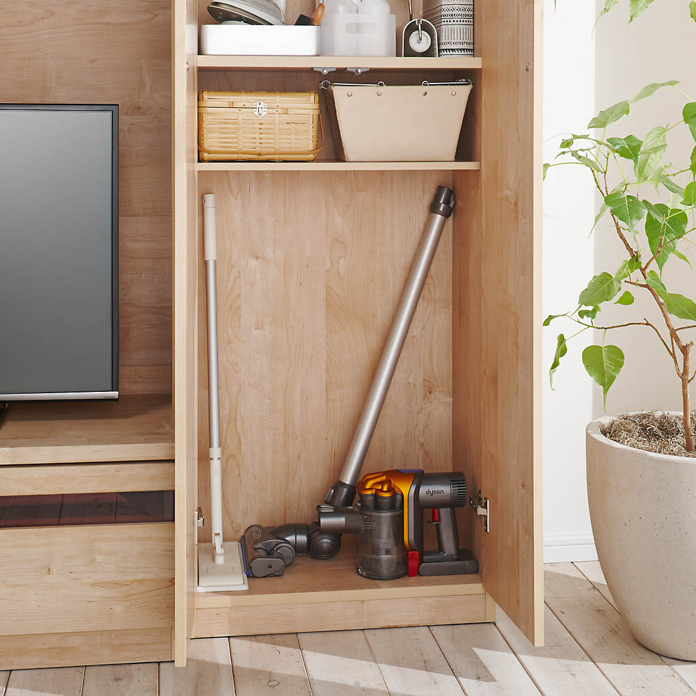 下段にはスティック型の掃除機もおさまります(可動棚も設置できます)。(※お届けの色とは異なります)