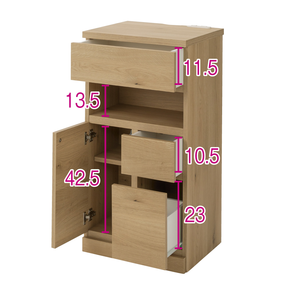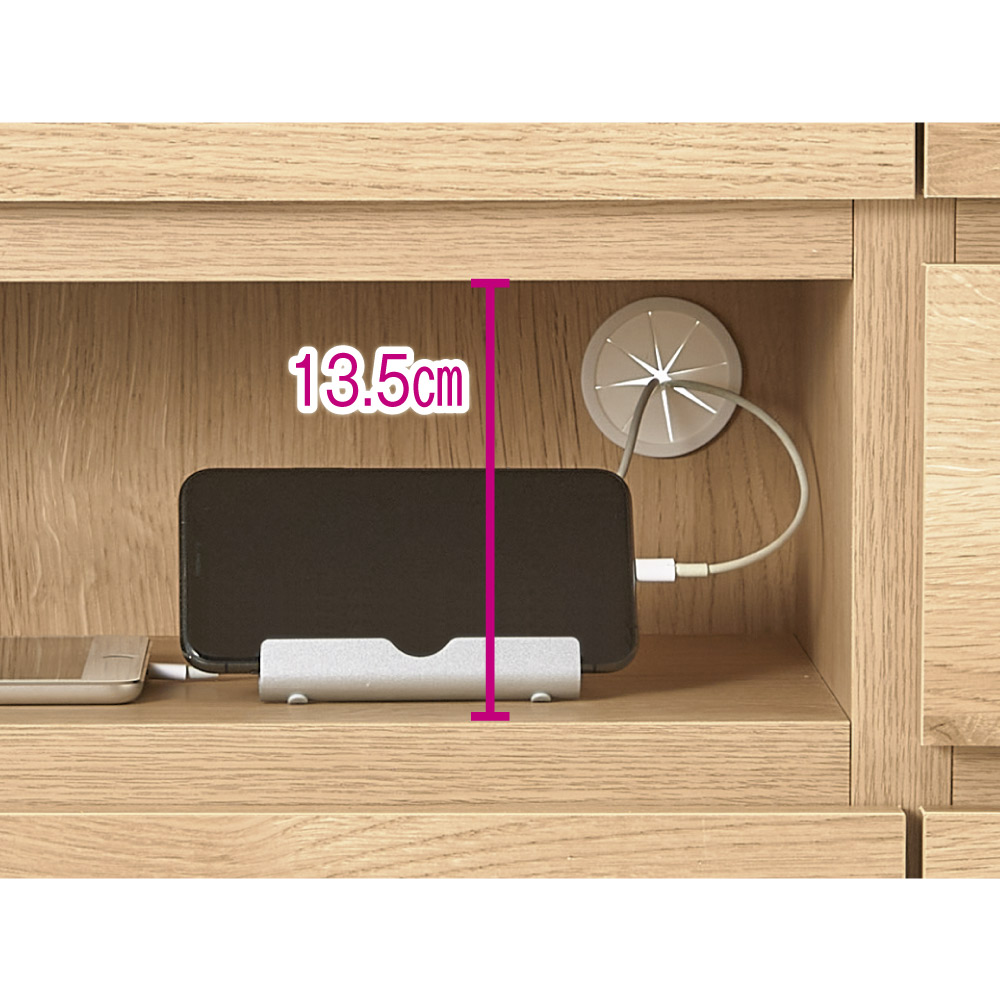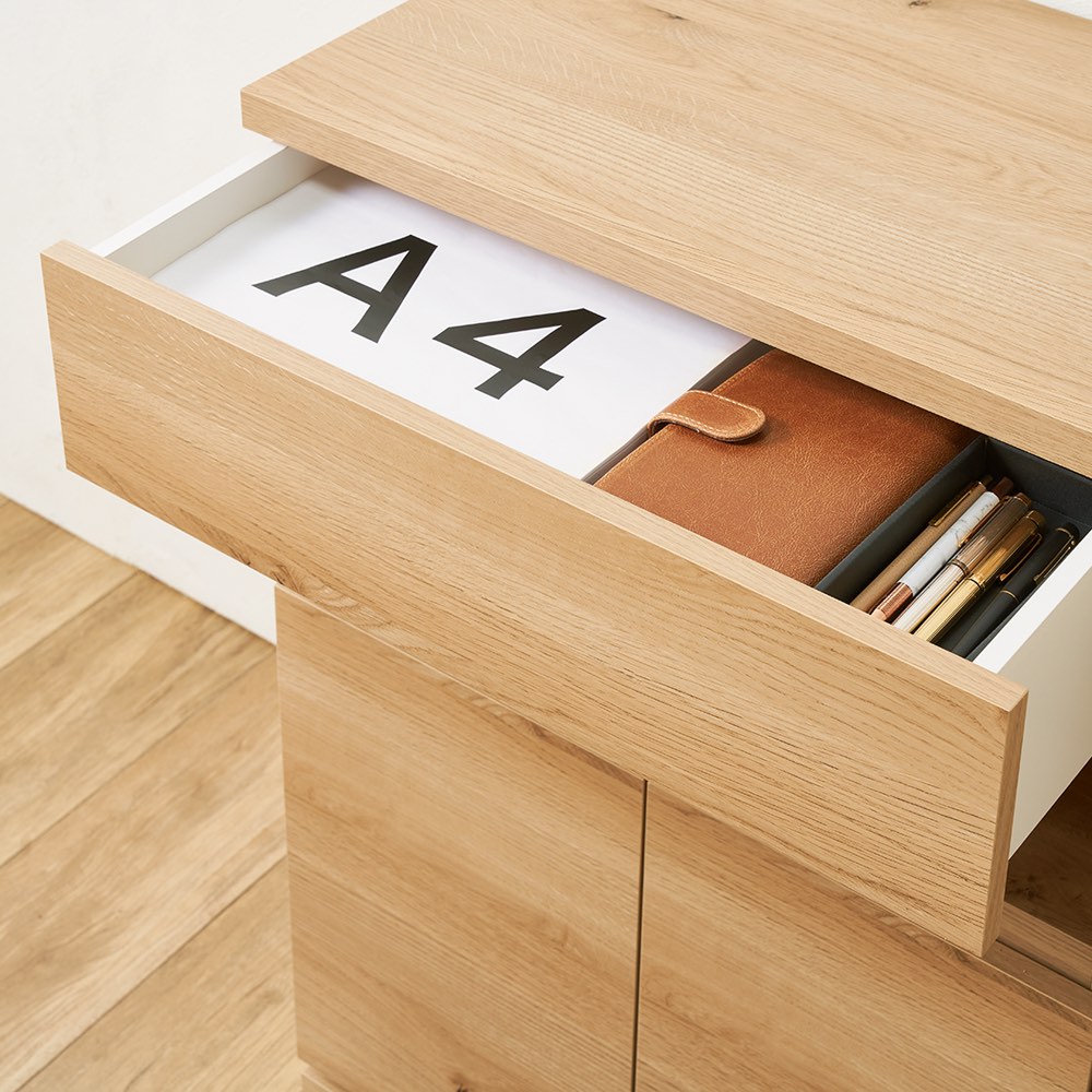 背面の棚にルーター類や配線コードがすっきり隠せるリビングキャビネット。立ったままパソコン作業できる天板高と奥行で、在宅ワークがはかどる仕様です。機能性と収納力を兼ね備えた仕様で、作業も快適●背面の棚にはルーターやモデム、電源タップなどがきれいに整理でき、表に出したくないごちゃつきがちな配線も一気に隠せます。●幅45cmだから、場所を取らずに機能的で美しいワークスペースがつくれます。●天板上にパソコンや複合機が置ける奥行39cm。●立ったままパソコン作業しやすい高さ86cm。椅子に座らない分、お部屋が広く使えて、省スペース。●天板には2口コンセント付きで、複合機置きやFAX・電話台にもできます。●オープン棚はコード穴付きで、スマートフォンやタブレットの充電ステーションにも。●コード穴にはキャップ付きで内部へのほこりの侵入を軽減します。●引き出しには筆記用具や印鑑など、リビングに散らかりがちな小物が収納できます。●最下段引き出しはスライドレールで開閉がスムーズ。●扉はプッシュ式でさっと押すだけで簡単に開閉できます。●扉内の棚はCD・DVDなどの置き場に便利。可動棚を外せばA4ファイルが立てて収納できます。●可動棚は3cm間隔で高さ調節できるので、物に合わせた収納ができます。●隠しキャスター付きで、お掃除の際にも移動が簡単。●丈夫で丁寧なつくりの日本製です。●完成品でお届けします。お客さまにて「キャスターの取り付け」のみお願い致します。お好みで選べる2色シンプルなホワイトはインテリアを選ばず、どんなお部屋にもなじみます。ブラウンは前面が天然木調。ややグレー掛かった綺麗なブラウンで北欧風インテリアにもマッチします。サイズ違いもご用意スペースや収納量に合わせて、幅45cm・幅75cm・幅90cmサイズから選べます。