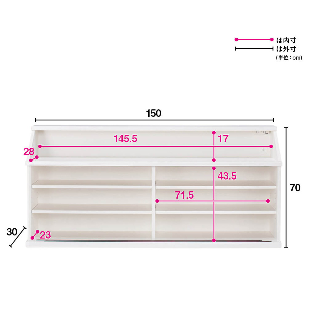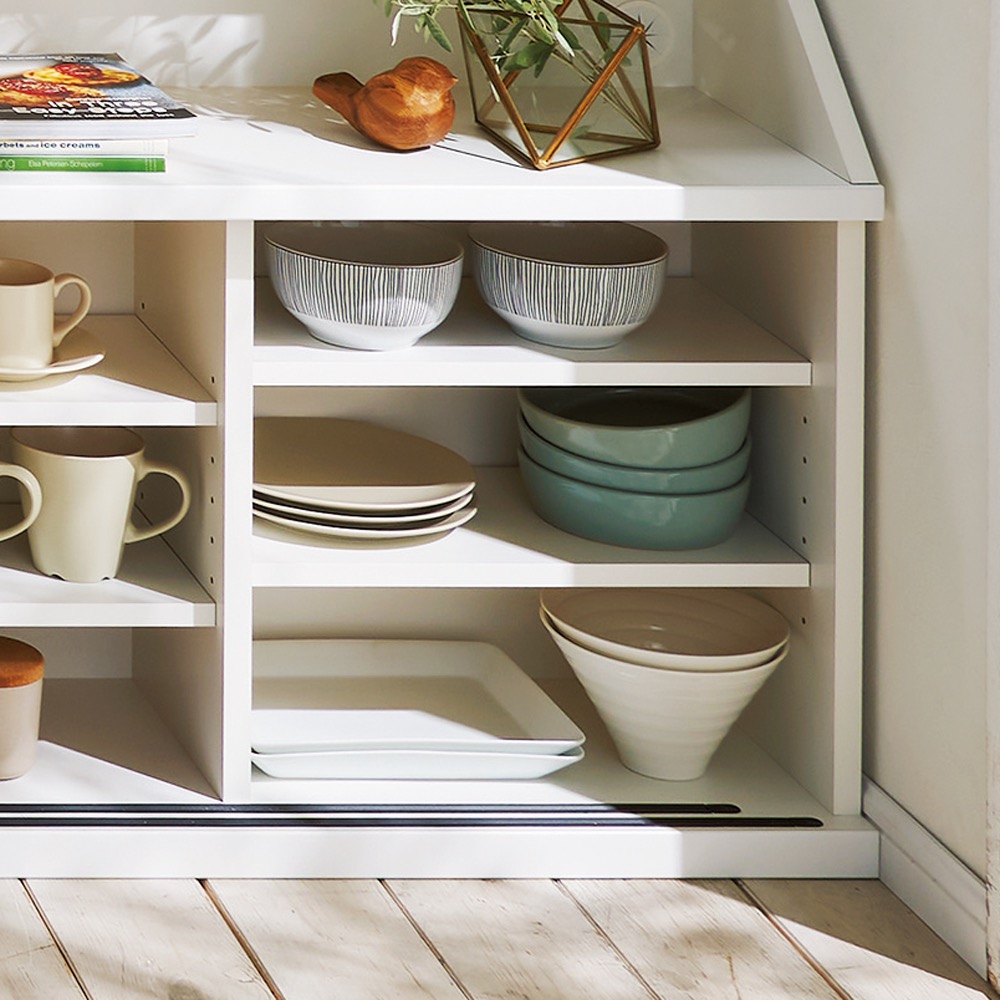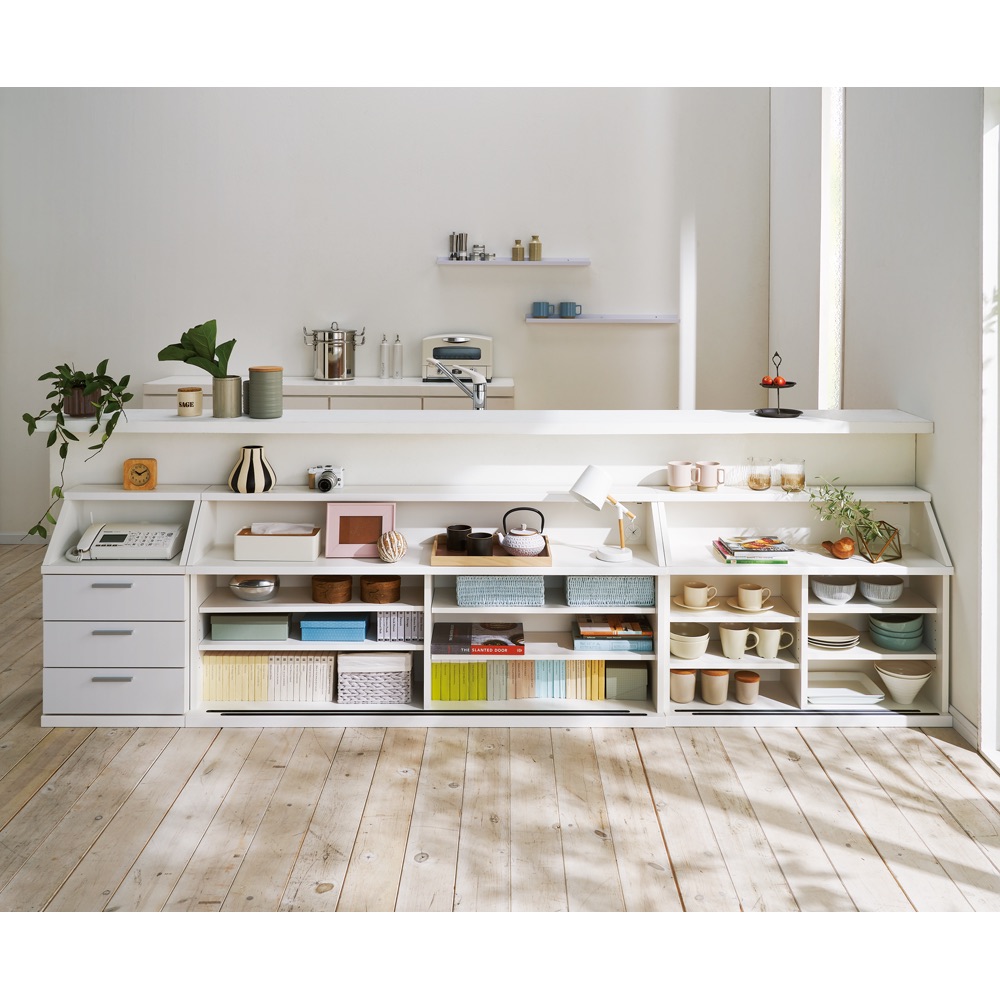 カウンターからはみ出さずキレイに置ける!狭いカウンター天板下にも圧迫感なく置けるよう、特殊な斜めカットを施しました。カウンター下だけでなく、リビングやダイニングなどさまざまな場所で活躍する機能的な収納家具です。カウンターからはみ出さない!きれいに置ける秘密の設計とは?カウンター下に収納を置きたいけど、ご自宅のカウンター天板の奥行が狭いとはみ出してしまって見た目が不揃い。なかなか自宅にちょうどよく置ける収納が見つからず、お悩みではないでしょうか?当商品は、「天板奥行13cm」と非常に薄型で、天板下は「斜めカット」を施したこだわりの設計。特殊な設計により天板下にすっきり収めることを可能にし、カウンターからはみ出さず見た目もすっきり!圧迫感なく設置できる画期的なカウンターが登場しました。毎日使うから嬉しい便利な機能性◆上部には、有効高さ17cmのオープン収納スペースがついており、2口コンセントとコード穴付き。◆スマホの充電や、ティッシュ、デッキ、観葉植物や写真立てなどのディスプレイにも活躍します。◆よく使うものは、オープン部に収納すると便利で、ダイニングに座ったまま取り出せます。◆引き戸扉の棚は3cm間隔で可動できるので、収納物に合わせて調整できます。サイズバリエーションが豊富なカウンター下収納庫。高さ70cm・85cmから選べるカウンター下収納庫。高さ70cmは一般的なダイニングテーブルの高さに合わせておりテーブルの延長上でフラットにお使いいただけます。高さ85cmは、一般的なカウンター天板下にすっきり収まる高さです。幅展開は90cmカウンター、120cmカウンター、150cmカウンター、幅44cmチェストを自由に組み合わせてご利用いただけます。(詳細は、ページ下のシリーズ商品一覧をご確認ください。)キッチンカウンター下にピッタリな薄型で空間を有効活用できるアイデア収納。◆スリムな薄型収納で、キッチンカウンター下のデッドスペースにもピッタリ収まります。◆薄型でも収納力たっぷり。中皿や小鉢、買い置きの缶詰や瓶詰をまとめて、食器棚・キッチンストッカーとしてもお勧めの隙間収納です。奥行浅めのラック・シェルフは、設置場所を選ばずリビング収納・書棚としても。◆薄型収納は窓下や廊下・リビングの空きスペースなど、カウンター下以外のデッドスペースも有効活用できます。◆廊下や寝室などの窓下に設置して書斎・本棚に収まりきらない雑誌収納やCD収納、DVD収納としても。◆リビングの窓下などに設置すれば、FAX台や電話台、ローボード・窓下収納としても活躍。リビングに散らばりがちな小物、生活雑貨をまとめて。狭いキッチンの限られた空間でもたっぷり収納。開閉スペース不要の引き戸◆スライド引き戸の扉で、開閉スペースを不要にすることで、とことん省スペースに。◆家事の動線を邪魔しない、大量収納が魅力の食器棚です。リビングやダイニングに調和する美しいデザイン性◆(ア)ホワイトの前面は美しさと機能性を兼ね備えた光沢ポリエステル化粧板。 光沢のある美しくおしゃれな見た目はもちろん、汚してもふき取り掃除の簡単な魅力的な素材です。◆(イ)ナチュラルオークは、リアルな天然木の木目や節を活かしたデザイン。安心と信頼の職人技が光る国産のキッチン収納◆熟練の家具職人がひとつずつ丁寧に仕上げたワンランク上のダイニングボード・食器棚です。◆細部の丁寧な仕上がりなど日本製ならではの高品質なキッチンボード・カップボードをお楽しみください。面倒な組み立てのいらない完成商品◆完成品でのお届けになりますので届いたその日からお使いになれます。◆取っ手の取付のみでご使用前の準備は簡単。