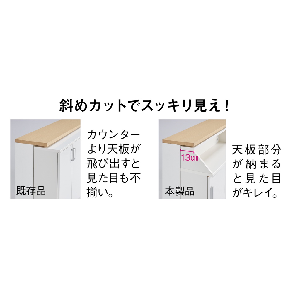 カウンターからはみ出さずキレイに置ける!狭いカウンター天板下にも圧迫感なく置けるよう、特殊な斜めカットを施しました。カウンター下だけでなく、リビングやダイニングなどさまざまな場所で活躍する機能的な収納家具です。カウンターからはみ出さない!きれいに置ける秘密の設計とは?カウンター下に収納を置きたいけど、ご自宅のカウンター天板の奥行が狭いとはみ出してしまって見た目が不揃い。なかなか自宅にちょうどよく置ける収納が見つからず、お悩みではないでしょうか?当商品は、「天板奥行13cm」と非常に薄型で、天板下は「斜めカット」を施したこだわりの設計。特殊な設計により天板下にすっきり収めることを可能にし、カウンターからはみ出さず見た目もすっきり!圧迫感なく設置できる画期的なカウンターが登場しました。毎日使うから嬉しい便利な機能性◆上部には、有効高さ17cmのオープン収納スペースがついており、2口コンセントとコード穴付き。◆スマホの充電や、ティッシュ、デッキ、観葉植物や写真立てなどのディスプレイにも活躍します。◆よく使うものは、オープン部に収納すると便利で、ダイニングに座ったまま取り出せます。◆引き戸扉の棚は3cm間隔で可動できるので、収納物に合わせて調整できます。サイズバリエーションが豊富なカウンター下収納庫。高さ70cm・85cmから選べるカウンター下収納庫。高さ70cmは一般的なダイニングテーブルの高さに合わせておりテーブルの延長上でフラットにお使いいただけます。高さ85cmは、一般的なカウンター天板下にすっきり収まる高さです。幅展開は90cmカウンター、120cmカウンター、150cmカウンター、幅44cmチェストを自由に組み合わせてご利用いただけます。(詳細は、ページ下のシリーズ商品一覧をご確認ください。)キッチンカウンター下にピッタリな薄型で空間を有効活用できるアイデア収納。◆スリムな薄型収納で、キッチンカウンター下のデッドスペースにもピッタリ収まります。◆薄型でも収納力たっぷり。中皿や小鉢、買い置きの缶詰や瓶詰をまとめて、食器棚・キッチンストッカーとしてもお勧めの隙間収納です。奥行浅めのラック・シェルフは、設置場所を選ばずリビング収納・書棚としても。◆薄型収納は窓下や廊下・リビングの空きスペースなど、カウンター下以外のデッドスペースも有効活用できます。◆廊下や寝室などの窓下に設置して書斎・本棚に収まりきらない雑誌収納やCD収納、DVD収納としても。◆リビングの窓下などに設置すれば、FAX台や電話台、ローボード・窓下収納としても活躍。リビングに散らばりがちな小物、生活雑貨をまとめて。狭いキッチンの限られた空間でもたっぷり収納。開閉スペース不要の引き戸◆スライド引き戸の扉で、開閉スペースを不要にすることで、とことん省スペースに。◆家事の動線を邪魔しない、大量収納が魅力の食器棚です。リビングやダイニングに調和する美しいデザイン性◆(ア)ホワイトの前面は美しさと機能性を兼ね備えた光沢ポリエステル化粧板。 光沢のある美しくおしゃれな見た目はもちろん、汚してもふき取り掃除の簡単な魅力的な素材です。◆(イ)ナチュラルオークは、リアルな天然木の木目や節を活かしたデザイン。安心と信頼の職人技が光る国産のキッチン収納◆熟練の家具職人がひとつずつ丁寧に仕上げたワンランク上のダイニングボード・食器棚です。◆細部の丁寧な仕上がりなど日本製ならではの高品質なキッチンボード・カップボードをお楽しみください。面倒な組み立てのいらない完成商品◆完成品でのお届けになりますので届いたその日からお使いになれます。◆取っ手の取付のみでご使用前の準備は簡単。