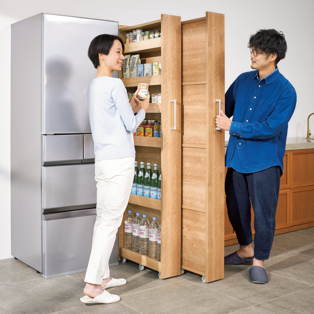 使用イメージ(ア)ホワイト スリムなのに大容量。180cmの高さを活かして、調味料からペットボトルまでたっぷり収納できます。 ※写真は別売りの幅35cm奥行55cmタイプになります。