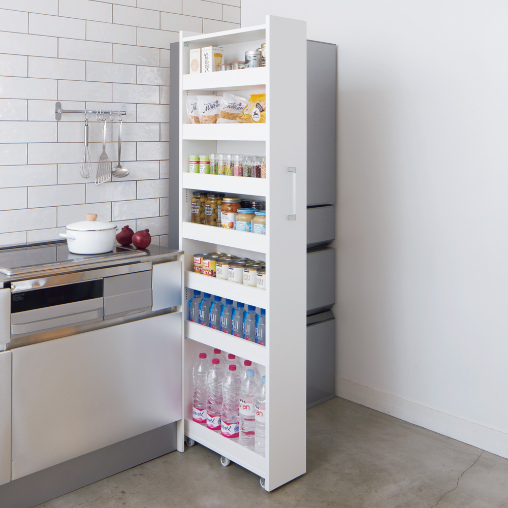 使用イメージ(ア)ホワイト スリムなのに大容量。180cmの高さを活かして、調味料からペットボトルまでたっぷり収納できます。 ※写真は別売りの幅35cm奥行55cmタイプになります。