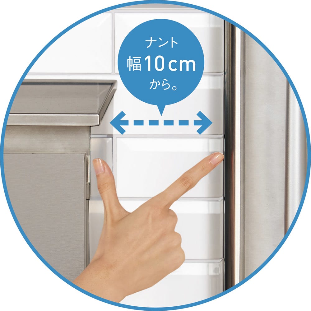 すき間を無駄なく使える1cm刻みの幅展開。幅10〜35cmまでご準備。3色展開・2種類の奥行でキッチンにぴったりフィット。