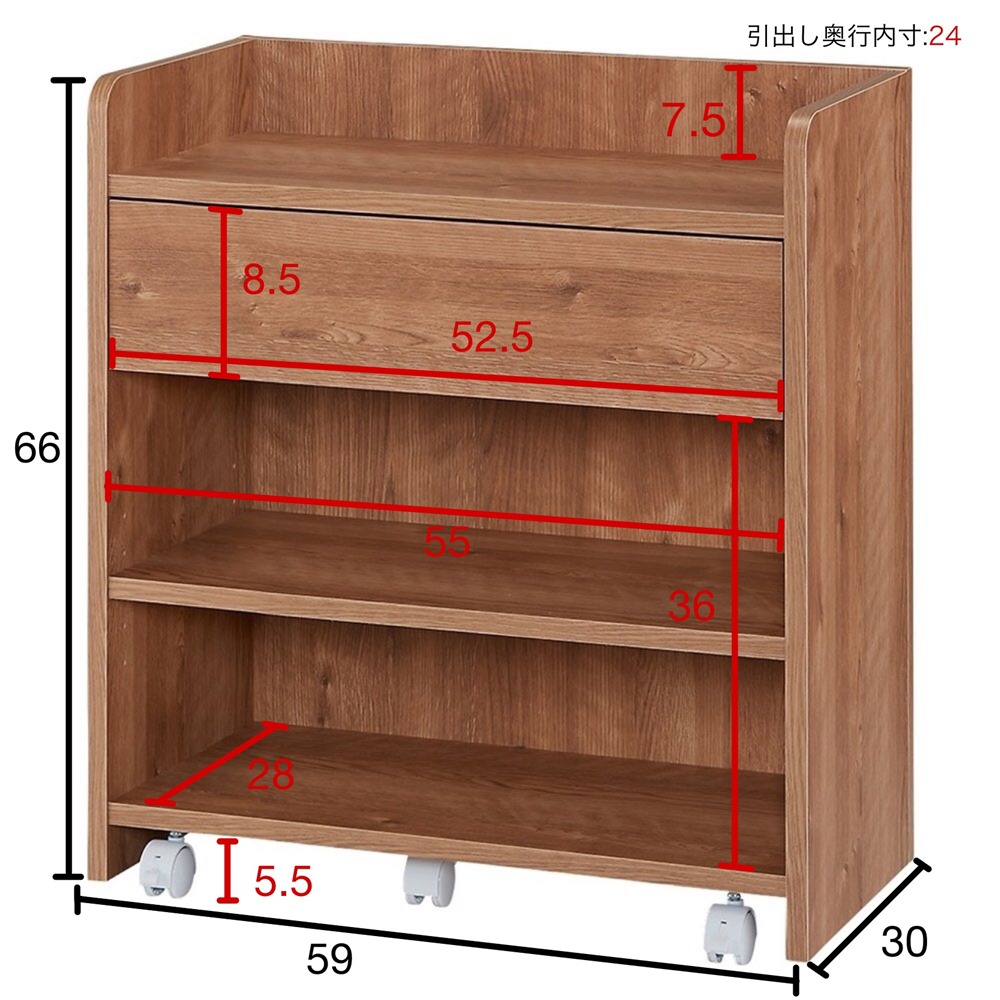 使いたい場所に移動自在。収納したまま動かせる便利なカウンター下収納ワゴンです。背面化粧仕上げで裏返せばすっきり目隠し収納できます。ホワイトと天然木調のおしゃれな色展開も魅力です。在宅勤務、テレワークにも最適。使用例(左から棚タイプ幅79高さ66cm、小引き出しタイプ幅79高さ66cm、マルチタイプ幅79高さ66cm)クルッと裏返せばサッと目隠し背面まできれいな化粧仕上げの隠しキャスター付きの収納庫。ワゴン感覚で簡単に移動することができます。小引き出しタイプ ブラウン 幅59高さ66cm(お届け商品)(図の単位cm、赤字は内寸)小物収納に便利な「小引き出しタイプ」メガネやペン、キッチン周りであればカトラリーなど小物の整理整頓に便利な引き出し付きタイプ。引き出し下はオープンラックになっており、本棚としても。高さは66cm・80cmの2タイプから、幅は59cm・79cmの2タイプからお選びいただけます。カラーはホワイト・ブラウンの2色。使用例(右から棚タイプ幅79高さ80cm、小引き出しタイプ幅79高さ80cm、マルチタイプ幅79高さ80cm)カトラリーや食器、食材のストック収納につい増えてしまい収納場所に困るカトラリーやコップ、取り皿の収納や、お菓子や調味料などダイニングテーブルの近くにあれば便利なものの指定席に。天板にも物が置けるため一時的な台としても使えます。使用例(左から棚タイプ幅79高さ66cm、小引き出しタイプ幅79高さ66cm、マルチタイプ幅79高さ66cm)テレワーク用の収納としてテレワークをする機会が増えたけど場所がなくダイニングでしているという方にもおすすめ。引き出し付のタイプを使えば文房具など細々したものも収納できます。テレワークが終わればカウンター下に収めるだけ。ダイニングがごちゃつかず片付けも簡単です。使用例(左から棚タイプ幅59高さ80cm、小引き出しタイプ幅59高さ80cm、マルチタイプ幅59高さ80cm)推しの収納にも簡単にで目隠しできるため推しのグッズ収納としても。普段はきれいにディスプレイ収納し来客時などはサッと目隠しできます。使用例(左から小引き出しタイプ幅79高さ66cm、棚タイプ幅79高さ66cm、マルチタイプ幅79高さ66cm)子どものおもちゃやリビング収納にも大活躍カウンター下以外にも散らかりがちな子供のおもちゃの収納や、リビング収納としても活躍します。上部の角は丸みのある仕上げでお子様のいる家庭でも安心して使用できます。裏返せば見た目スッキリ背面化粧仕上げで、くるっと裏返せばすっきり目隠し収納。生活感も隠せます。外から見えにくい隠しキャスター背面からはキャスターが見えない仕様で、見た目もキレイ(お客さまにてキャスター取付となります)。※写真は小引き出しタイプ幅79高さ80cm文房具などの収納に便利な小引き出し小引出しタイプ幅59cmの引出し内寸は、幅52.5高さ8.5奥行24cmです。※写真は棚タイプ幅79高さ80cm棚板の高さは調整可能小引き出しタイプワゴンの棚板は、3cm間隔で調整可能です。高さ66cmタイプは3cmピッチ5段階、高さ80cmタイプは3cmピッチ9段階で高さ調整可能。