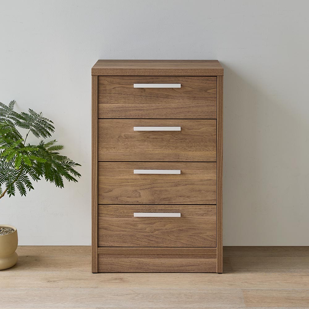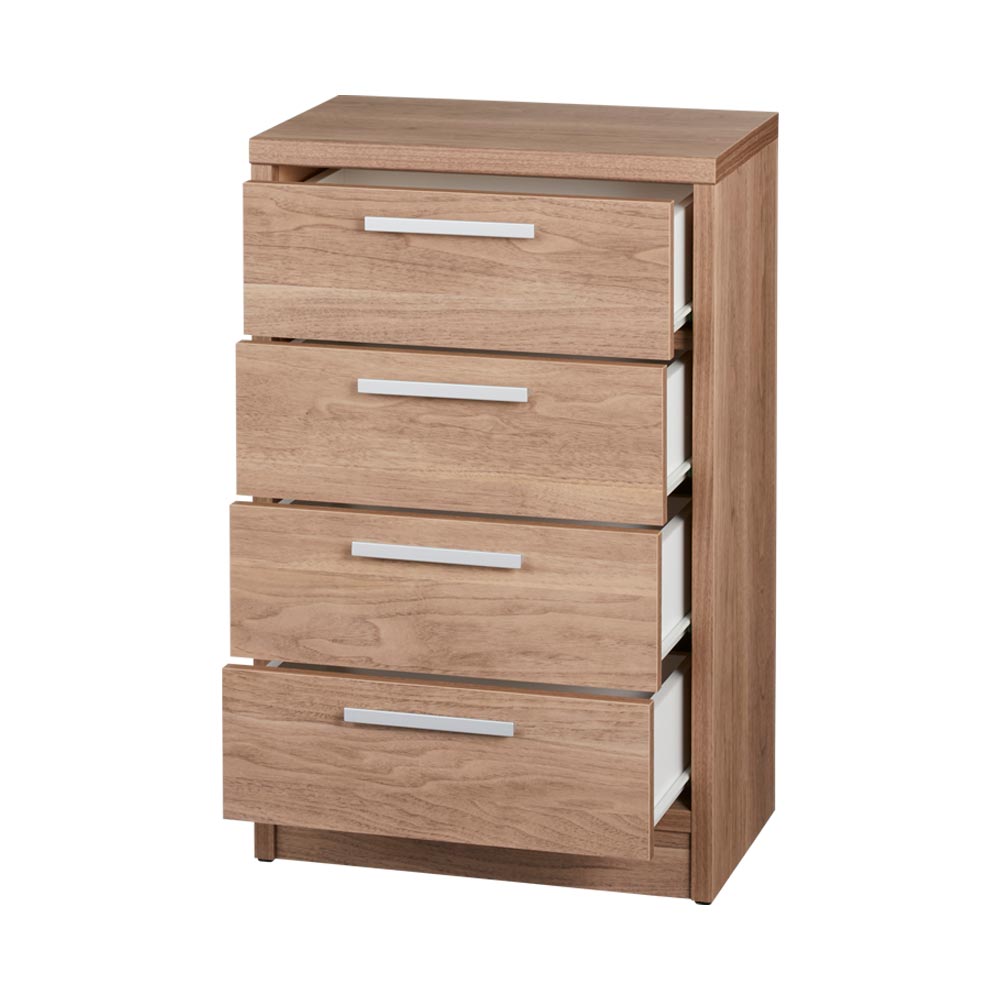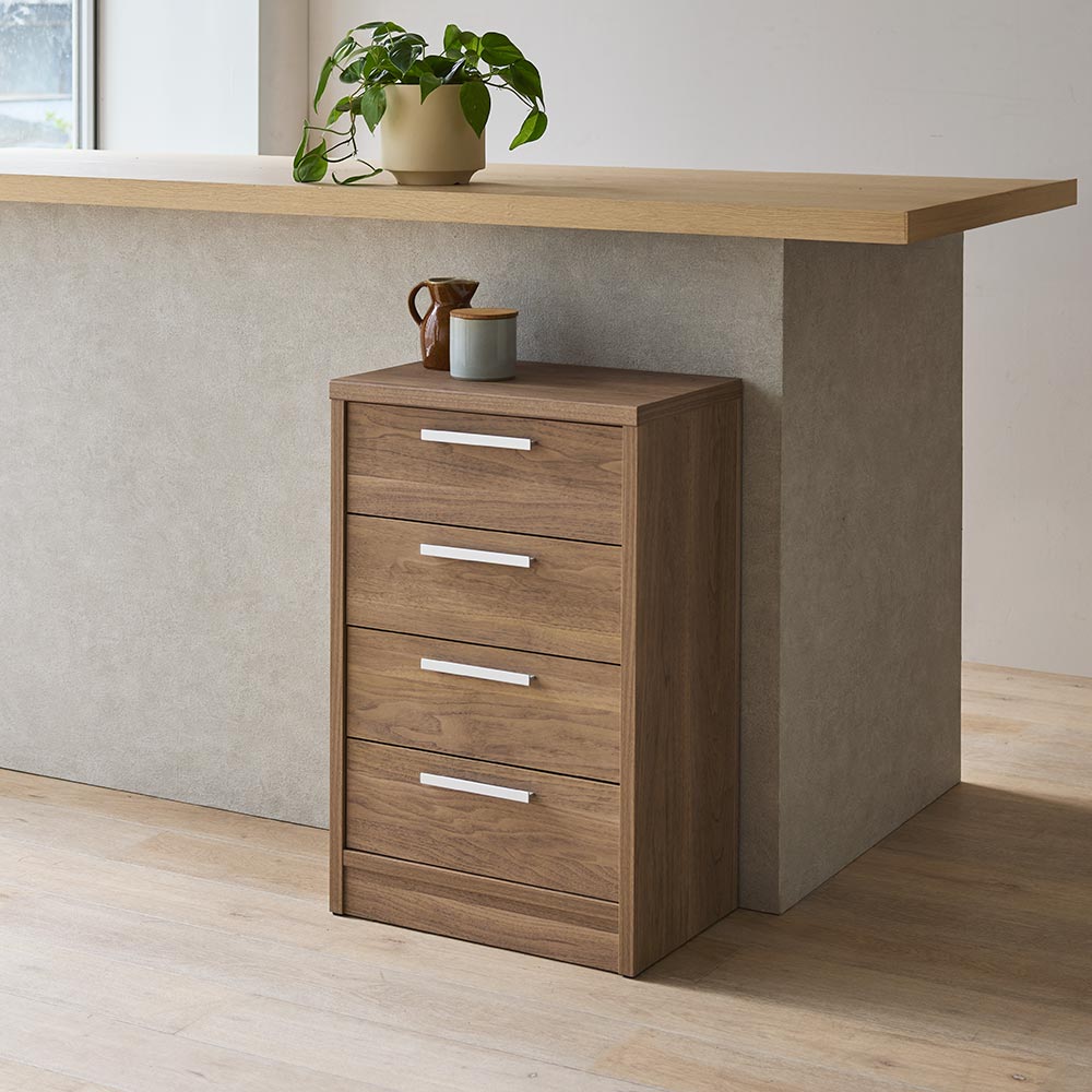 セット使いでも単品使いでも。収納力グーンとUP!のコンパクトな引き出し。安心の「国産」&届いてすぐに使える「完成品」も嬉しいポイント!同じシリーズの引き戸収納とのセット使いでも、単品使いでも、家中どこに置いても活躍する万能デザインです。コンパクトながらたっぷり収納できるので、すっきりと片付いたお部屋づくりを実現します。高さの異なる2タイプ。幅は45cmのコンパクト設計で、高さは70cmと85cmからお選びいただけます。天板には小物や雑貨を飾って、インテリアとしても楽しめます。コンパクトでも収納力があるので、ワンルームや狭い空間にもおすすめです。スライドレール付きで開閉楽々♪4つの引き出しにはそれぞれスライドレールが取り付けられていて、奥までスムーズに引き出せます。収納するものに応じた深さの引き出しで整頓も簡単。完成品でのお届けなので、取っ手の取り付けだけで準備完了です。ナチュラルな木目の風合いの3カラー。どんなお部屋にも馴染むシンプルなデザイン。ホワイト木目、ナチュラル、ウォルナットの3カラーから選べ、優しい木目の素材感がお部屋にしっくり馴染みます。流行に左右されないシンプルなデザインはリビング、寝室、子ども部屋など、どんなお部屋にも調和します。見せるも隠すも引き戸収納とセット使いで「見せて」「隠す」引き戸収納と組み合わせて使えば、見せる収納と隠す収納の両方が実現。ベースカラーを揃えたミニマルでおしゃれなコーディネートが可能です。お気に入りアイテムはしっかり見せて、隠したいものは美しいフォルムの家具にすっきり収納。お部屋を手軽に美しく整えます。