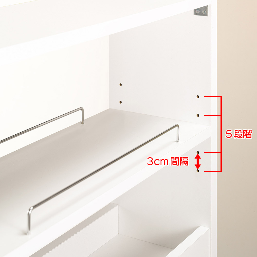 ・可動棚板は収納物に合わせて3cm間隔、5段階で調節できます。