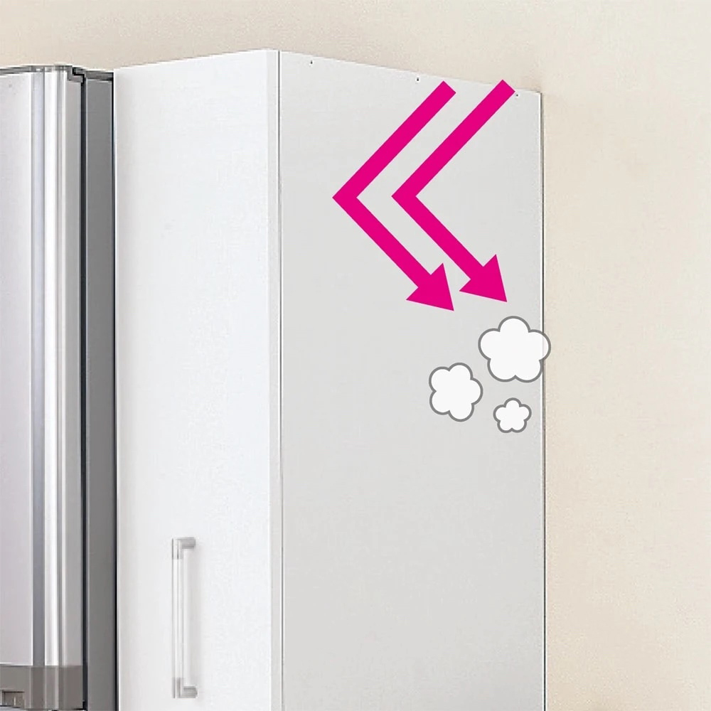• 使用例(ア)ホワイト キッチンのすき間があっという間に大量収納庫に変身。冷蔵庫横の中途半端なすき間にもジャストフィット。 ※写真は幅25cm奥行55cmタイプ