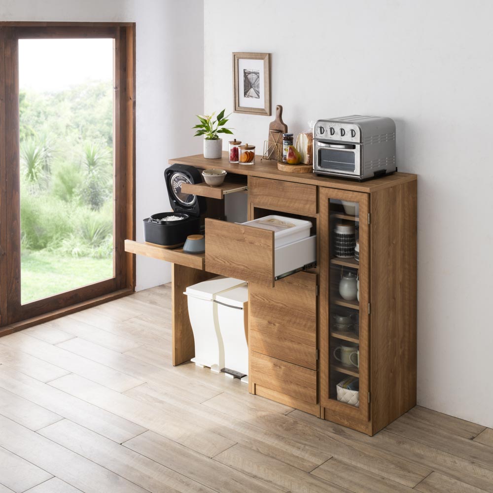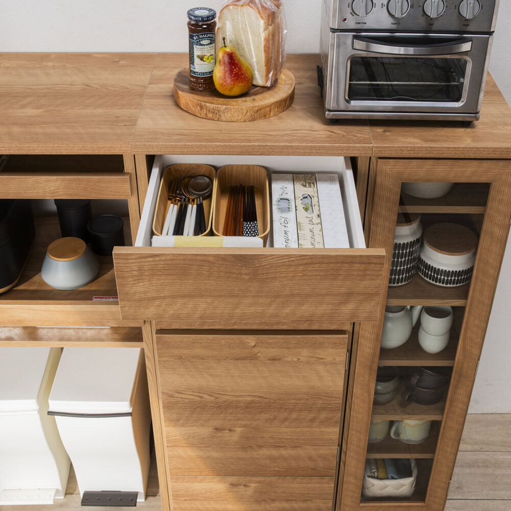 コーディネート例(イ)ブラウン 便利な仮置きトレーも付いて、毎日の配膳が圧倒的に楽になります。 ※写真左から家電収納タイプ、米びつ収納タイプ、食器収納タイプです。