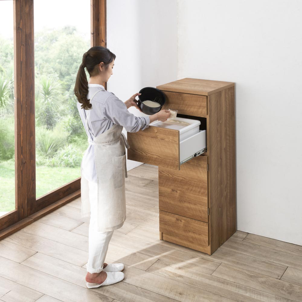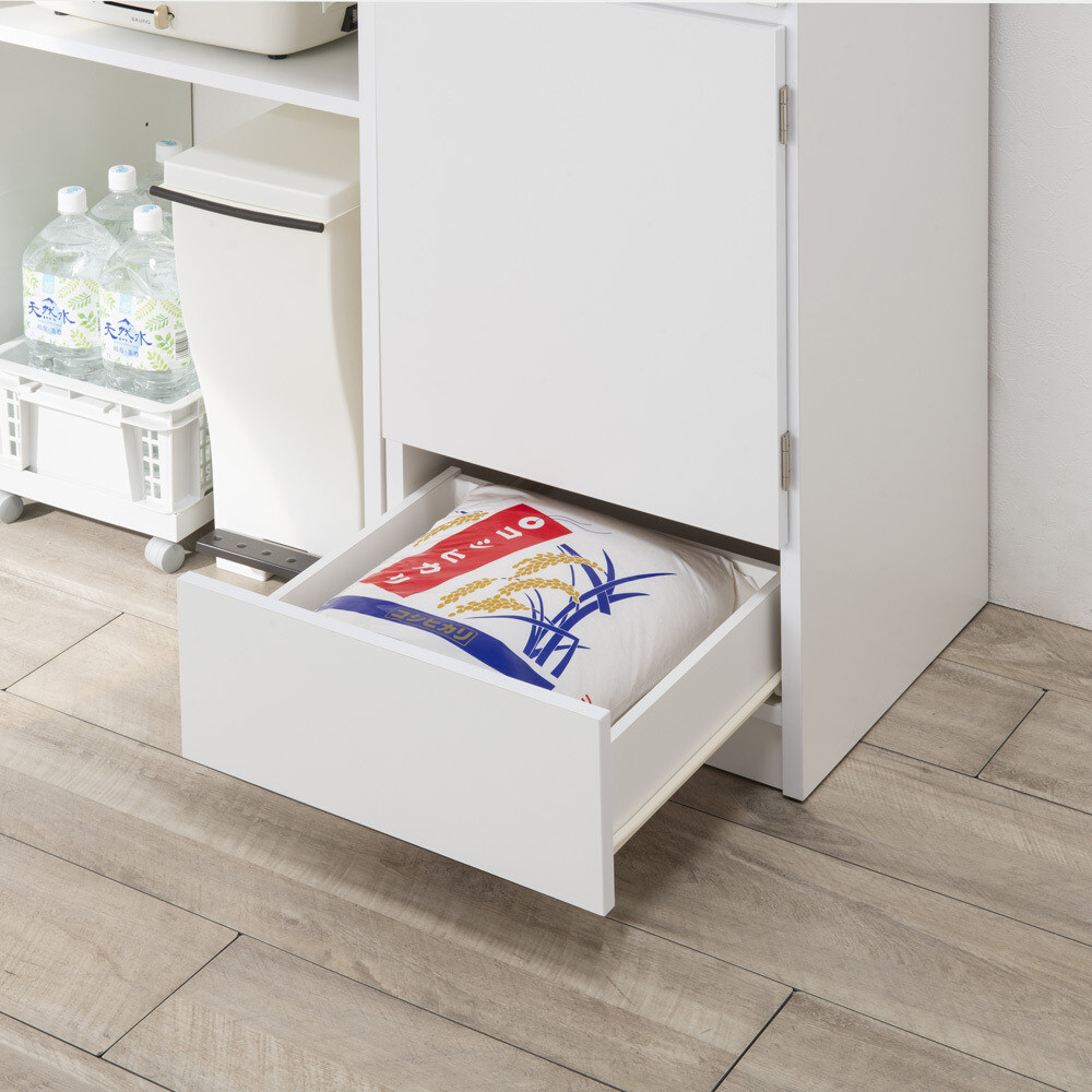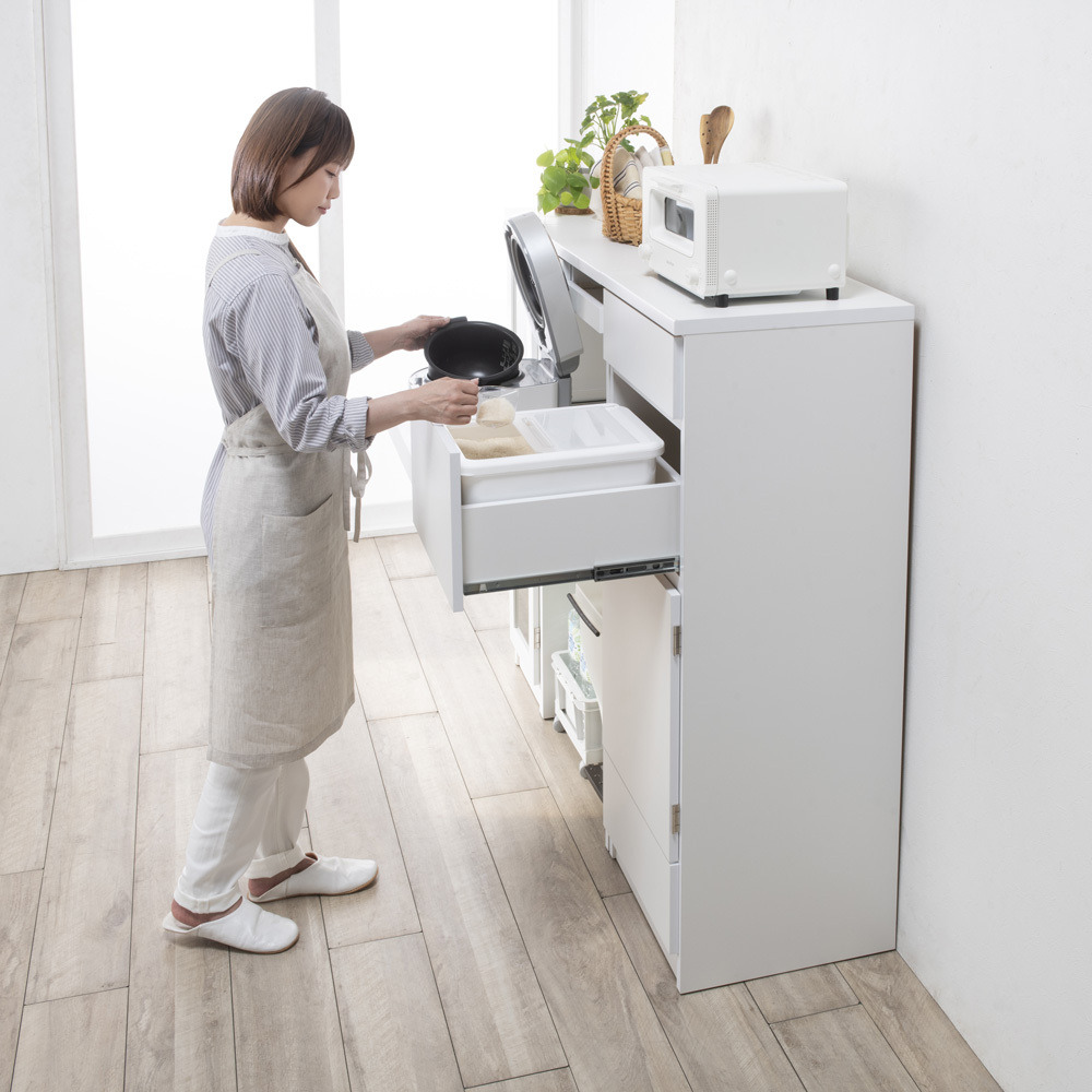 もう屈まない!こぼさない!お米のことを考え抜いた「おコメ本位」のキッチン収納。腰を屈めず、楽な姿勢でご飯がよそえる。お米を入れられる。そんな「ちょうどいい高さ」にこだわった親切設計のキッチンラック。米びつ収納は、一般的な引き出し用の米びつが収まる引き出しを、腰を屈めずにすむ高さに配置。毎日繰り返すご飯の支度が楽になるdinosオリジナルの収納です。毎日の「お米の入れやすさ」にこだわったキッチン収納毎日行う「米びつから釜にお米を入れる」という作業をラクにできる、こだわりのキッチン収納。このシリーズが生まれたのは、どうして?一般的なキッチン収納は炊飯器を置くスペースや米びつが収納できるスペースの位置が低く、「ご飯をよそったりお米を入れる際に屈むことが苦痛」「炊飯器や茶碗までの距離が長いためご飯やお米をこぼしてしまう」といった声も。毎日のことだけに、少しでもラクにストレスをなくしてもらいたくて商品開発しました。日々のストレスを解決するこだわりの設計従来の収納は引き出し用の米びつが入る引き出しは低い位置にしかなく、屈んで中腰での作業は体に負担が大きいものでした。そこで、一般的な12kgまでの引き出し用の米びつ(幅31×奥行38.5×高さ20cmまで)が入る引き出しを、屈まず使える場所に設定。屈まず、こぼさず、ラクにお米を入れられます。1.便利な米びつ引き出し(上から2段目)市販されている一般的な引き出し用の米びつ(幅31×奥行38.5×高さ20cmまで)が収まる引き出しを、腰を屈めずに扱える高さに配置。奥までしっかり引き出せるので、米びつの出し入れもしやすく便利です。2.最上段は使い勝手のよい引き出し中が見やすい浅型なので、お箸やカトラリーなど小物の収納に活躍。キッチンクロスやお弁当の飾りなど、パッと出したい小さな物の収納にも。3.中段の扉収納は、置き場所に合わせてどちら開きにも大きめの物はここへ。扉で隠す収納で、見た目もスッキリ。3cmピッチで高さ調節ができる可動棚が2枚付属し、収納力も抜群。4.最下段にはお米がストックできる引き出し付きお米の供給が不安定な昨今の事情から、予備をストックしたい方も多いはず。そこで、お米のストックが入る引き出しをご用意しました。 ※写真は10kgのお米で撮影。すぐに使える完成品。シリーズ品と組み合わせてより便利に。組立不要で、届いてすぐに使える完成品。また、同シリーズの「家電収納」や「食器収納」と組み合わせ可能で、ご飯を炊いて茶碗によそうまで、腰を屈めずラクにできます。きっと便利さをご実感いただけますので、ぜひ、シリーズ3点合わせてのご使用をご検討ください。カラーは2色をご用意。詳しい内寸などはこちらでご確認くださいモダンで清潔感のある(ア)ホワイト、ナチュラルなインテリアになじむ(イ)ブラウンの2カラー。コンパクトでも収納効率がよく、頑丈なので重たいお米も安心してまかせられる米びつ収納です。