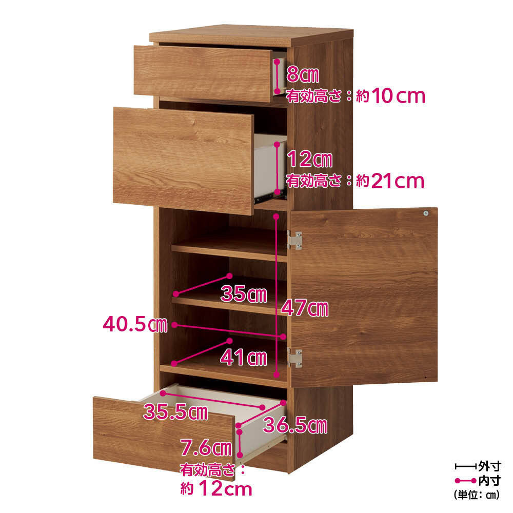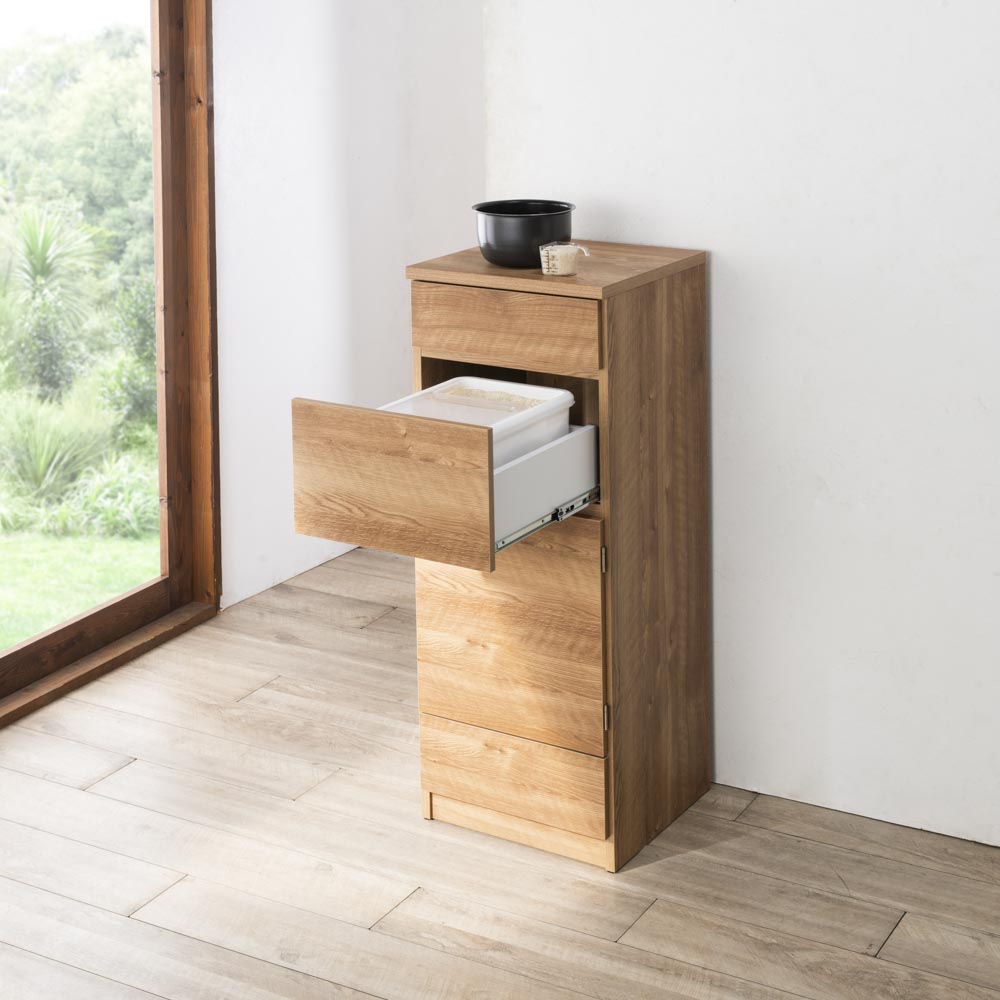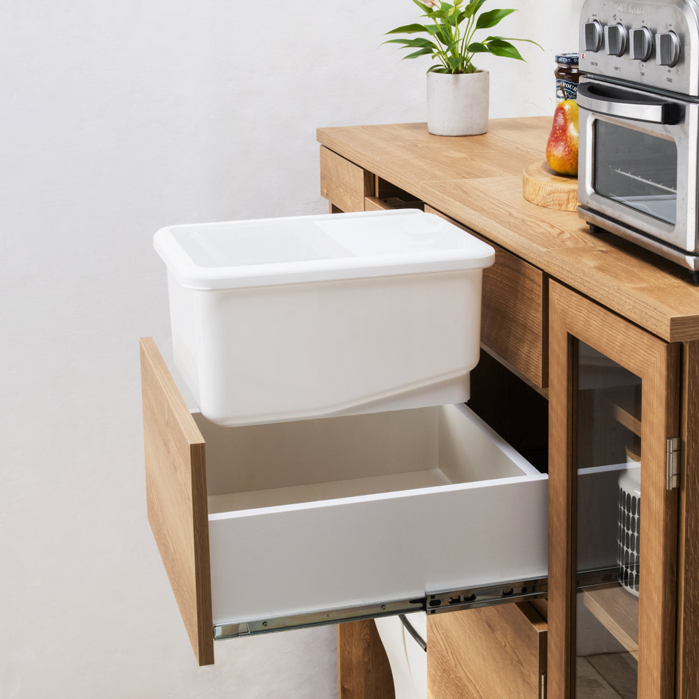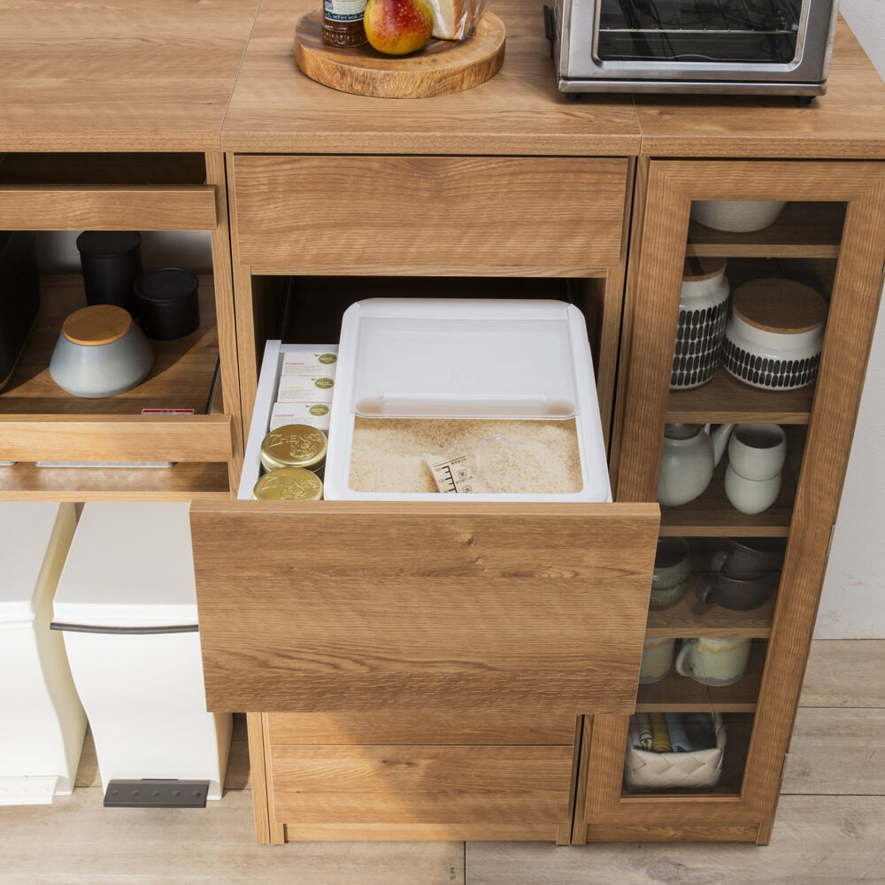 もう屈まない!こぼさない!お米のことを考え抜いた「おコメ本位」のキッチン収納。腰を屈めず、楽な姿勢でご飯がよそえる。お米を入れられる。そんな「ちょうどいい高さ」にこだわった親切設計のキッチンラック。米びつ収納は、一般的な引き出し用の米びつが収まる引き出しを、腰を屈めずにすむ高さに配置。毎日繰り返すご飯の支度が楽になるdinosオリジナルの収納です。毎日の「お米の入れやすさ」にこだわったキッチン収納毎日行う「米びつから釜にお米を入れる」という作業をラクにできる、こだわりのキッチン収納。このシリーズが生まれたのは、どうして?一般的なキッチン収納は炊飯器を置くスペースや米びつが収納できるスペースの位置が低く、「ご飯をよそったりお米を入れる際に屈むことが苦痛」「炊飯器や茶碗までの距離が長いためご飯やお米をこぼしてしまう」といった声も。毎日のことだけに、少しでもラクにストレスをなくしてもらいたくて商品開発しました。日々のストレスを解決するこだわりの設計従来の収納は引き出し用の米びつが入る引き出しは低い位置にしかなく、屈んで中腰での作業は体に負担が大きいものでした。そこで、一般的な12kgまでの引き出し用の米びつ(幅31×奥行38.5×高さ20cmまで)が入る引き出しを、屈まず使える場所に設定。屈まず、こぼさず、ラクにお米を入れられます。1.便利な米びつ引き出し(上から2段目)市販されている一般的な引き出し用の米びつ(幅31×奥行38.5×高さ20cmまで)が収まる引き出しを、腰を屈めずに扱える高さに配置。奥までしっかり引き出せるので、米びつの出し入れもしやすく便利です。2.最上段は使い勝手のよい引き出し中が見やすい浅型なので、お箸やカトラリーなど小物の収納に活躍。キッチンクロスやお弁当の飾りなど、パッと出したい小さな物の収納にも。3.中段の扉収納は、置き場所に合わせてどちら開きにも大きめの物はここへ。扉で隠す収納で、見た目もスッキリ。3cmピッチで高さ調節ができる可動棚が2枚付属し、収納力も抜群。4.最下段にはお米がストックできる引き出し付きお米の供給が不安定な昨今の事情から、予備をストックしたい方も多いはず。そこで、お米のストックが入る引き出しをご用意しました。 ※写真は10kgのお米で撮影。すぐに使える完成品。シリーズ品と組み合わせてより便利に。組立不要で、届いてすぐに使える完成品。また、同シリーズの「家電収納」や「食器収納」と組み合わせ可能で、ご飯を炊いて茶碗によそうまで、腰を屈めずラクにできます。きっと便利さをご実感いただけますので、ぜひ、シリーズ3点合わせてのご使用をご検討ください。カラーは2色をご用意。詳しい内寸などはこちらでご確認くださいモダンで清潔感のある(ア)ホワイト、ナチュラルなインテリアになじむ(イ)ブラウンの2カラー。コンパクトでも収納効率がよく、頑丈なので重たいお米も安心してまかせられる米びつ収納です。