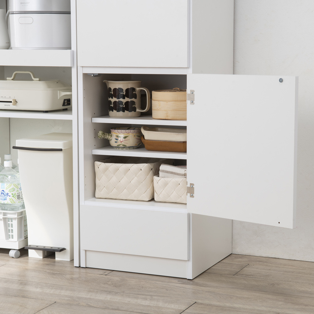 レイアウトに合わせて左右付け替え可能な扉の中には、3cm間隔で高さ調節ができる可動棚が2枚付属し、収納力も抜群。
