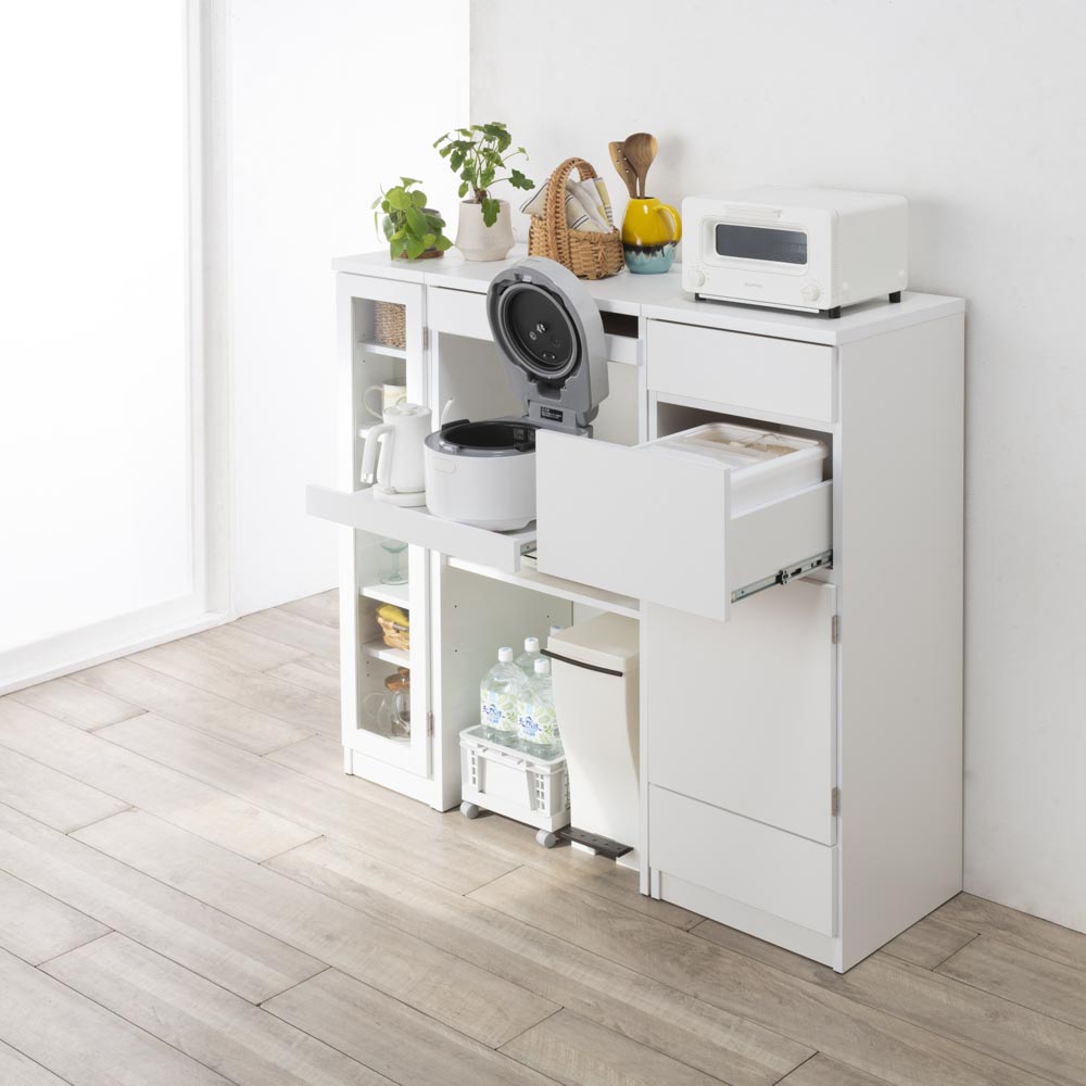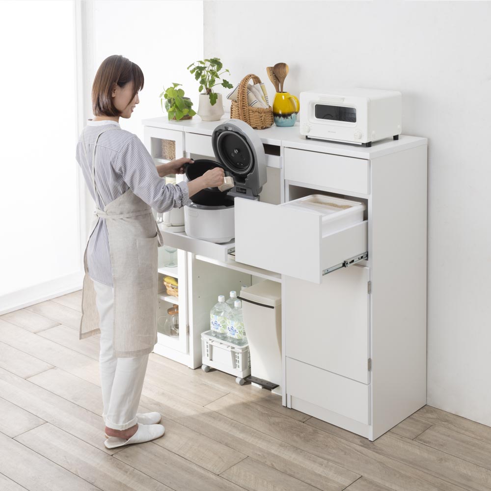 コーディネート例(ア)ホワイト 米びつからお米を入れるのも、屈まずラクラク!シリーズ商品の「家電収納」のスライド棚と高さが合う設計。 ※写真左から食器収納タイプ、家電収納タイプ、米びつ収納タイプです。