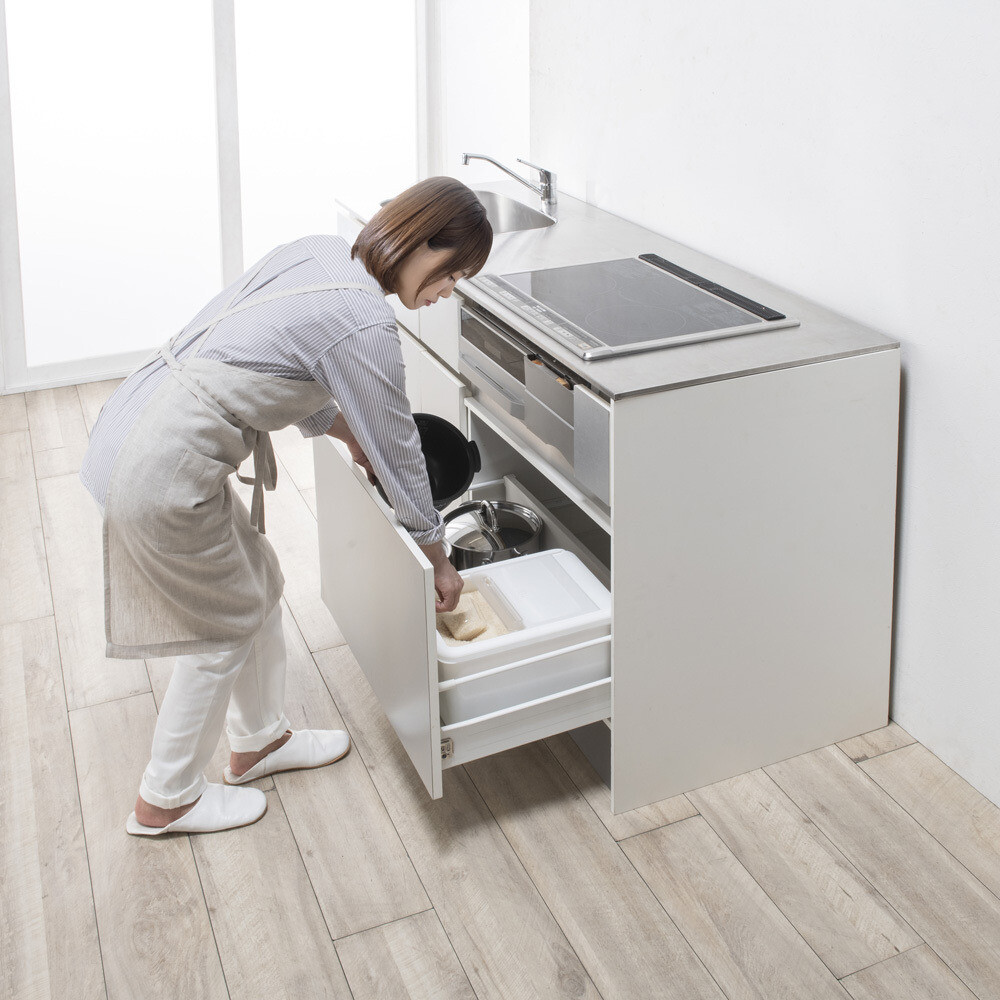 体に負担の無い絶妙な高さに米びつ収納用の引き出しがあり、楽な姿勢で作業ができます。 ※写真は(ア)ホワイトです。