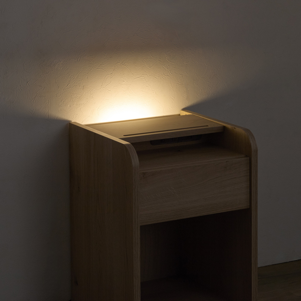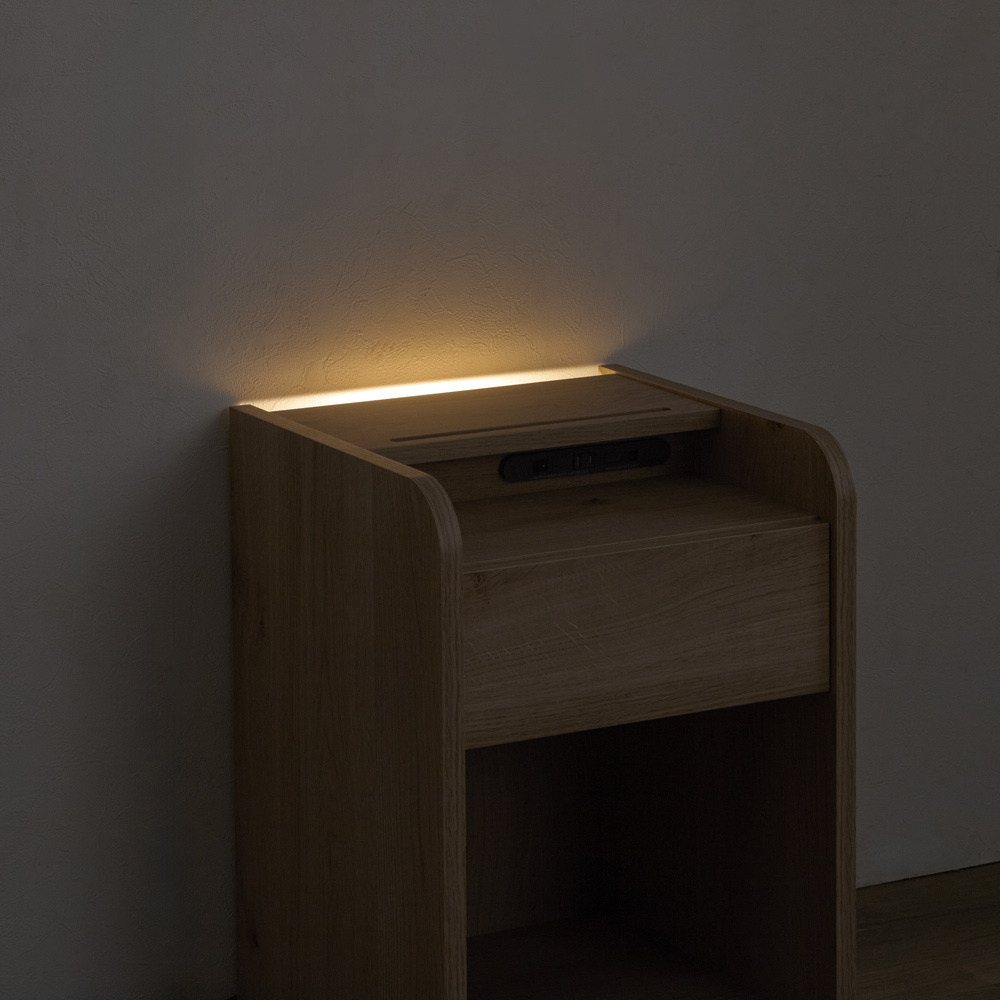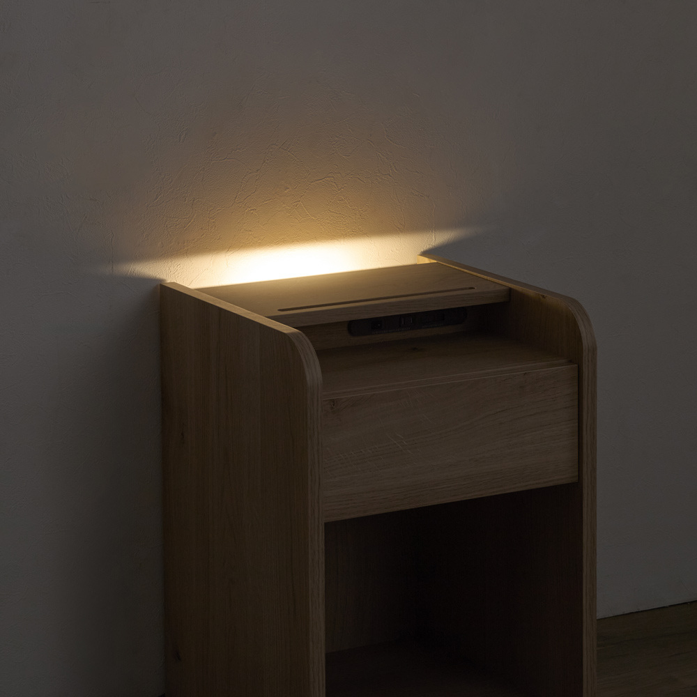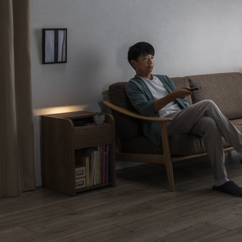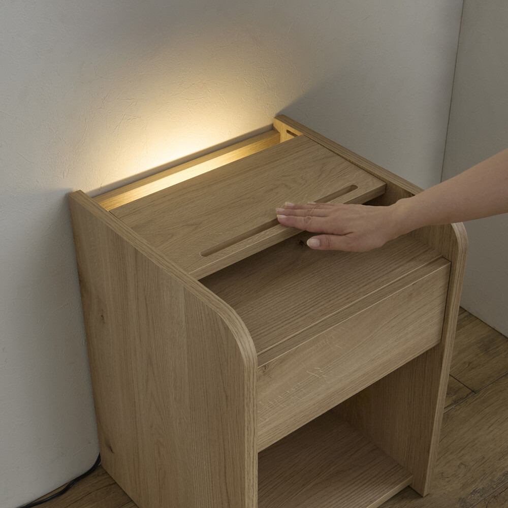 暗いお部屋をやさしく照らすLEDライト付きナイトテーブル。天板をスライドするだけで光量を調節でき、寝る前の読書は明るく、夜中のトイレは隣で寝ている人を起こさないよう控えめにするなど、シーンに合わせて明るさ調整が可能です。スマートにスマホの充電ができるコンセント&スマホスタンドが付いていたり、小物が収納できる便利な引き出し・本立ても付いているので、寝室はもちろんリビングでも活躍してくれること間違いなし!!オーク天板をスライドして明るさが調節できる! LEライトD内蔵のナイトテーブルちょっとだけ明かりがほしいときはありませんか? 上部にLED光源を内蔵しており、天板をスライドすることで光の量を調節し、シーンに合わせてお好みの明るさに変えられます。オーク明るさの調節は天板をスライドさせるだけメインスイッチを入れておいたら、あとは天板を軽くスライドさせるだけで、明るく、暗く、調節自在。光源にはLEDのテープライトを使っているので電気代もわずかですみます。オークシーンに合わせて、「いま必要な明るさ」で照らせます夜中にトイレに起きたり、赤ちゃんにミルクをあげたり、オムツを替えたり、寝ている人の横で読書したり。薄暗いと危ないけれど、明るすぎても困る…そんなシーンは意外にあるもの。いろんな場面で、そのときどきに必要な明るさで照らせます。オーク 写真は別売りの幅40cmタイプ寝室のほか、ソファサイドなどでも活躍電球色のやさしい光は、心が落ち着く間接照明としてリビングでも活躍。読書をするときはしっかり明るく、動画や会話を楽しむときなどは暗めに調節してムードよく。特別感のある時間と空間を演出できます。天板にはコンセントとUSB Type-Aの充電口を装備スマートフォンやタブレットの充電などにも便利。ホコリが入り込まないよう、コンセントにも、USB Type-Aの充電口にもスライドカバーが付いています。スマートフォンやタブレットを立てておけるスライド天板の手掛けの掘り込み部分にはスマートフォンやタブレットを立てることも。充電中も画面の時刻や通知を確認できます。小引き出しには眼鏡や手帳、美容グッズなどしまえて、すぐ手に取れるベッドまわりで使うこまごまとした物は、まとめて引き出しへ。すっきり収納できます。下部にはA4サイズの雑誌などが立てて収納できます寝る前にいつも読む雑誌や本などのほか、ルームフレグランスやコンパクトな防災グッズなどの置き場にも。写真上:幅30cmタイプ 写真下:幅40cmタイプ 写真左:オーク 写真右:ウォルナットカラーは(ア)オーク、(イ)ウォルナットの2カラーインテリアを選ばずお部屋に合わせやすい木目柄。(ア)オークはナチュラル感と明るい雰囲気が魅力。(イ)ウォルナットは重すぎない色味なので、落ち着いた雰囲気にも明るいお部屋にもマッチします。サイズも置きたい場所に応じて、幅30cmと幅40cmからお選びいただけます。