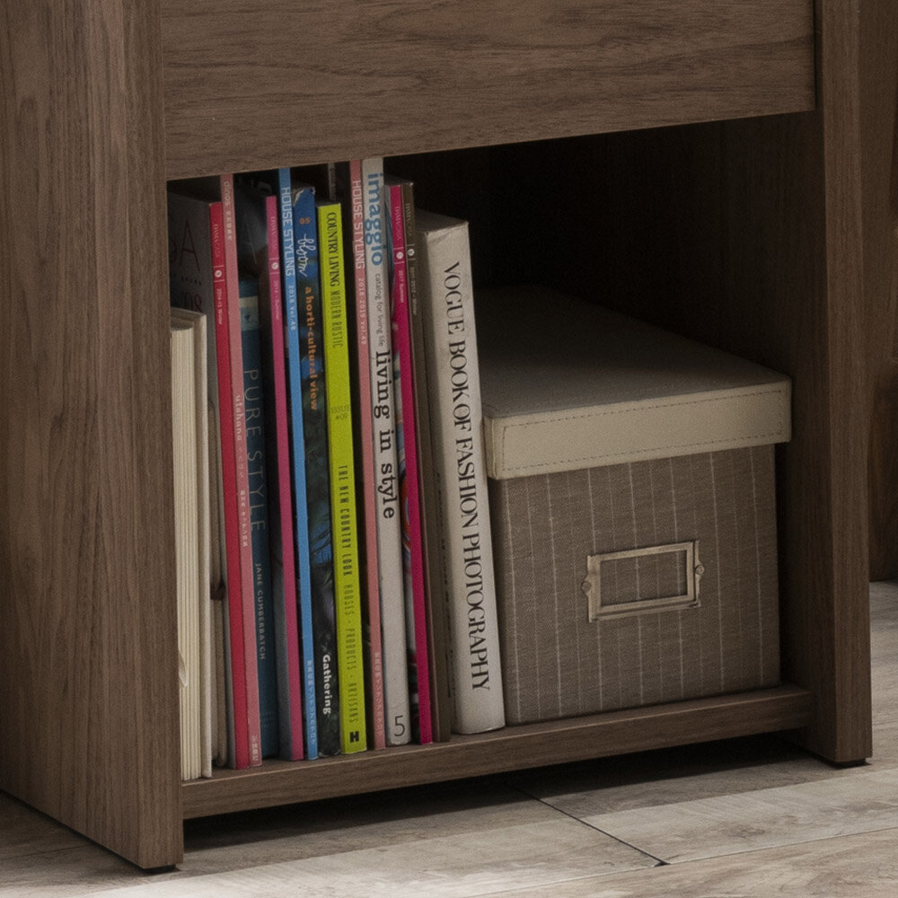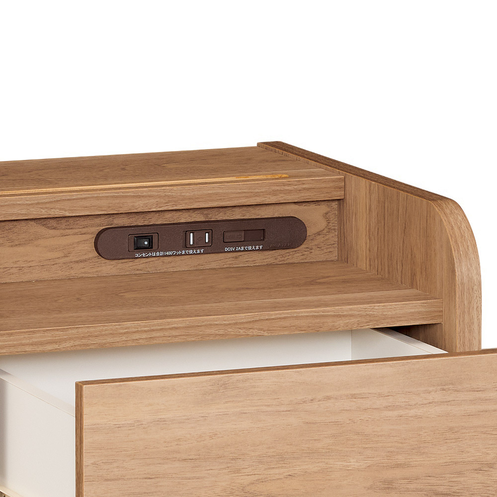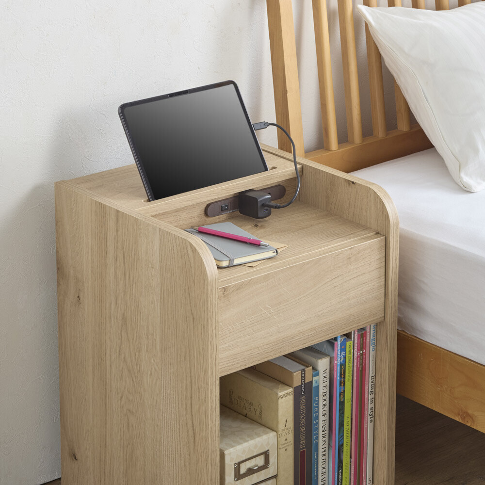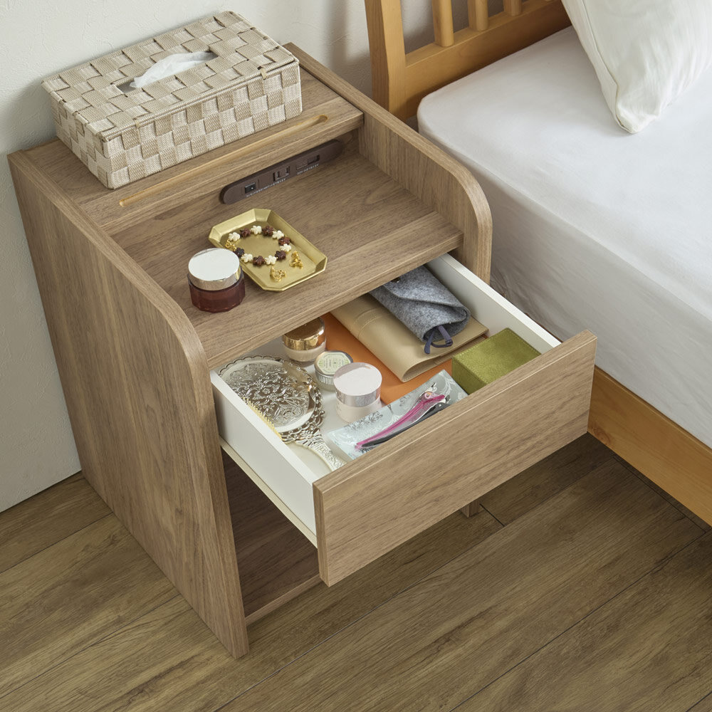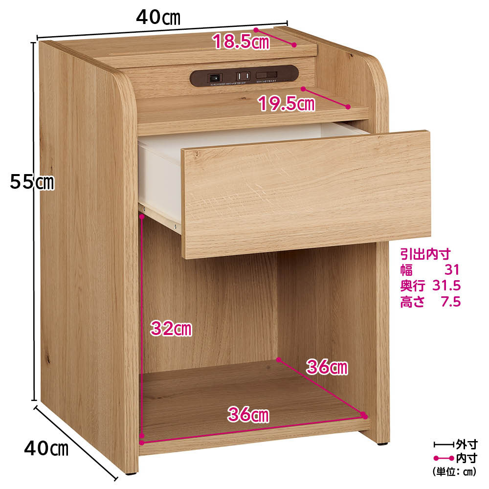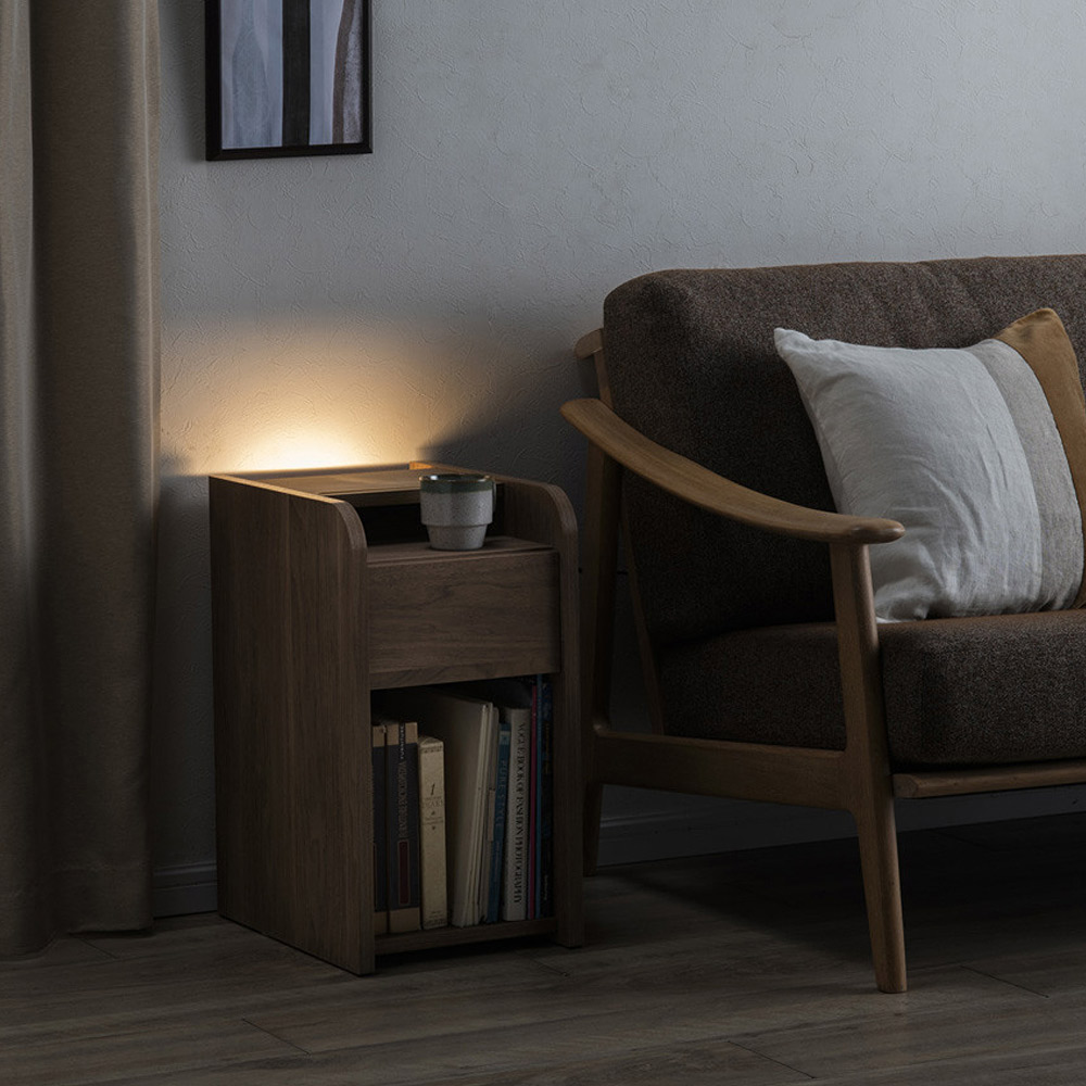 暗いお部屋をやさしく照らすLEDライト付きナイトテーブル。天板をスライドするだけで光量を調節でき、寝る前の読書は明るく、夜中のトイレは隣で寝ている人を起こさないよう控えめにするなど、シーンに合わせて明るさ調整が可能です。スマートにスマホの充電ができるコンセント&スマホスタンドが付いていたり、小物が収納できる便利な引き出し・本立ても付いているので、寝室はもちろんリビングでも活躍してくれること間違いなし!!オーク天板をスライドして明るさが調節できる! LEライトD内蔵のナイトテーブルちょっとだけ明かりがほしいときはありませんか? 上部にLED光源を内蔵しており、天板をスライドすることで光の量を調節し、シーンに合わせてお好みの明るさに変えられます。オーク明るさの調節は天板をスライドさせるだけメインスイッチを入れておいたら、あとは天板を軽くスライドさせるだけで、明るく、暗く、調節自在。光源にはLEDのテープライトを使っているので電気代もわずかですみます。オークシーンに合わせて、「いま必要な明るさ」で照らせます夜中にトイレに起きたり、赤ちゃんにミルクをあげたり、オムツを替えたり、寝ている人の横で読書したり。薄暗いと危ないけれど、明るすぎても困る…そんなシーンは意外にあるもの。いろんな場面で、そのときどきに必要な明るさで照らせます。オーク 写真は別売りの幅40cmタイプ寝室のほか、ソファサイドなどでも活躍電球色のやさしい光は、心が落ち着く間接照明としてリビングでも活躍。読書をするときはしっかり明るく、動画や会話を楽しむときなどは暗めに調節してムードよく。特別感のある時間と空間を演出できます。天板にはコンセントとUSB Type-Aの充電口を装備スマートフォンやタブレットの充電などにも便利。ホコリが入り込まないよう、コンセントにも、USB Type-Aの充電口にもスライドカバーが付いています。スマートフォンやタブレットを立てておけるスライド天板の手掛けの掘り込み部分にはスマートフォンやタブレットを立てることも。充電中も画面の時刻や通知を確認できます。小引き出しには眼鏡や手帳、美容グッズなどしまえて、すぐ手に取れるベッドまわりで使うこまごまとした物は、まとめて引き出しへ。すっきり収納できます。下部にはA4サイズの雑誌などが立てて収納できます寝る前にいつも読む雑誌や本などのほか、ルームフレグランスやコンパクトな防災グッズなどの置き場にも。写真上:幅30cmタイプ 写真下:幅40cmタイプ 写真左:オーク 写真右:ウォルナットカラーは(ア)オーク、(イ)ウォルナットの2カラーインテリアを選ばずお部屋に合わせやすい木目柄。(ア)オークはナチュラル感と明るい雰囲気が魅力。(イ)ウォルナットは重すぎない色味なので、落ち着いた雰囲気にも明るいお部屋にもマッチします。サイズも置きたい場所に応じて、幅30cmと幅40cmからお選びいただけます。