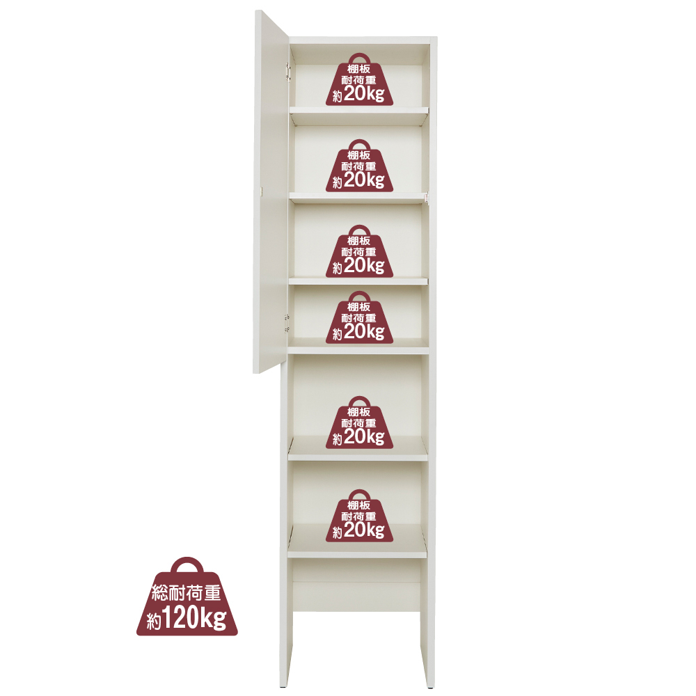 • 棚板は1段あたり約20kg、総耐荷重約120kgの頑丈設計。