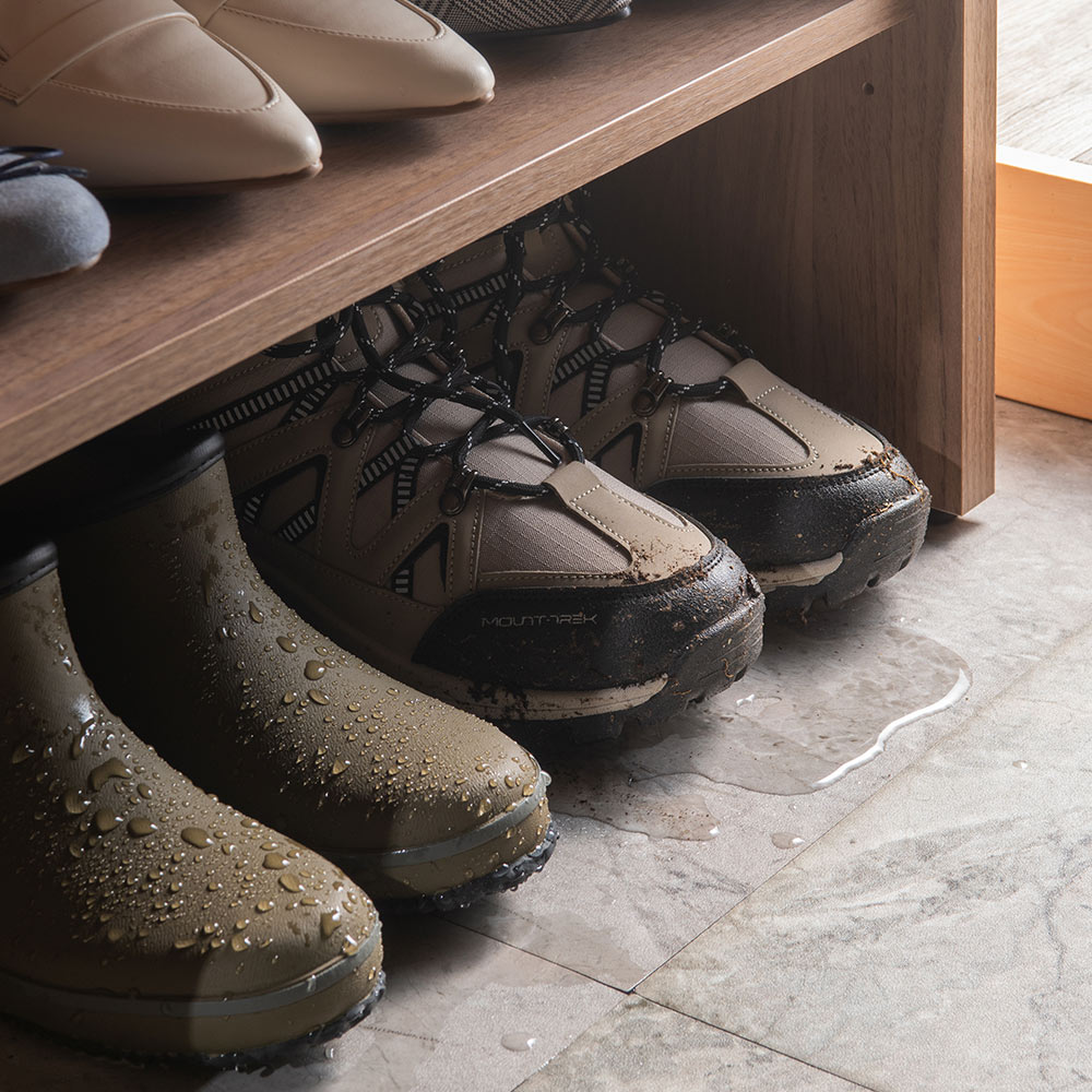 約1cmの高さ調整が出来るアジャスターで、段差のある玄関や、あと少しでブーツが入らないときなどにも微調整できます。 ※写真は幅60cm奥行30cmタイプ(ア)ウォルナットです。