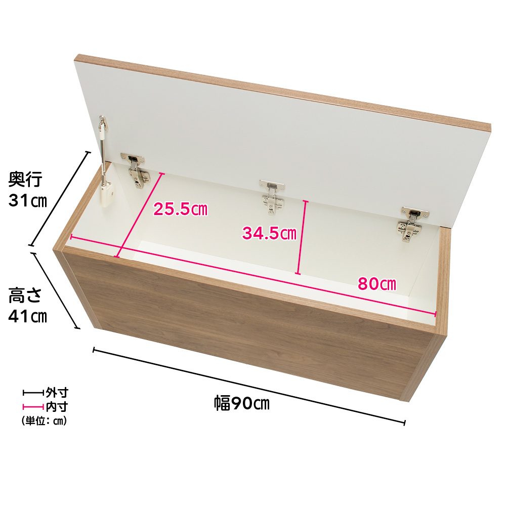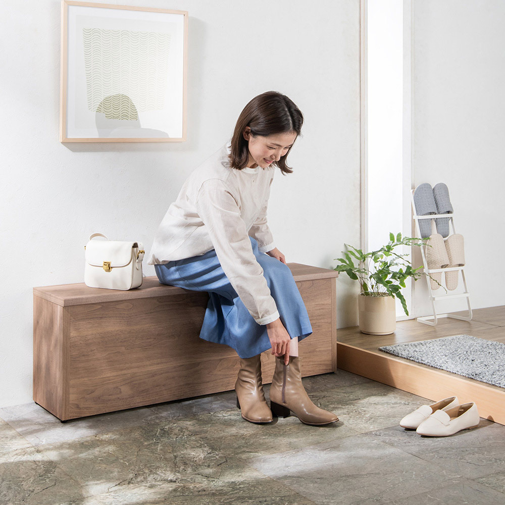 玄関スペースを利用して「たっぷり収納」&「腰掛けてラクラク靴が履ける」を実現する、大好評の収納庫付きベンチ。人気のボックスタイプに、ソフトクローズタイプが登場。ふたがゆっくり、静かに閉まる安心仕様です。幅90cmタイプは大きめの物も入る、使いやすいサイズ感です。収納&座れる1台2役のベンチで、玄関スペースを有効活用 (エ)ホワイト ※写真は奥行41cmタイプ室内に持ち込みたくない物をあれこれ置いてごちゃつきがちな玄関も、これ1台でスッキリ。ベンチとしても使えて狭い玄関でもスペースを有効活用できる、スペース効率抜群の「スペパカグ(R)」です。座ったり荷物をチョイ置きしたり、靴の脱ぎ履きも安心ラクラク(ウ)ウォルナット ※写真は別売りの幅115cm奥行31cmタイプひも靴やブーツの脱ぎ履きも座ってラクラク。床に置きたくない食品の買い物袋の一時置きや、お出かけ前の荷物を揃えて置いて忘れ物防止など、なにかと助かる1台です。防災用品やストック品、外で使う道具の収納など、用途はいろいろ (ウ)ウォルナット ※写真は別売りの幅115cm奥行31cmタイプ同シリーズには幅60cm、幅90cm、幅115cmの3タイプが揃っているので、防災リュックや水のストックから、外遊びのボール、釣り竿など長めのものまでしまえて便利。ふたがゆっくり閉まるから、お子さまにも安心です (エ)ホワイト ※写真は別売りの幅115cm奥行41cmタイプご要望の多かった、ふたがゆっくり静かに閉まるソフトクローズ機能を新たに搭載。お子さまのおもちゃ入れなどにも、どうぞ。片側1ヵ所にソフトダンパーを付けました (エ)ホワイト誤ってふたから手が離れても急に閉まらないので安心。開閉音も静かです。細部まで使う人にやさしい丁寧なつくり。信頼の日本製です左上:天板の角は丸みがあり、脚あたりのよい仕上げ。右上:傷や汚れが目立ちにくく、お手入れも簡単。左下:背面も美しい化粧仕上げなので、壁付けしない使い方もOK。右下:床の傾きや段差を調整できる約1cmのアジャスター付き。インテリアに合わせやすい4色をご用意左上:(ア)ナチュラル 、右上:(イ)ダークブラウン、左下: (ウ)ウォルナット、右下: (エ)ホワイト選べる奥行2タイプ。内側は収納品にやさしい化粧仕上げです写真上:奥行31cmタイプ 写真下:奥行41cmタイプ奥行は、スリムな31cmと、より収納力が高い41cmの2タイプをご用意。余計な仕切りがないので、大きめの物も入ります。届いてすぐ使える完成品。置くだけで、まるでリフォームしたような素敵空間に(イ)ダークブラウン ※写真左は別売りの幅60cm奥行31cm、右は幅90cm奥行31cmタイプ1台ではもちろん、サイズ違いなど複数台を組み合わせても。ふた開閉式なのでコーナーもムダなく収納に使え、造り付けのようになじみます。片付かない玄関にストレスを感じていた方も、解決方法のひとつとしてご検討ください。ディノスの「スペパカグ(R)」とは?スペパは、スペース・パフォーマンスの略語で、スペース効率を重視するという考え方。「スペパカグ(R)」は「くらしのすき間を埋める」を合言葉に、ディノスが発案する家具の新ジャンルです。