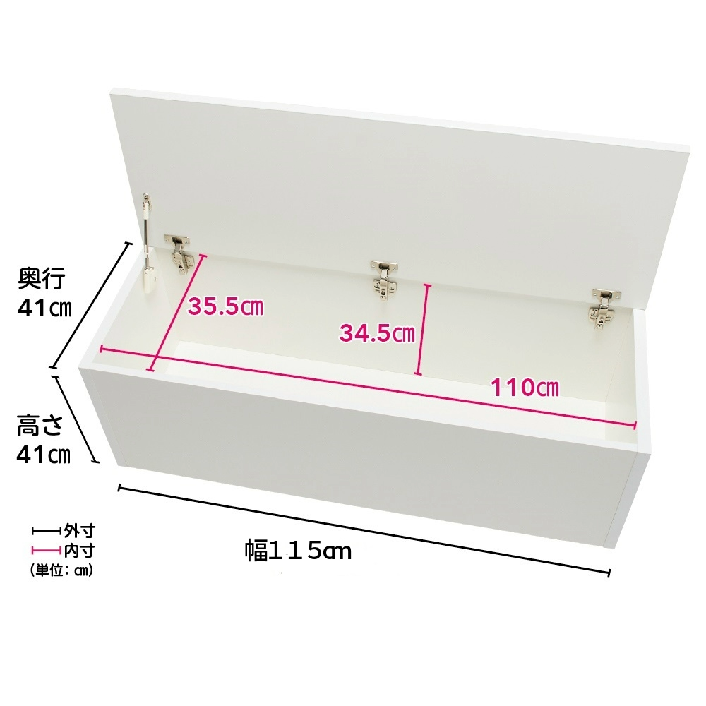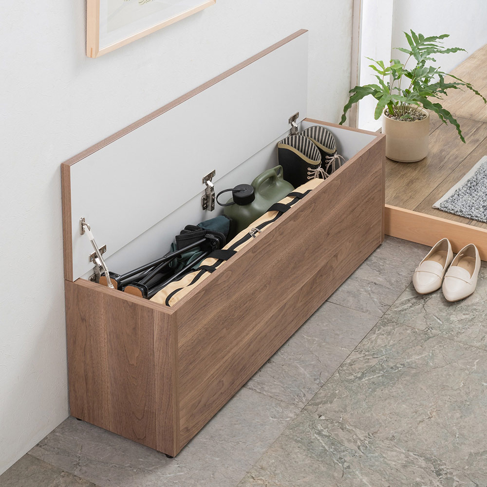 玄関スペースを利用して「たっぷり収納」&「腰掛けてラクラク靴が履ける」を実現する、大好評の収納庫付きベンチ。人気のボックスタイプに、ソフトクローズタイプが登場。ふたがゆっくり、静かに閉まる安心仕様です。より容量が大きいものを、というお声にお応えして、幅115cmタイプが加わりました。収納&座れる1台2役のベンチで、玄関スペースを有効活用 (ウ)ウォルナットベンチとして座れて、玄関周りにあふれる物もこれ1台できれいに片付く、狭い玄関スペースも有効活用できるスペース効率抜群の「スペパカグ(R)」です。靴の脱ぎ履きも座ってラクラクできて安心です。玄関をスッキリ整理、荷物のチョイ置きもできて便利(エ)ホワイト ※写真は別売りの幅90cm奥行41cmタイプ室内に持ち込みたくない物をあれこれ置いてごちゃつきがちな玄関も、これ1台でスッキリ。ほかにも、お出かけ前の荷物を揃えて置いて忘れ物防止、床に置きたくない食品の買い物袋の一時置きになど、物を置いたりちょっとした作業にも使えて便利な、なにかと助かる1台です。防災用品やストック品、外で使う道具の収納など、用途はいろいろ (ウ)ウォルナット ※写真は奥行31cmタイプ同シリーズには幅60cm、幅90cm、幅115cmの3タイプが揃っているので、防災リュックや水のストックから、外遊びのボール、釣り竿など長めのものまでしまえて便利。ふたがゆっくり閉まるから、お子さまにも安心です (エ)ホワイト ※写真は奥行41cmタイプご要望の多かった、ふたがゆっくり静かに閉まるソフトクローズ機能を新たに搭載。お子さまのおもちゃ入れなどにも、どうぞ。片側1ヵ所にソフトダンパーを付けました (エ)ホワイト誤ってふたから手が離れても急に閉まらないので安心。開閉音も静かです。細部まで使う人にやさしい丁寧なつくり。信頼の日本製です左上:天板の角は丸みがあり、脚あたりのよい仕上げ。右上:背面も美しい化粧仕上げで、壁付けしない使い方もOK。左下:床の傾きや段差を調整できる約1cmのアジャスター付き。右下:傷や汚れが目立ちにくく、お手入れも簡単。インテリアに合わせやすい4色をご用意左上:(ア)ナチュラル、右上: (イ)ダークブラウン 、左下:(ウ)ウォルナット、右下: (エ)ホワイト選べる奥行2タイプ。内側は収納品にやさしい化粧仕上げです写真上:奥行31cmタイプ 写真下:奥行41cmタイプ奥行も、スリムな31cmと、より収納力が高い41cmの2タイプをご用意。余計な仕切りがないので、長い物も入ります。届いてすぐ使える完成品。置くだけで、まるでリフォームしたような素敵空間に※写真左は別売りの幅60cm奥行31cm、右は別売りの幅90cm奥行31cmタイプ1台ではもちろん、サイズ違いなど複数台を組み合わせても。ふた開閉式なのでコーナーもムダなく収納に使え、造り付けのようになじみます。片付かない玄関にストレスを感じていた方も、解決方法のひとつとしてご検討ください。ディノスの「スペパカグ(R)」とは?スペパは、スペース・パフォーマンスの略語で、スペース効率を重視するという考え方。「スペパカグ(R)」は「くらしのすき間を埋める」を合言葉に、ディノスが発案する家具の新ジャンルです。