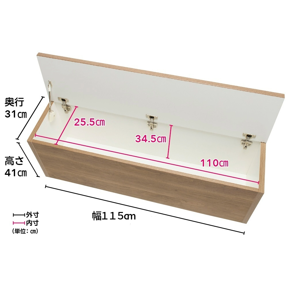 (ウ)ウォルナット ご要望の多かった「フタがゆっくり静かに閉まるソフトクローズダンパー仕様」&「長物も収納できる幅115cmのロングタイプ」が新登場。 ※写真は幅115cm奥行31cmタイプです。