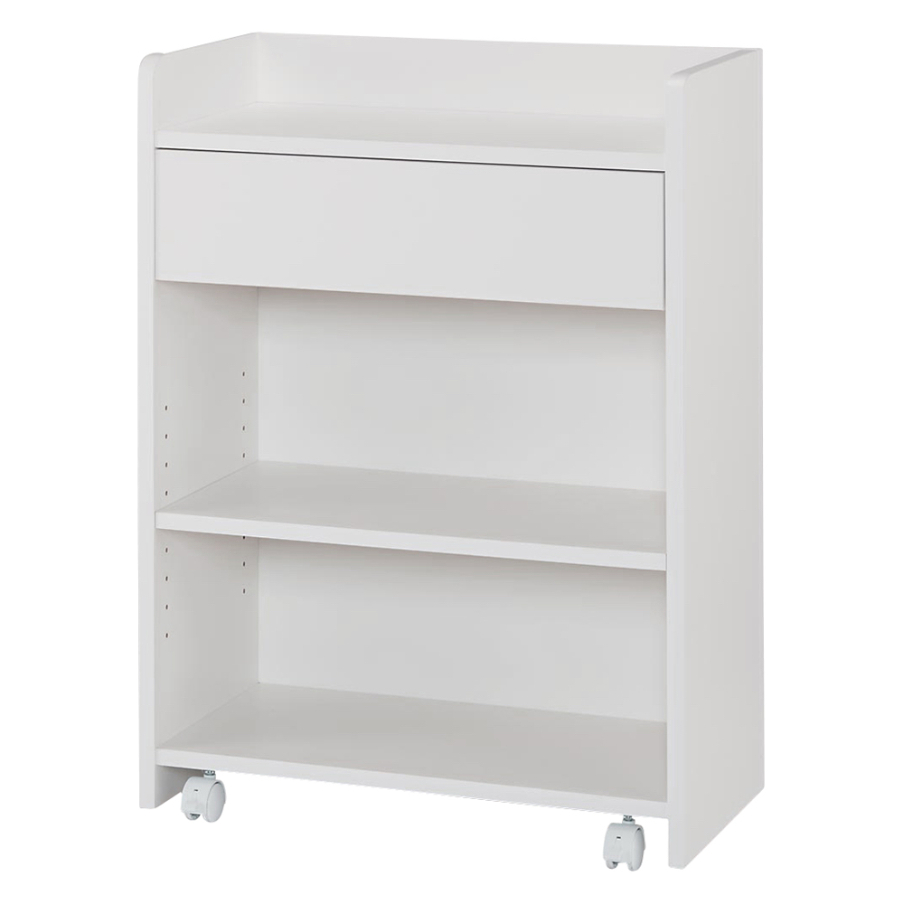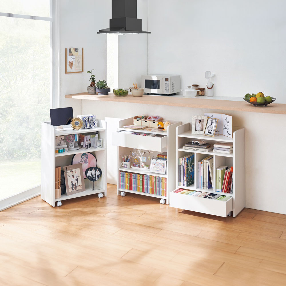 使いたい場所に移動自在。収納したまま動かせる便利なカウンター下収納ワゴンです。背面化粧仕上げで裏返せばすっきり目隠し収納できます。ホワイトと天然木調のおしゃれな色展開も魅力です。在宅勤務、テレワークにも最適。使用例(左から棚タイプ幅59高さ80cm、小引き出しタイプ幅59高さ80cm、マルチタイプ幅59高さ80cm)クルッと裏返せばサッと目隠し背面まできれいな化粧仕上げの隠しキャスター付きの収納庫。ワゴン感覚で簡単に移動することができます。小引き出しタイプ ホワイト 幅59高さ80cm(お届け商品)(図の単位cm、赤字は内寸)小物収納に便利な「小引き出しタイプ」メガネやペン、キッチン周りであればカトラリーなど小物の整理整頓に便利な引き出し付きタイプ。引き出し下はオープンラックになっており、本棚としても。高さは66cm・80cmの2タイプから、幅は59cm・79cmの2タイプからお選びいただけます。カラーはホワイト・ブラウンの2色。使用例(右から棚タイプ幅79高さ80cm、小引き出しタイプ幅79高さ80cm、マルチタイプ幅79高さ80cm)カトラリーや食器、食材のストック収納につい増えてしまい収納場所に困るカトラリーやコップ、取り皿の収納や、お菓子や調味料などダイニングテーブルの近くにあれば便利なものの指定席に。天板にも物が置けるため一時的な台としても使えます。使用例(左から棚タイプ幅79高さ66cm、小引き出しタイプ幅79高さ66cm、マルチタイプ幅79高さ66cm)テレワーク用の収納としてテレワークをする機会が増えたけど場所がなくダイニングでしているという方にもおすすめ。引き出し付のタイプを使えば文房具など細々したものも収納できます。テレワークが終わればカウンター下に収めるだけ。ダイニングがごちゃつかず片付けも簡単です。使用例(左から棚タイプ幅59高さ80cm、小引き出しタイプ幅59高さ80cm、マルチタイプ幅59高さ80cm)推しの収納にも簡単にで目隠しできるため推しのグッズ収納としても。普段はきれいにディスプレイ収納し来客時などはサッと目隠しできます。使用例(左から小引き出しタイプ幅79高さ66cm、棚タイプ幅79高さ66cm、マルチタイプ幅79高さ66cm)子どものおもちゃやリビング収納にも大活躍カウンター下以外にも散らかりがちな子供のおもちゃの収納や、リビング収納としても活躍します。上部の角は丸みのある仕上げでお子様のいる家庭でも安心して使用できます。裏返せば見た目スッキリ背面化粧仕上げで、くるっと裏返せばすっきり目隠し収納。生活感も隠せます。外から見えにくい隠しキャスター背面からはキャスターが見えない仕様で、見た目もキレイ(お客さまにてキャスター取付となります)。※写真は小引き出しタイプ幅79高さ80cm文房具などの収納に便利な小引き出し小引出しタイプ幅59cmの引出し内寸は、幅52.5高さ8.5奥行24cmです。※写真は棚タイプ幅79高さ80cm棚板の高さは調整可能小引き出しタイプワゴンの棚板は、3cm間隔で調整可能です。高さ66cmタイプは3cmピッチ5段階、高さ80cmタイプは3cmピッチ9段階で高さ調整可能。