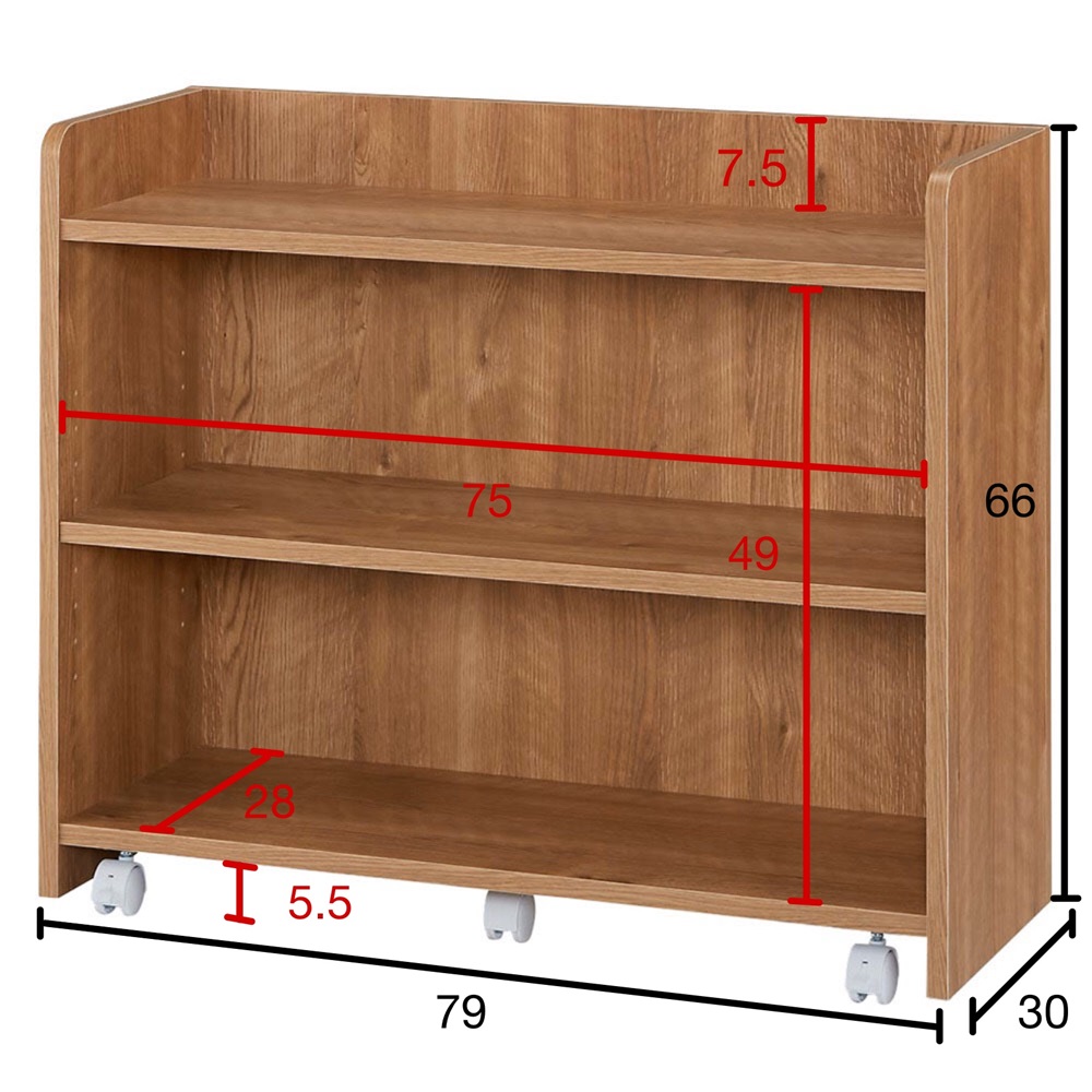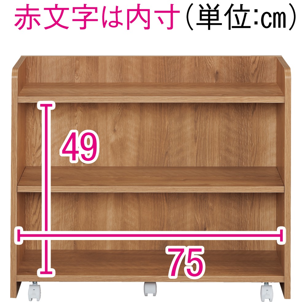 使いたい場所に移動自在。収納したまま動かせる便利なカウンター下収納ワゴンです。背面化粧仕上げで裏返せばすっきり目隠し収納できます。ホワイトと天然木調のおしゃれな色展開も魅力です。在宅勤務、テレワークにも最適。使用例(左から小引き出しタイプ幅79高さ66cm、棚タイプ幅79高さ66cm、マルチタイプ幅79高さ66cm)クルッと裏返せばサッと目隠し背面まできれいな化粧仕上げの隠しキャスター付きの収納庫。ワゴン感覚で簡単に移動することができます。棚タイプ ブラウン 幅79高さ66cm(お届け商品)(図の単位cm、赤字は内寸)雑貨収納・本棚として使いやすい「棚タイプ」シンプルなラックタイプで、小物や雑貨はもちろんノートや雑誌などを収納する本棚としても便利。高さは66cm・80cmの2タイプから、幅は59cm・79cmの2タイプからお選びいただけます。カラーはホワイト・ブラウンの2色。使用例(右から棚タイプ幅79高さ80cm、小引き出しタイプ幅79高さ80cm、マルチタイプ幅79高さ80cm)カトラリーや食器、食材のストック収納につい増えてしまい収納場所に困るカトラリーやコップ、取り皿の収納や、お菓子や調味料などダイニングテーブルの近くにあれば便利なものの指定席に。天板にも物が置けるため一時的な台としても使えます。使用例(左から棚タイプ幅79高さ66cm、小引き出しタイプ幅79高さ66cm、マルチタイプ幅79高さ66cm)テレワーク用の収納としてテレワークをする機会が増えたけど場所がなくダイニングでしているという方にもおすすめ。引き出し付のタイプを使えば文房具など細々したものも収納できます。テレワークが終わればカウンター下に収めるだけ。ダイニングがごちゃつかず片付けも簡単です。使用例(左から棚タイプ幅59高さ80cm、小引き出しタイプ幅59高さ80cm、マルチタイプ幅59高さ80cm)推しの収納にも簡単にで目隠しできるため推しのグッズ収納としても。普段はきれいにディスプレイ収納し来客時などはサッと目隠しできます。使用例(左から小引き出しタイプ幅79高さ66cm、棚タイプ幅79高さ66cm、マルチタイプ幅79高さ66cm)子どものおもちゃやリビング収納にも大活躍カウンター下以外にも散らかりがちな子供のおもちゃの収納や、リビング収納としても活躍します。天板もゆったりしているので、子供部屋やリビングでランドセルラックとしての使用もおすすめ。上部の角は丸みのある仕上げでお子様のいる家庭でも安心して使用できます。裏返せば見た目スッキリ背面化粧仕上げで、くるっと裏返せばすっきり目隠し収納。生活感も隠せます。外から見えにくい隠しキャスター背面からはキャスターが見えない仕様で、見た目もキレイ(お客さまにてキャスター取付となります)。※写真は棚タイプ幅79高さ80cm棚板の高さは調整可能棚タイプワゴンの棚板は、3cm間隔で調整可能です。高さ66cmタイプは3cmピッチ9段階、高さ80cmタイプは3cmピッチ13段階で高さ調整可能。