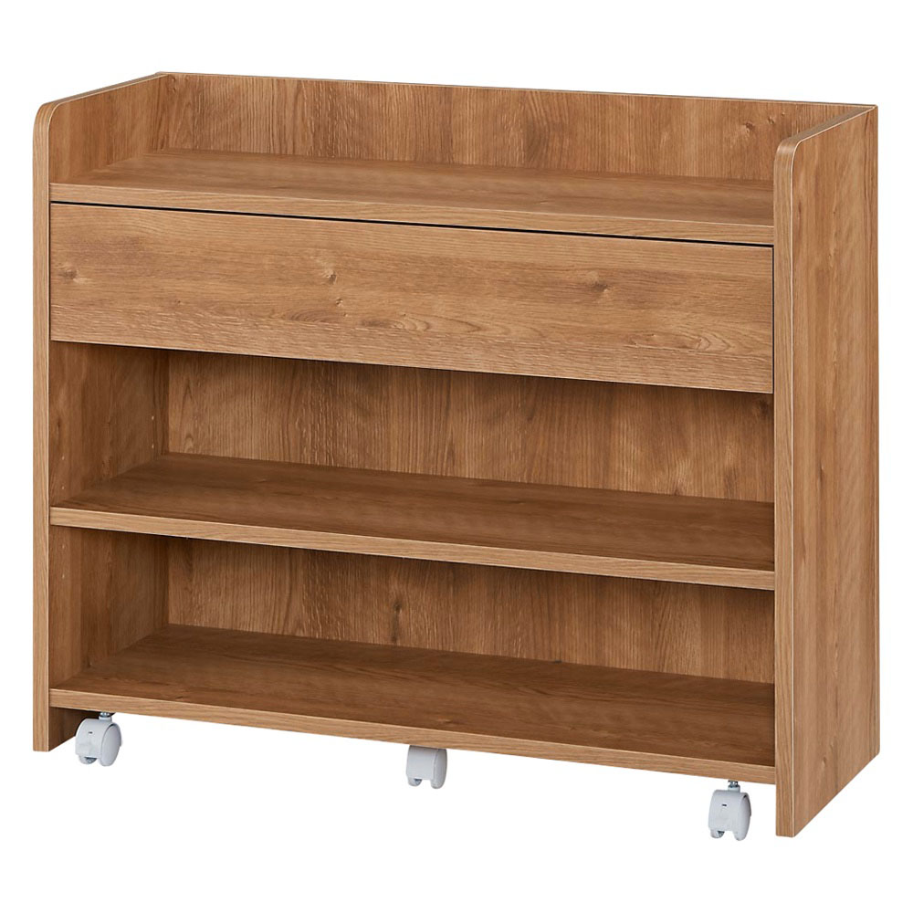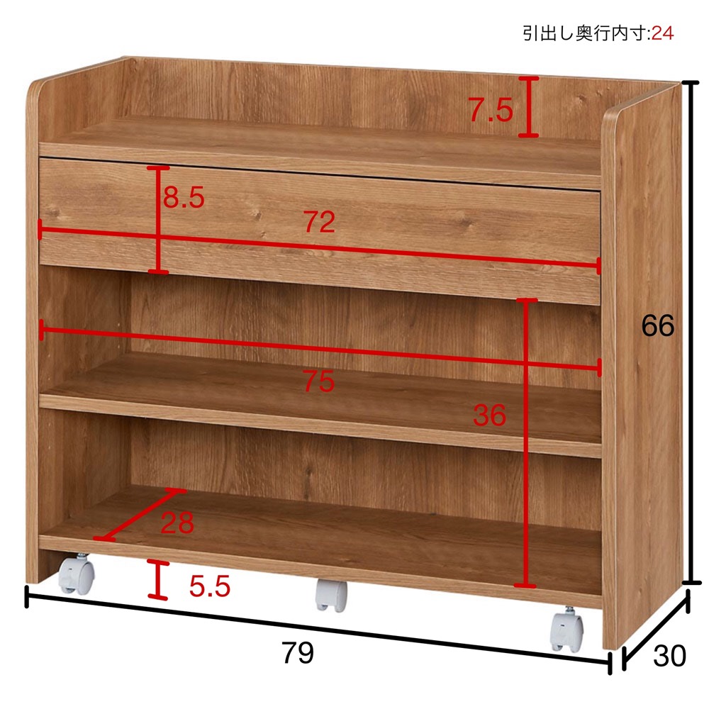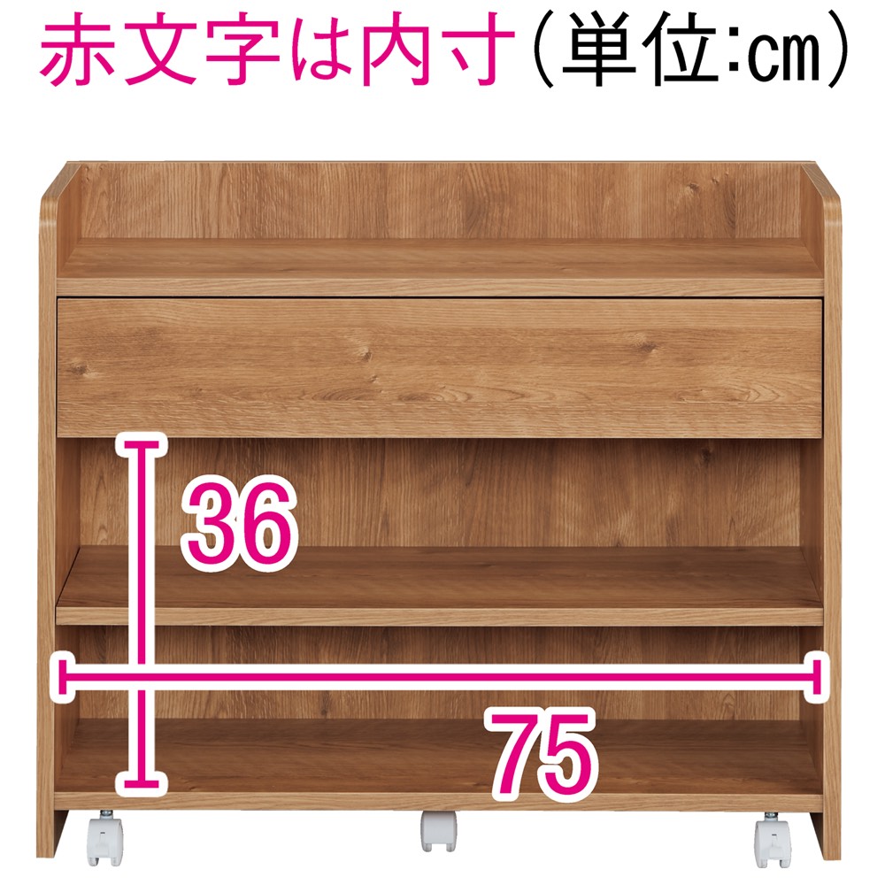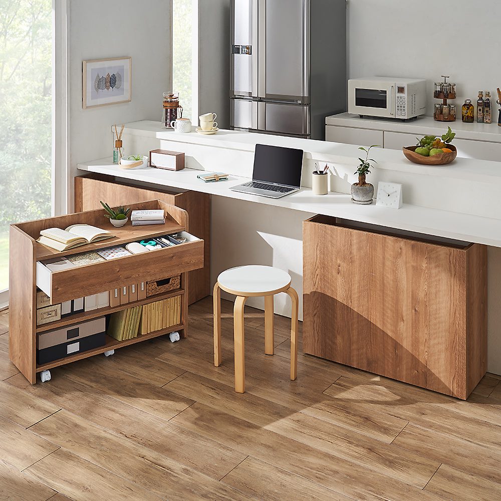 使いたい場所に移動自在。収納したまま動かせる便利なカウンター下収納ワゴンです。背面化粧仕上げで裏返せばすっきり目隠し収納できます。ホワイトと天然木調のおしゃれな色展開も魅力です。在宅勤務、テレワークにも最適。使用例(左から棚タイプ幅79高さ66cm、小引き出しタイプ幅79高さ66cm、マルチタイプ幅79高さ66cm)クルッと裏返せばサッと目隠し背面まできれいな化粧仕上げの隠しキャスター付きの収納庫。ワゴン感覚で簡単に移動することができます。小引き出しタイプ ブラウン 幅79高さ66cm(お届け商品)(図の単位cm、赤字は内寸)小物収納に便利な「小引き出しタイプ」メガネやペン、キッチン周りであればカトラリーなど小物の整理整頓に便利な引き出し付きタイプ。引き出し下はオープンラックになっており、本棚としても。高さは66cm・80cmの2タイプから、幅は59cm・79cmの2タイプからお選びいただけます。カラーはホワイト・ブラウンの2色。使用例(右から棚タイプ幅79高さ80cm、小引き出しタイプ幅79高さ80cm、マルチタイプ幅79高さ80cm)カトラリーや食器、食材のストック収納につい増えてしまい収納場所に困るカトラリーやコップ、取り皿の収納や、お菓子や調味料などダイニングテーブルの近くにあれば便利なものの指定席に。天板にも物が置けるため一時的な台としても使えます。使用例(左から棚タイプ幅79高さ66cm、小引き出しタイプ幅79高さ66cm、マルチタイプ幅79高さ66cm)テレワーク用の収納としてテレワークをする機会が増えたけど場所がなくダイニングでしているという方にもおすすめ。引き出し付のタイプを使えば文房具など細々したものも収納できます。テレワークが終わればカウンター下に収めるだけ。ダイニングがごちゃつかず片付けも簡単です。使用例(左から棚タイプ幅59高さ80cm、小引き出しタイプ幅59高さ80cm、マルチタイプ幅59高さ80cm)推しの収納にも簡単にで目隠しできるため推しのグッズ収納としても。普段はきれいにディスプレイ収納し来客時などはサッと目隠しできます。使用例(左から小引き出しタイプ幅79高さ66cm、棚タイプ幅79高さ66cm、マルチタイプ幅79高さ66cm)子どものおもちゃやリビング収納にも大活躍カウンター下以外にも散らかりがちな子供のおもちゃの収納や、リビング収納としても活躍します。上部の角は丸みのある仕上げでお子様のいる家庭でも安心して使用できます。小引き出しタイプ幅79高さ80cm文房具などの収納に便利な小引き出し※写真は棚タイプ幅79高さ80cm棚板の高さは調整可能小引き出しタイプワゴンの棚板は、3cm間隔で調整可能です。高さ66cmタイプは3cmピッチ5段階、高さ80cmタイプは3cmピッチ9段階で高さ調整可能。