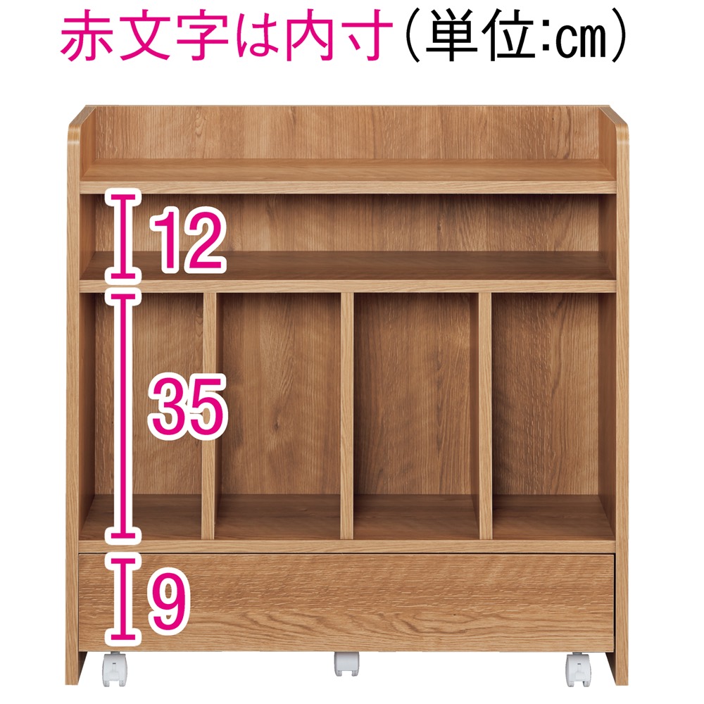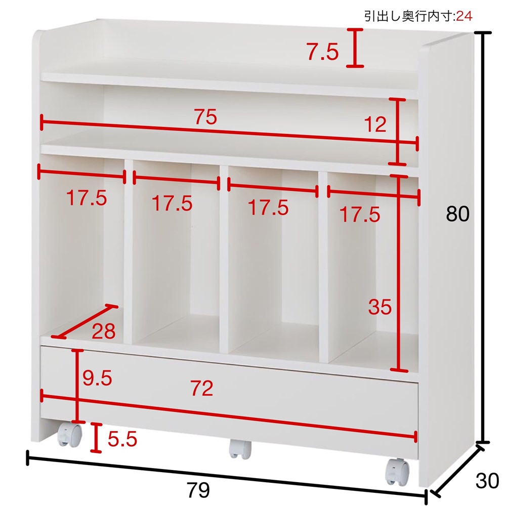 使いたい場所に移動自在。収納したまま動かせる便利なカウンター下収納ワゴンです。背面化粧仕上げで裏返せばすっきり目隠し収納できます。ホワイトと天然木調のおしゃれな色展開も魅力です。在宅勤務、テレワークにも最適。使用例(左から棚タイプ幅79高さ80cm、マルチタイプ幅79高さ80cm、小引き出しタイプ幅79高さ80cm)クルッと裏返せばサッと目隠し背面まできれいな化粧仕上げの隠しキャスター付きの収納庫。ワゴン感覚で簡単に移動することができます。マルチタイプ ホワイト 幅79高さ80cm(お届け商品)(図の単位cm、赤字は内寸)オープン収納・引き出し付きの「マルチタイプ」ちょっと置きできるオープン部と整理に便利な引き出し、分類収納しやすい縦仕切りのついたラックがついたワゴン。高さは66cm・80cmの2タイプから、幅は59cm・79cmの2タイプからお選びいただけます。カラーはホワイト・ブラウンの2色。使用例(右から棚タイプ幅79高さ80cm、小引き出しタイプ幅79高さ80cm、マルチタイプ幅79高さ80cm)カトラリーや食器、食材のストック収納につい増えてしまい収納場所に困るカトラリーやコップ、取り皿の収納や、お菓子や調味料などダイニングテーブルの近くにあれば便利なものの指定席に。天板にも物が置けるため一時的な台としても使えます。使用例(左から棚タイプ幅79高さ66cm、小引き出しタイプ幅79高さ66cm、マルチタイプ幅79高さ66cm)テレワーク用の収納としてテレワークをする機会が増えたけど場所がなくダイニングでしているという方にもおすすめ。引き出し付のタイプを使えば文房具など細々したものも収納できます。テレワークが終わればカウンター下に収めるだけ。ダイニングがごちゃつかず片付けも簡単です。使用例(左から棚タイプ幅59高さ80cm、小引き出しタイプ幅59高さ80cm、マルチタイプ幅59高さ80cm)推しの収納にも簡単にで目隠しできるため推しのグッズ収納としても。普段はきれいにディスプレイ収納し来客時などはサッと目隠しできます。使用例(左から小引き出しタイプ幅79高さ66cm、棚タイプ幅79高さ66cm、マルチタイプ幅79高さ66cm)子どものおもちゃやリビング収納にも大活躍カウンター下以外にも散らかりがちな子供のおもちゃの収納や、リビング収納としても活躍します。天板もゆったりしているので、子供部屋やリビングでランドセルラックとしての使用もおすすめ。上部の角は丸みのある仕上げでお子様のいる家庭でも安心して使用できます。裏返せば見た目スッキリ背面化粧仕上げで、くるっと裏返せばすっきり目隠し収納。生活感も隠せます。外から見えにくい隠しキャスター背面からはキャスターが見えない仕様で、見た目もキレイ(お客さまにてキャスター取付となります)。※写真は小引き出しタイプ幅79高さ80cm文房具などの収納に便利な小引き出しマルチタイプ幅79cmの引出し内寸は、幅72高さ9.5奥行24cmです。マルチタイプはワゴン下部に引出しがあります。
