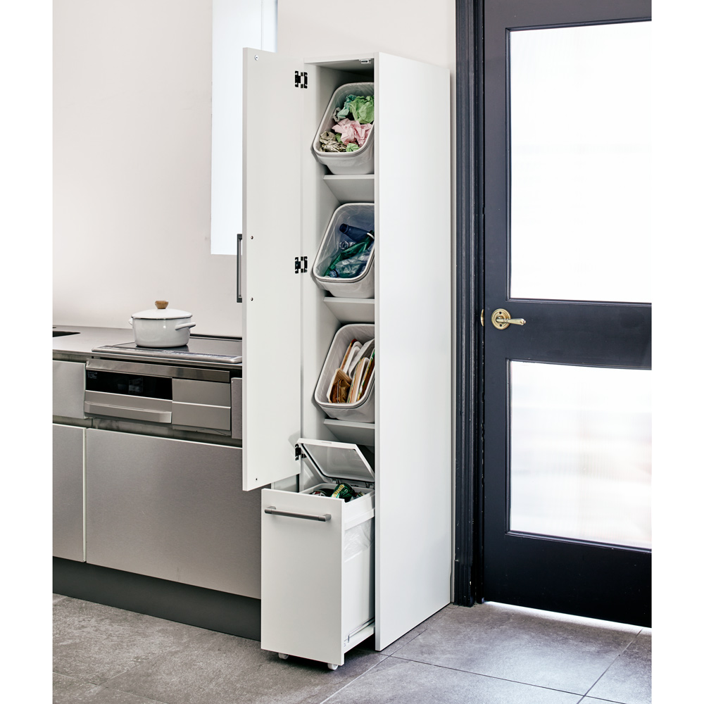 幅28.5cm!キッチンのちょっとしたすき間に設置できる隙間収納ゴミ箱。分別しやすいタワー型のごみ箱は組立不要の国産品。キッチン収納・すき間収納のアイデアをいかした機能的な4分別ごみ箱です。使用例:ホワイト 4分別 幅28.5 奥行53 高さ180.5cm(お届け商品)すき間収納にぴったり!スリムなタワー型分別ゴミ箱キッチンのすき間に設置できる、分別しやすいタワー型のゴミ箱です。縦に設置されたペール(ゴミ箱)で、省スペースでゴミの分別ができます。圧迫感を持たせないハイタイプのすき間家具。転倒防止バンド付きで安心感があります。扉は左開き、右開きどちらにも取り付け可能!使用例:ホワイト 4分別 幅36.5cmタイプ場所に合わせて選べるシリーズ品資源ごみの分別に対応する多分別のゴミ箱。使用場所や分別数に合わせて、4分別タイプ2種類、5分別タイプ1種類をご用意。4分別(スリム):幅28.5 奥行53 高さ180.5cm(ペール:15L×3・20L×1)4分別:幅36.5 奥行45 高さ153.5cm(ペール:15L×3・20L×1)5分別:幅36.5 奥行45 高さ180.5cm(ペール:15L×4・20L×1)使用例:ダークブラウン 5分別 幅36.5cmタイプ手軽に細かくゴミ分別ができます上段は斜め置きのペールを配置。ゴミ袋がサッと出せて処理が簡単。上段の1枚扉でペールを目隠しできます。※扉を全開するためには39cmのスペースが必要です。最下段はキャスター付きワゴン。調理中に足元に移動させて、その場ですぐにゴミ捨てが可能です。上段の扉を閉めたままでもワゴンを引き出せます。キャスター付きワゴンで移動もラクラク最下段はキャスター付きワゴンタイプで、前後にラクに動かせます。仕切り付きのワゴンに、ゴミ袋も収納OK!ワゴン内に仕切り付き。ペールの奥に、予備のゴミ袋を収納できる便利な設計です。取り外し簡単で、洗えるペール上段とワゴン部のペールはポリプロピレン製。取り外して洗えるので、清潔に保てます。画像左上・右上:15Lペール、左下・右下:20Lペール使い勝手の良い2種類のペールペールにはゴミ袋を固定できるストッパー付き。最下段の20Lペールは、ワンプッシュで簡単に開閉できます。指が汚れていても手の甲などで開けられて便利です。上段用(扉内部)フタ無し15Lペール:幅30cm×奥行19cm×高さ37cm最下段用 (ワゴン内部)フタ付き20Lペール:幅30cm×奥行22cm×高さ42cm上段のゴミ箱を支える固定材内部には、ペールをしっかり支える固定材があり安心。壁にぴったり設置して、空間をムダなく活用!1.5cm×10cmの幅木よけがあるので、壁にぴったり設置できます。右:ホワイト、左:ダークブラウン 4分別 幅28.5cmタイプ(お届け商品)ゴミ箱に見えない、シンプルなデザイン壁面になじむシンプルなデザインで、キッチンのすき間をスッキリ埋めます。色はホワイト、ダークブラウンの2色展開。前面、側面にハードコート紙を使用し、本体内部まで化粧仕上げをしているので、汚れてもお手入れ簡単。組立不要の国産品です。