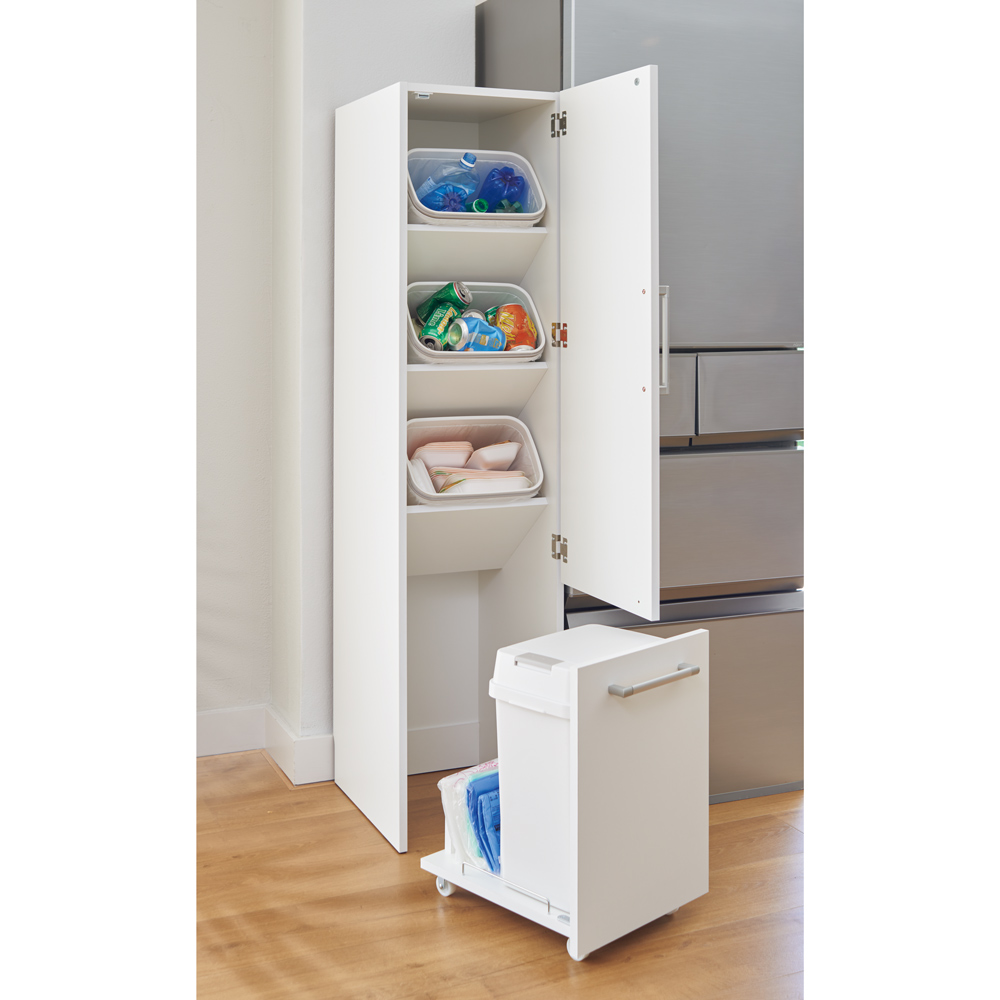 幅36.5cm!キッチンのちょっとしたすき間に設置できる隙間収納ゴミ箱。分別しやすいタワー型のごみ箱は組立不要の国産品。キッチン収納・すき間収納のアイデアをいかした機能的な4分別ごみ箱です。使用例:ホワイト 4分別 幅36.5 奥行45 高さ153.5cm(お届け商品)すき間収納にぴったり!スリムなタワー型分別ゴミ箱キッチンのすき間に設置できる、分別しやすいタワー型のゴミ箱です。縦に設置されたペール(ゴミ箱)で、省スペースでゴミの分別ができます。圧迫感を持たせないハイタイプのすき間家具。転倒防止バンド付きで安心感があります。扉は左開き、右開きどちらにも取り付け可能!使用例:ホワイト 4分別 幅28.5cmタイプ場所に合わせて選べるシリーズ品資源ごみの分別に対応する多分別のゴミ箱。使用場所や分別数に合わせて、4分別タイプ2種類、5分別タイプ1種類をご用意。4分別(スリム):幅28.5 奥行53 高さ180.5cm(ペール:15L×3・20L×1)4分別:幅36.5 奥行45 高さ153.5cm(ペール:15L×3・20L×1)5分別:幅36.5 奥行45 高さ180.5cm(ペール:15L×4・20L×1)使用例:ダークブラウン 5分別 幅36.5cmタイプ手軽に細かくゴミ分別ができます上段は斜め置きのペールを配置。ゴミ袋がサッと出せて処理が簡単。上段の1枚扉でペールを目隠しできます。※扉を全開するためには39cmのスペースが必要です。最下段はキャスター付きワゴン。調理中に足元に移動させて、その場ですぐにゴミ捨てが可能です。上段の扉を閉めたままでもワゴンを引き出せます。キャスター付きワゴンで移動もラクラク最下段はキャスター付きワゴンタイプで、前後にラクに動かせます。仕切り付きのワゴンに、ゴミ袋も収納OK!ワゴン内に仕切り付き。ペールの奥に、予備のゴミ袋を収納できる便利な設計です。取り外し簡単で、洗えるペール上段とワゴン部のペールはポリプロピレン製。取り外して洗えるので、清潔を保てます。画像左上・右上:15Lペール、左下・右下:20Lペール使い勝手の良い2種類のペールペールにはゴミ袋を固定できるストッパー付き。最下段の20Lペールは、ワンプッシュで簡単に開閉できます。指が汚れていても手の甲などで開けられて便利です。上段用(扉内部)フタ無し15Lペール:幅30cm×奥行19cm×高さ37cm最下段用 (ワゴン内部)フタ付き20Lペール:幅30cm×奥行22cm×高さ42cm上段のゴミ箱を支える固定材内部には、ペールをしっかり支える固定材があり安心。壁にぴったり設置して、空間をムダなく活用!1.5cm×10cmの幅木よけがあるので、壁にぴったり設置できます。右:ホワイト、左:ダークブラウン 4分別 幅36.5cmタイプ(お届け商品)ゴミ箱に見えない、シンプルなデザイン壁面になじむシンプルなデザインで、キッチンのすき間をスッキリ埋めます。色はホワイト、ダークブラウンの2色展開。前面、側面にハードコート紙を使用し、本体内部まで化粧仕上げをしているので、汚れてもお手入れ簡単。組立不要の国産品です。