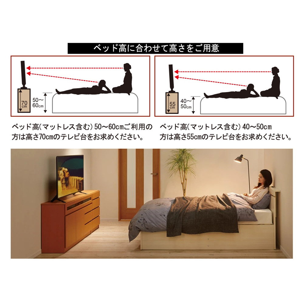 寝室がシアタールームへ。誰にも邪魔されずにテレビや映画の時間が満喫できる薄型テレビ台シリーズです。テレビ台としてだけでなく寝室収納としても使える収納力も自慢の、組立不要なテレビ台。2台目用としてもおすすめです。Point1 なんと本体奥行35cm!置き場所を選ばない省スペース・薄型設計。◆奥行35cmの薄型設計と、ベッドに寝ても座っても大迫力のシアター気分が味わえる絶妙な高さ設計で、寝室にもぴったり。 リビングに置いてお部屋を広く見せても。◆最新の薄型テレビにぴったりの本体奥行35cm。◆幅105cmのテレビ台は、37〜40インチのテレビまでバランス良く収まります。 ※サイズはあくまで目安です。各社メーカーによってサイズが異なりますので、ご確認ください。◆AV機器収納部はガラス扉なので、閉じたままデッキ操作が可能です。◆扉付なのでほこりを寄せ付けないのも嬉しいポイント。◆扉内の可動棚は3cm間隔で7段階に調整可能。収納物の大きさに合わせて調整できます。Point2 高さは2タイプご用意。◆ベッドの高さに合わせて、高さを2サイズ(55cm、70cm)ご用意。◆目安としては、ベッド高(マットレス含む)40〜50cmご利用の方は高さ55cmの商品を ベッド高(マットレス含む)50〜60cmご利用の型は高さ70cmの商品をご購入いただくとちょうど良いです。◆リビングでご利用頂く場合の目安は、高さ55cmはソファからテレビを見るのにちょうど良い高さ、高さ70cmはダイニングからテレビを見るのにちょうど良い高さになります。Point3 造りもしっかり、安心の国産家具◆日本の家具職人が、一点一点心を込めて丁寧に仕上げております。◆届いたらすぐに使える完成品なのも嬉しいポイント。※扉のプッシュラッチの取付(差し込みのみ)はお客様にてお願いしております。◆お求めやすい価格帯なので、新生活や二台目用としてもおすすめです。