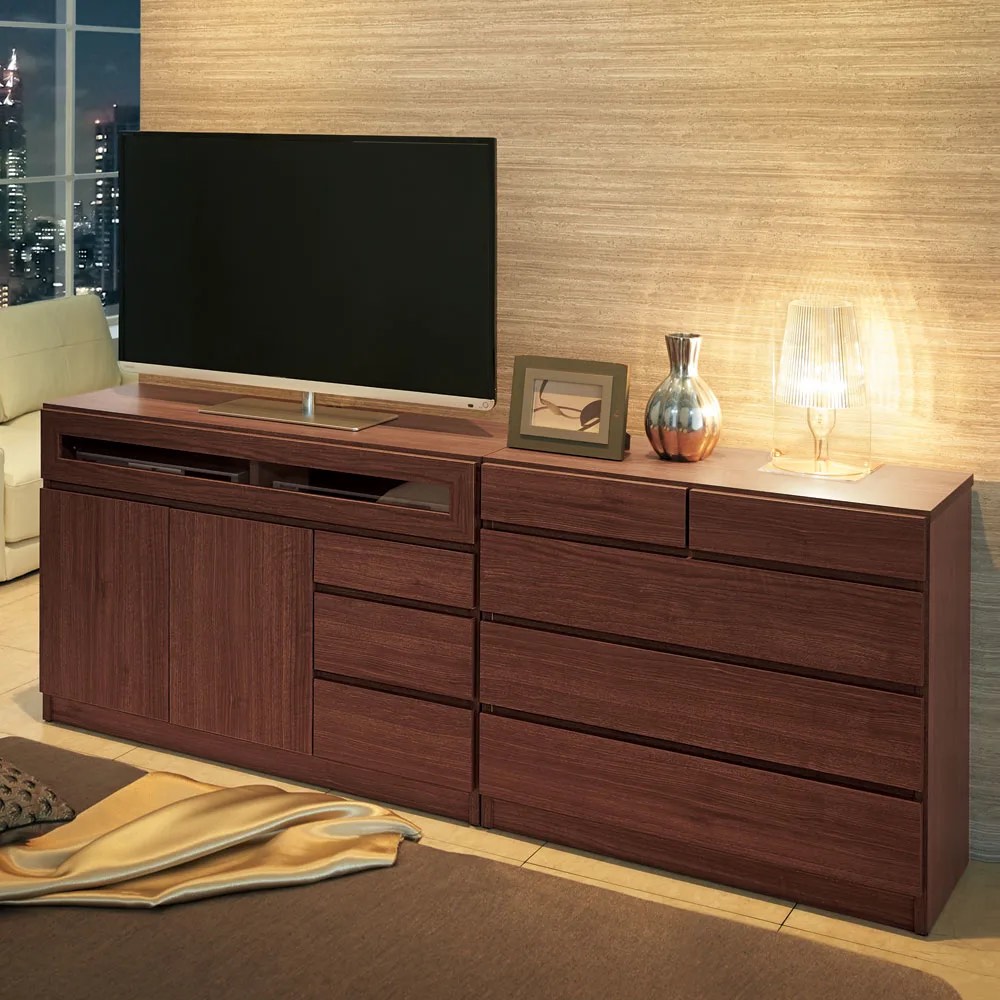 使用イメージ(エ)ブラウン 寝室がホームシアターに。眠るまでのひととき、ゆったりと好きな映画が楽しめます。 ※写真左から別売りのチェスト幅80cm高さ70cmタイプ、テレビ台・幅150cm高さ70cmタイプです。