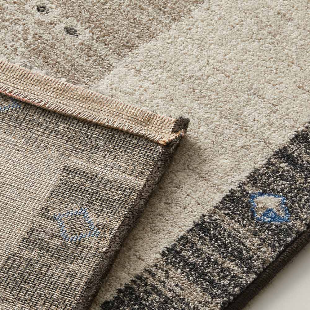遊牧民が使う手織りのニュアンスを活かしたギャベ風デザインに明るい配色。豊富なサイズ展開とデザインも、ナチュラルモダンな演出に大活躍。ニュアンスのある表現やミックス感がやさしさを感じさせるラグ。柔らかな触感も大きな魅力のラグです。牧歌的な手織りのニュアンスを活かしたギャッベ風デザイン。毛足9mmのヒートセット加工を施された表面は柔らかく、さらりとした肌触りです。サイズ展開が豊富なので、スペースに合わせてお選びください。【素材】 ポリプロピレンは耐久性に優れた軽い素材で、吸湿性がないので濡れても乾きやすく、その分お手入れがしやすい素材です。着色する場合は原料から染色するので堅牢度に優れ色落ちしにくいという特性も持っています。また他の素材に比べて遊び毛がほとんど出ないのも特徴です。 【打込み数】織りの密度を表すもので一般的には1平方メートルあたりにどれくらいの織り目があるかをノット数という単位であらわします。ノット数が多ければ多いほど高密度になり耐久性と重厚感がでるだけでなく、繊細な絵柄を表現することもできるようになり、一般的には価格も高くなります。【ウィルトン織り】18世紀中期に英国ウイルトン市で始まった機械織りの製法のことを言います。下糸にパイル糸を絡み合わせてつくる織物なので、下生地に糸を貼り付けるタフト製法のものよりも耐久性に優れ、汚れにも強いという特性を持っています。そもそもヨーロッパでは靴で上を歩くことを前提で作られているわけですから日常使いには十分な強度持っていると言えます。