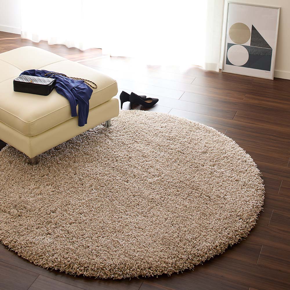 50mmの長い毛足と太さの違うツイスト糸で高密度に仕上げました。インテリアを贅沢に演出する幸せシャギーラグです。●ウィルトン織とは18世紀中期・イギリスのウィルトン市で発祥した機械織りのラグ。特徴としては、【1】自由な表現力と高いデザイン性無地・柄ラグ共にパイルの長さを自由に変えることができることであらゆる表現力を持ち、デザイン性の高いラグを作ることができます。【2】頑丈なつくりで、耐久性がある表面のパイル糸以外に、地径糸(じだていと)・覆糸(おおいいと)・緯糸(よこいと)の4種類の糸を、織りこんで作ってあります。表面のパイル糸が下糸に直接絡み合わせて織り込んであるるために、パイルが抜けにくく、しっかりとした耐久性に優れた仕上がりになっています。●50mmの毛足がリッチ太・細の太さの違うツイスト糸をミックスしたシャギーラグ。毛足50mm、全厚55mmのふっくらボリュームタイプで、ずっと澤って居たくなるような高密度の踏み心地です。●耐久性に優れたポリプロピレン100%ポリプロピレンは軽くて耐久性に優れ、湿気を取り込みにくく、汚れが付きにくいのが特長。濡れても乾きやすく、他の素材に比べて遊び毛がほとんど出ないので、お手入れがしやすい素材です。着色する場合は原料から染色するので堅牢度に優れ、色落ちしにくいという特性もあります。
