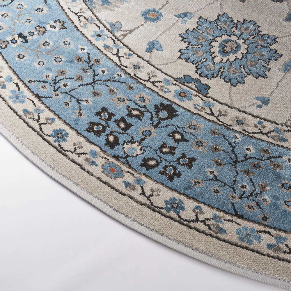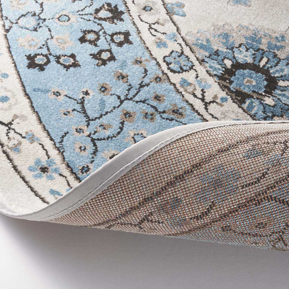 遊び毛が出にくい加工が施され、毛足約5mmの薄さで表面はサラッと軽やか。美しいブルーが効いて印象的です。
