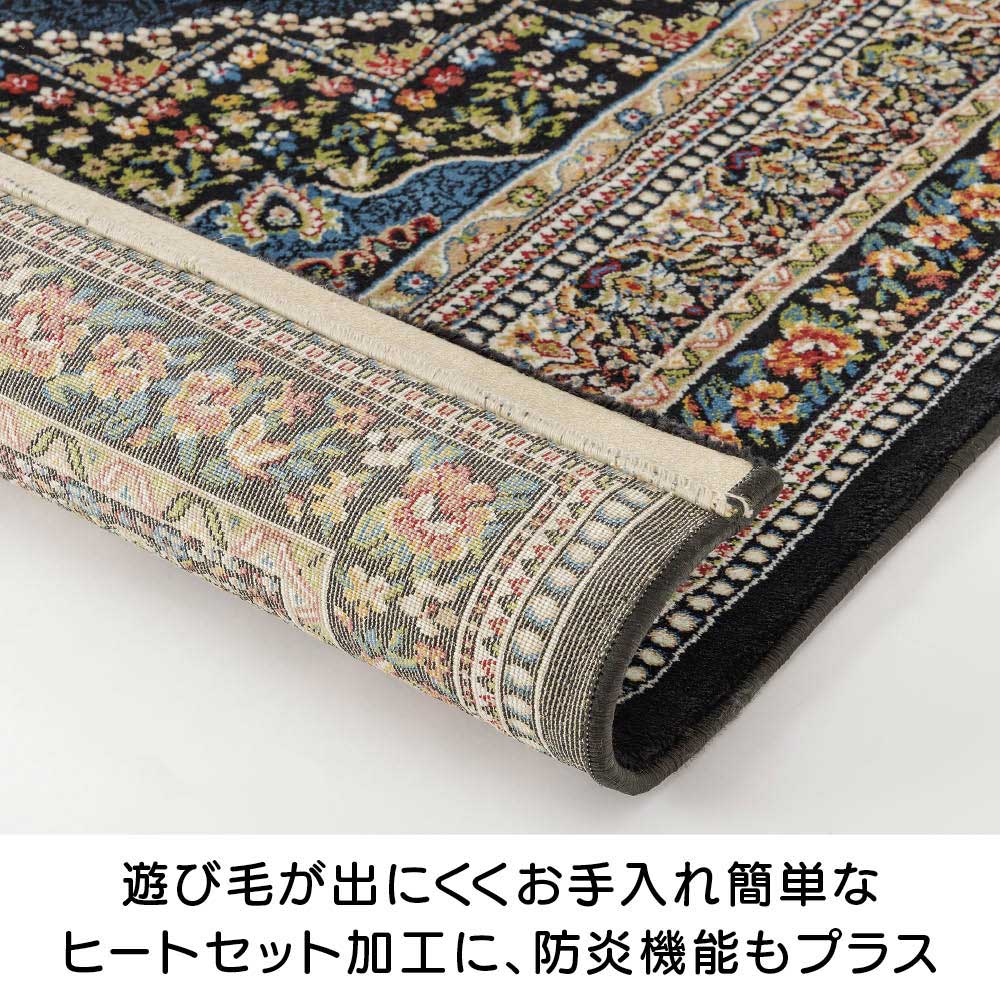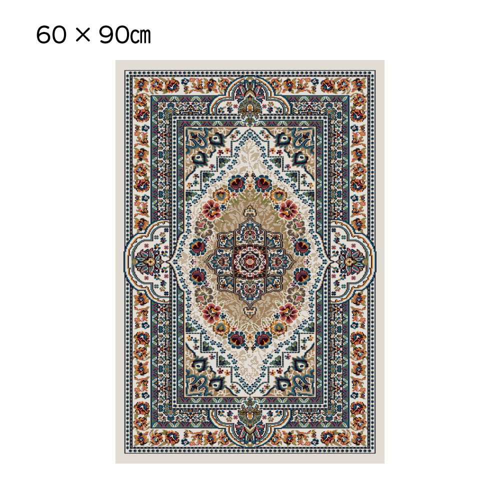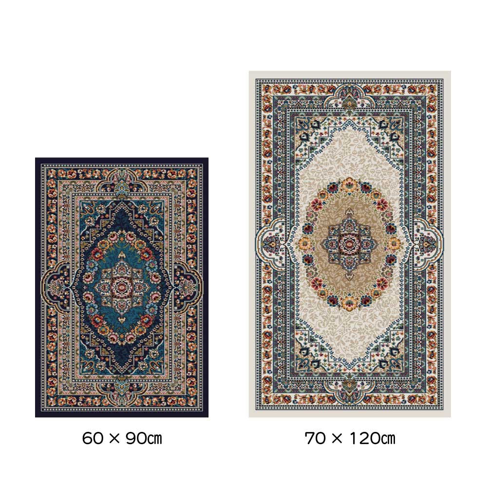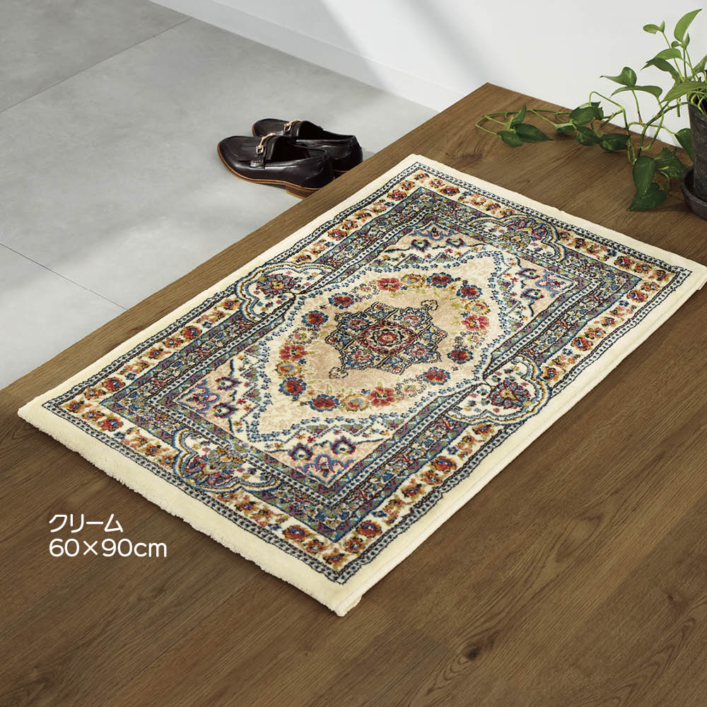 ボタニカルモチーフと発色が美しいエジプト製のウィルトン織マットです。ペルシャ絨毯のクラシックなメダリオン柄をベースに、現代のインテリアに調和するようアレンジしました。しっとりとした上質な踏み心地で、玄関やベッドサイドなどにぴったり。遊び毛の出にくい加工や防炎機能付きで長く安心してお使いいただけます。優美な柄とやさしい踏み心地で寝室を癒しの空間にベッドサイドに上質な心地よさをプラス。繊細な柄としっとりとした踏み心地が、一日の始まりと終わりにやすらぎをもたらします。(写真は(ア)ブルー 70×120cm)お客さまを迎える玄関に、華やぎを添える一枚。コンパクトながら存在感があり、上質なエジプト製ウィルトン織ならではの気品でスペースを格上げしてくれます。鮮やかな発色と奥行き感が魅力のクラシカルブルー。発色の良い色糸を重ねることで繊細な模様が際立ち、クラシックでありながら洗練された印象を演出します。気品と温かみが共存するエレガントなクリーム。空間に明るさをもたらし、繊細な柄のニュアンスとともに優美で洗練された雰囲気を演出します。マットは、2種類のサイズをご用意。玄関や寝室など小さなスペースにも取り入れやすく、シーンに合わせて上質な雰囲気を演出します。